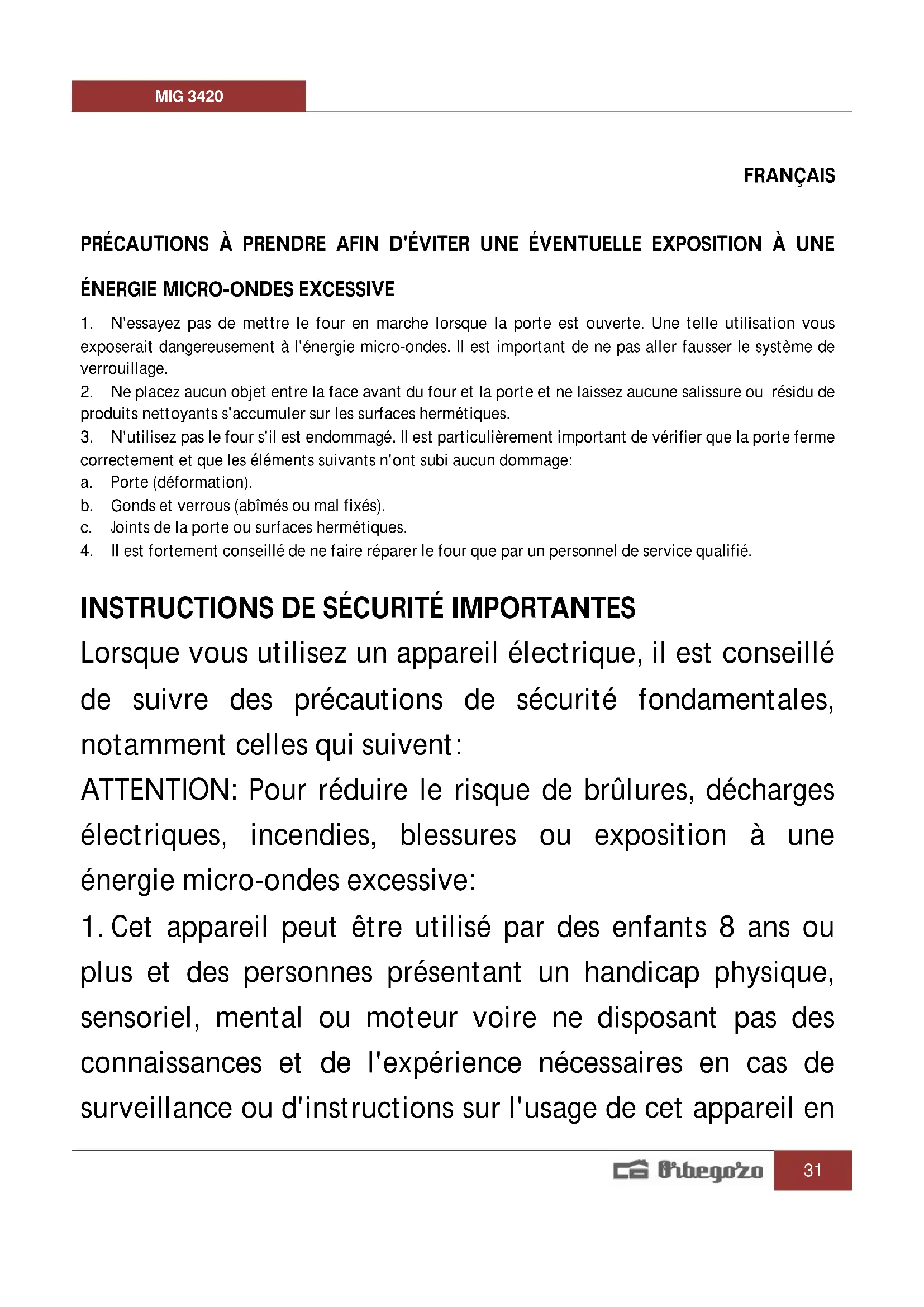 MIG 3420 - Four à micro-ondes Orbegozo - Notice d'utilisation et mode d'emploi gratuit