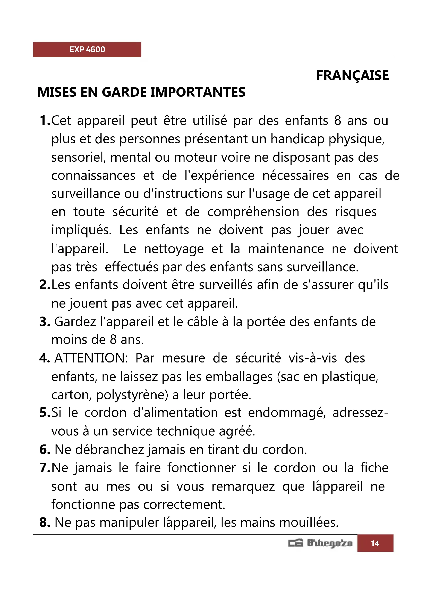 8. Ne pas manipuler l´appareil, les mains mouillées.EXP 4600