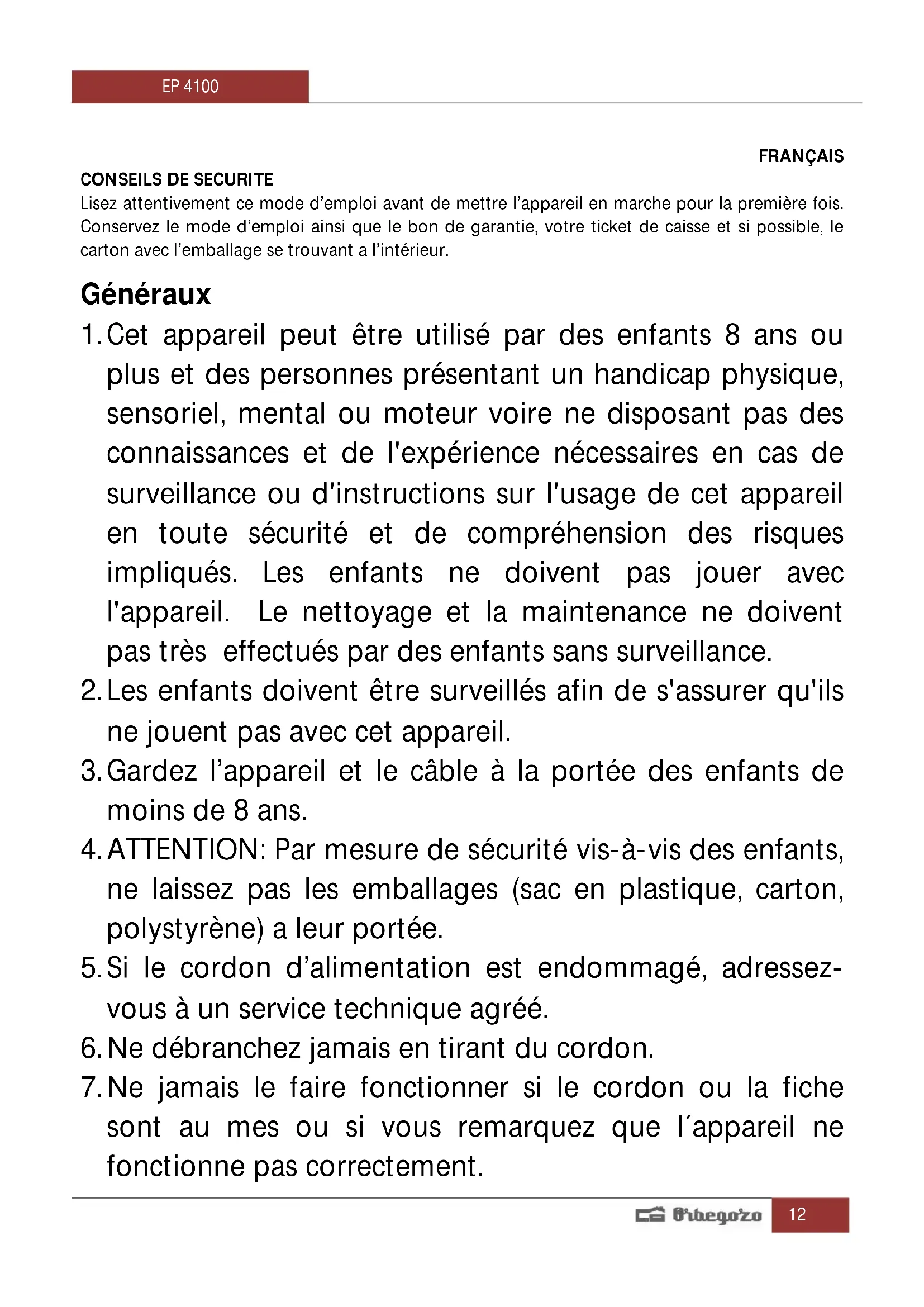 MODE D'EMPLOI EP 4100 Orbegozo