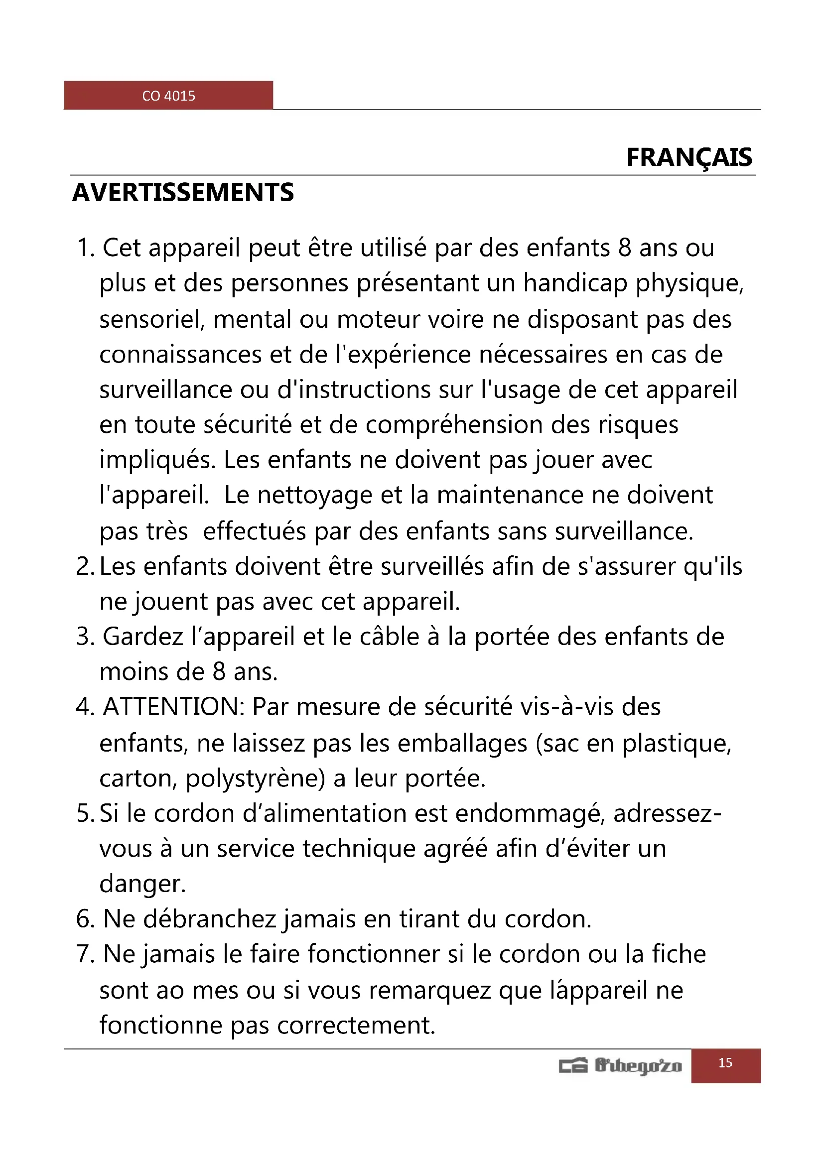 Retrouvez gratuitement la notice de l'appareil CO 4015 Orbegozo au format PDF.