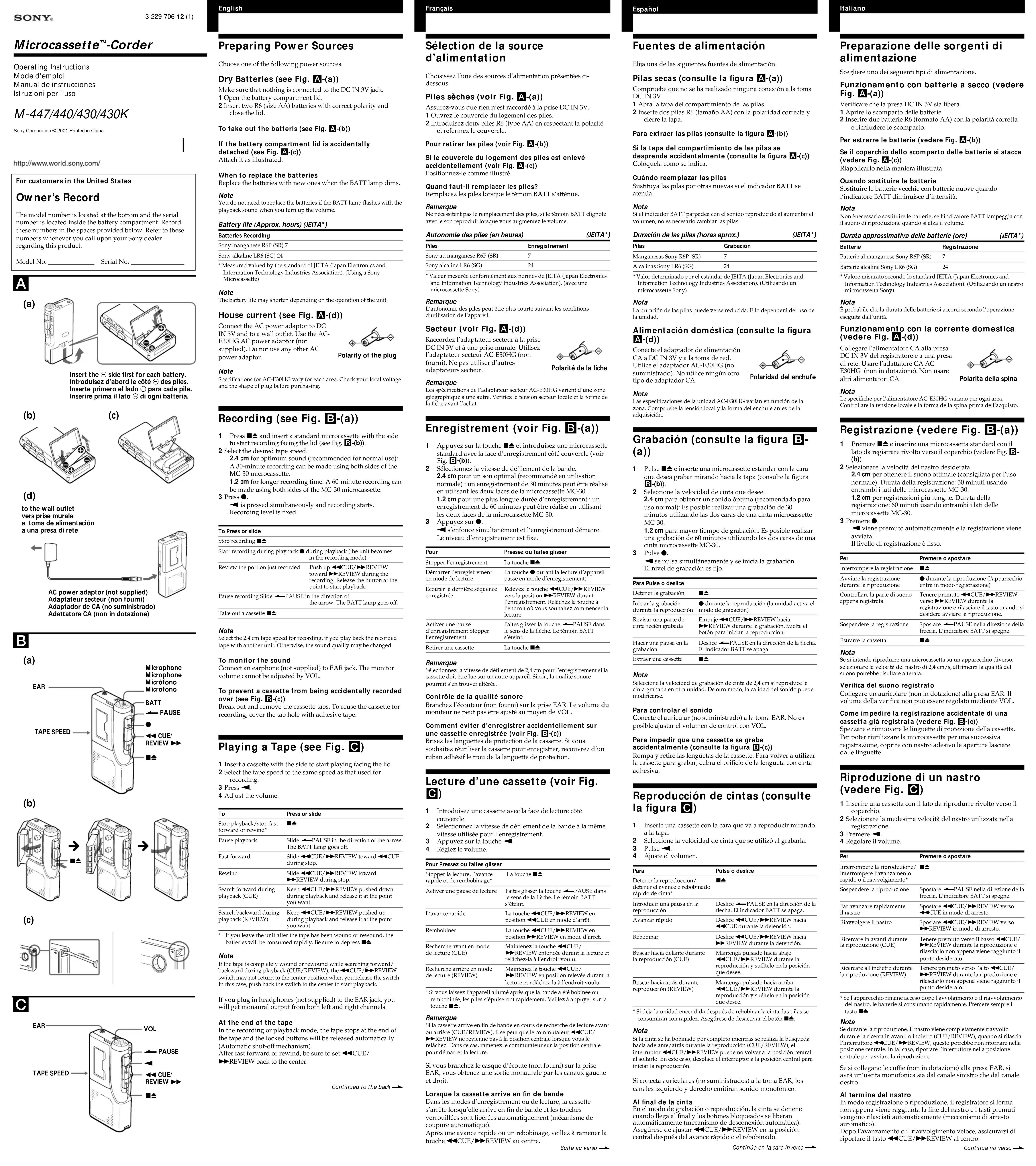 - Si l’appareil n’a pas été utilisé pendant une période prolongée, placez-le en mode lecture et laissez-le se réchauffer pendant quelques minutes avant d’introduire une cassette. Si vous avez des questions ou des difficultés au sujet de cet appareil, consultez votre distributeur Sony. Dépannage Si les problèmes persistent après ces contrôles, consultez votre distributeur Sony. Impossibilité d’introduire une cassette. t La cassette est présentée dans le mauvais sens. t La touche n a déjà été enfoncée. Impossible de démarrer la lecture. t La cassette est arrivée en fin de bande. Rembobinez la cassette. t Les piles sont plates. Remplacez les deux piles. t La tête est sale. Impossibilité d’enregistrer. t Il n’y a pas de cassette dans le support de cassette. t Les languettes de protection de la cassette ont été brisées. t Les piles sont plates. Remplacez les deux piles. t La tête est sale. En cours de CUE/REVIEW, la bande magnétique s’arrête ou ne défile pas. Impossible de rembobiner ou d’avancer rapidement. t Les piles sont plates. Remplacez les deux piles. L’appareil ne fonctionne pas. t La polarité des piles n’a pas été respectée. t Les piles sont plates. Remplacez les deux piles. t La touche >PAUSE est placée dans le sens de la flèche. t L’adaptateur secteur est raccordé à l’appareil et vous avez l’intention de faire fonctionner l’appareil sur les piles. Le haut-parleur ne diffuse aucun son. t Les écouteurs sont branchés. t Le volume est réglé au minimum. Le son baisse ou est accompagné de parasites excessifs. t Le volume est réglé au minimum. t Les piles sont plates. Remplacez les deux piles. t La tête est sale. Voir “Entretien”. La vitesse de défilement de la bande est excessive ou insuffisante en mode lecture. t Le commutateur TAPE SPEED n’est pas correctement réglé. Réglez-le à la même vitesse que pour l’enregistrement. Impossibilité d’effacer au complet l’enregistrement. t La tête est sale. Entretien (voir Fig. E) Nettoyage de la tête et des guides de la bande Appuyez sur la touche n et nettoyez la tête 1, le cabestan 2 et le galet presseur 3 toutes les 10 heures de fonctionnement à l’aide d’un coton-tige imbibé d’alcool. Nettoyage des parties extérieures Utilisez un linge légèrement imprégné d’eau. N’utilisez pas d’alcool, d’essence ou de diluant. Spécifications Cassette (type position normale)Système d’enregistrement2 pistes 1 bande monauraleHaut-parleurEnv. 3,6 cm (1 ⁄16 pouces) diam.Vitesse de défilement de la bande2,4 cm ( ⁄16 pouces)/s, 1,2 cm ( ⁄32 pouces)/sPlage de fréquence300 - 4.000 Hz (avec le commutateur TAPE SPEED réglé sur 2,4 cm/s)SortiePrise écouteurs (miniprise) pour écouteurs 8 - 300 ohmsPuissance de sortie (à 10 % de distorsion harmonique)160 mWPuissance de raccordementPiles 3 V CC R6 (type AA) × 2/Sources d’alimentation 3 V CCexternesDimensions (l x h x p)Approx. 62,2 × 121,5 × 24,3 mm (2 ⁄2 × 4 ⁄8 × ⁄32 pouces), saillies etcommandes comprisesPoidsApprox. 125 g (4,5 onces)Accessoires fournisMicrocassette MC-30 (1) (M-430K pour les Etats-Unis seulement)Microcassette MC-30 (2) (M-430 pour le Canada uniquement)Microcassette MC-60 (6) (M-447 pour les Etats-Unis seulement)Piles alcalines LR6 (2) (M-430 pour le Canada et M-447/430K pour lesEtats-Unis seulement)La conception et les spécifications sont sujettes à modifications sanspréavis. Precauciones Acerca de la alimentación