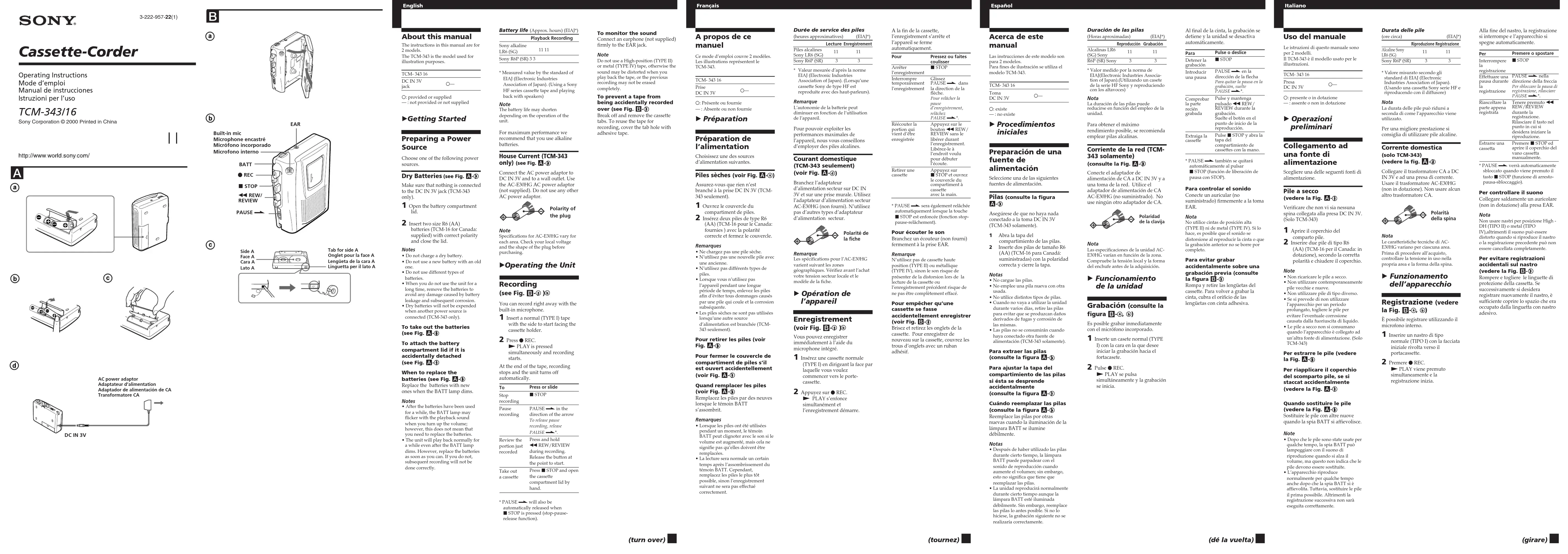 Branchez l’adaptateurd’alimentation secteur sur DC IN3V et sur une prise murale. Utilisezl’adaptateur d’alimentation secteurAC-E30HG (non fourni). N’utilisezpas d’autres types d’adaptateurd’alimentation secteur.RemarqueLes spécifications pour l’AC-E30HGvarient suivant les zonesgéographiques. Vérifiez avant l’achatvotre tension secteur locale et lemodèle de la fiche. B Opération de l’appareil Enregistrement (voir Fig. B- , )Vous pouvez enregistrerimmédiatement à l’aide dumicrophone intégré. 1 Insérez une cassette normale (TYPE I) en dirigeant la face parlaquelle vous voulezcommencer vers le porte-cassette. 2 Appuyez sur z REC. N PLAY s’enfoncesimultanément etl’enregistrement démarre.Polarité dela fiche Pour Arrêterl’enregistrementInterrompretemporairementl’enregistrementRéécouter laportion quivient d’êtreenregistréeRetirer unecassettePressez ou faitescoulisserx STOPGlissezPAUSE . dansla direction de laflèche.Pour relâcher lapaused’enregistrement,relâchezPAUSE .*.Appuyez sur lebouton m REW/REVIEW sans lelibérer durantl’enregistrement.Libérez-le àl’endroit voulupour débuterl’écoute.Appuyez surx STOP et ouvrezle couvercle ducompartiment àcassetteavec la main.(tournez)* PAUSE . sera également relâchéeautomatiquement lorsque la touchex STOP est enfoncée (fonction stop-pause-relâchement).Pour écouter le sonBranchez un écouteur (non fourni)fermement à la prise EAR.RemarqueN’utilisez pas de cassette hauteposition (TYPE II) ou métallique(TYPE IV), sinon le son risque deprésenter de la distorsion lors de lalecture de la cassette oul’enregistrement précédent risque dene pas être complètement effacé.Pour empêcher qu’unecassette se fasseaccidentellement enregistrer(voir Fig. B- )Brisez et retirez les onglets de lacassette. Pour enregistrer denouveau sur la cassette, couvrez lestrous d’onglets avec un rubanadhésif.Italiano Uso del manuale Le istruzioni di questo manuale sonoper 2 modelli.Il TCM-343 è il modello usato per leillustrazioni.TCM- 343 16PresaDC IN 3Va —a : presente o in dotazione— : assente o non in dotazione B Operazioni preliminari Collegamento ad una fonte di alimentazione Scegliere una delle seguenti fonti dialimentazione.Pile a secco(vedere la Fig. A- )Verificare che non vi sia nessunaspina collegata alla presa DC IN 3V.(Solo TCM-343) 1 Aprire il coperchio del comparto pile. 2 Inserire due pile di tipo R6 (AA) (TCM-16 per il Canada: indotazione), secondo la correttapolarità e chiudere il coperchio. Note