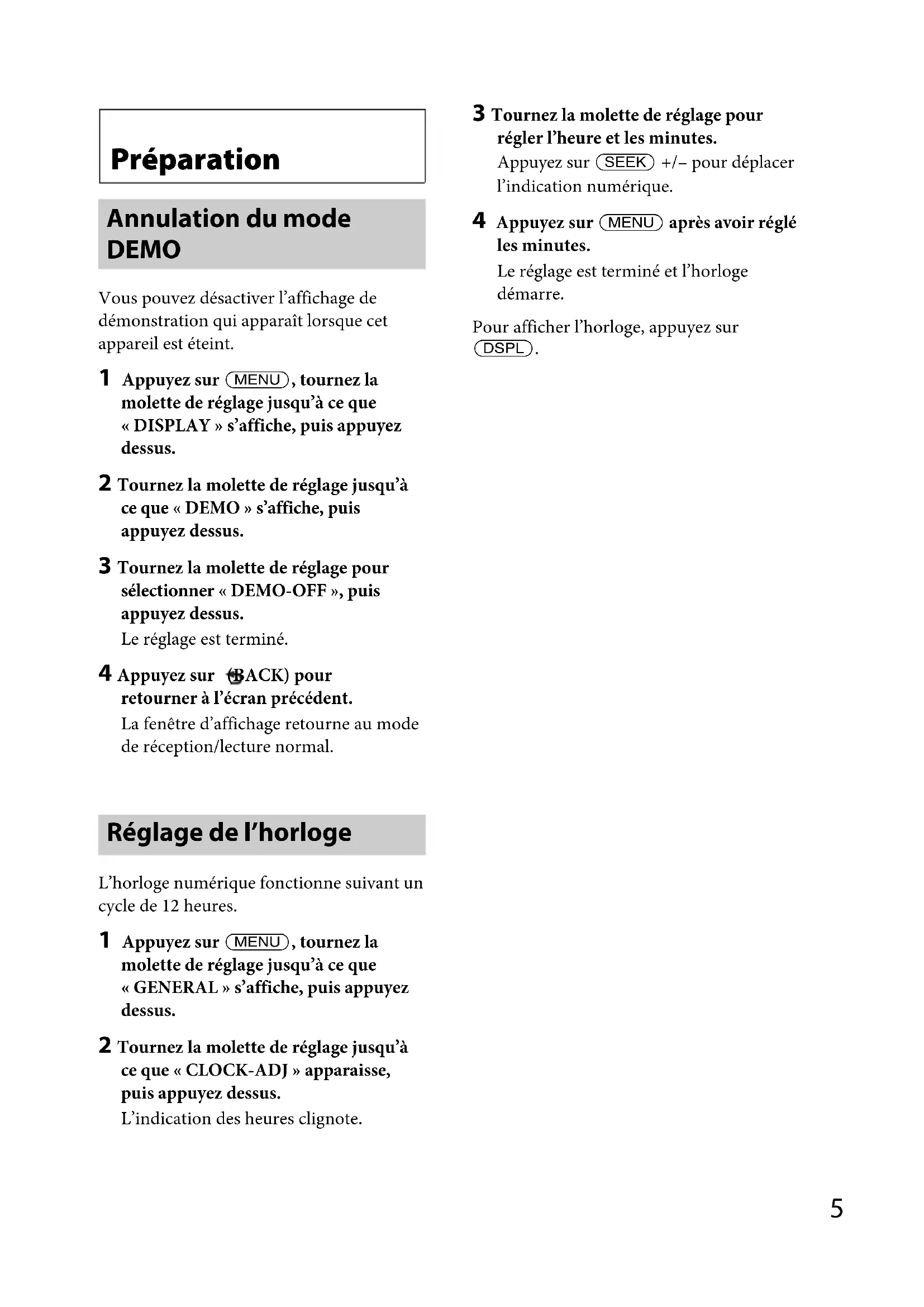 - Dépannage Préparation Annulation du mode DEMO Vous pouvez désactiver l’affichage de démonstration qui apparaît lorsque cet appareil est éteint. 1 Appuyez sur , tournez la molette de réglage jusqu’à ce que « DISPLAY » s’affiche, puis appuyez dessus. 2 Tournez la molette de réglage jusqu’à ce que « DEMO » s’affiche, puis appuyez dessus. 3 Tournez la molette de réglage pour sélectionner « DEMO-OFF », puis appuyez dessus. Le réglage est terminé. 4 Appuyez sur (BACK) pour retourner à l’écran précédent. La fenêtre d’affichage retourne au mode de réception/lecture normal. Réglage de l’horloge L’horloge numérique fonctionne suivant un cycle de 12 heures. 1 Appuyez sur , tournez la molette de réglage jusqu’à ce que « GENERAL » s’affiche, puis appuyez dessus. 2 Tournez la molette de réglage jusqu’à ce que « CLOCK-ADJ » apparaisse, puis appuyez dessus. L’indication des heures clignote. 3 Tournez la molette de réglage pour régler l’heure et les minutes. Appuyez sur +/– pour déplacer l’indication numérique. 4 Appuyez sur après avoir réglé les minutes. Le réglage est terminé et l’horloge démarre. Pour afficher l’horloge, appuyez sur p. 345