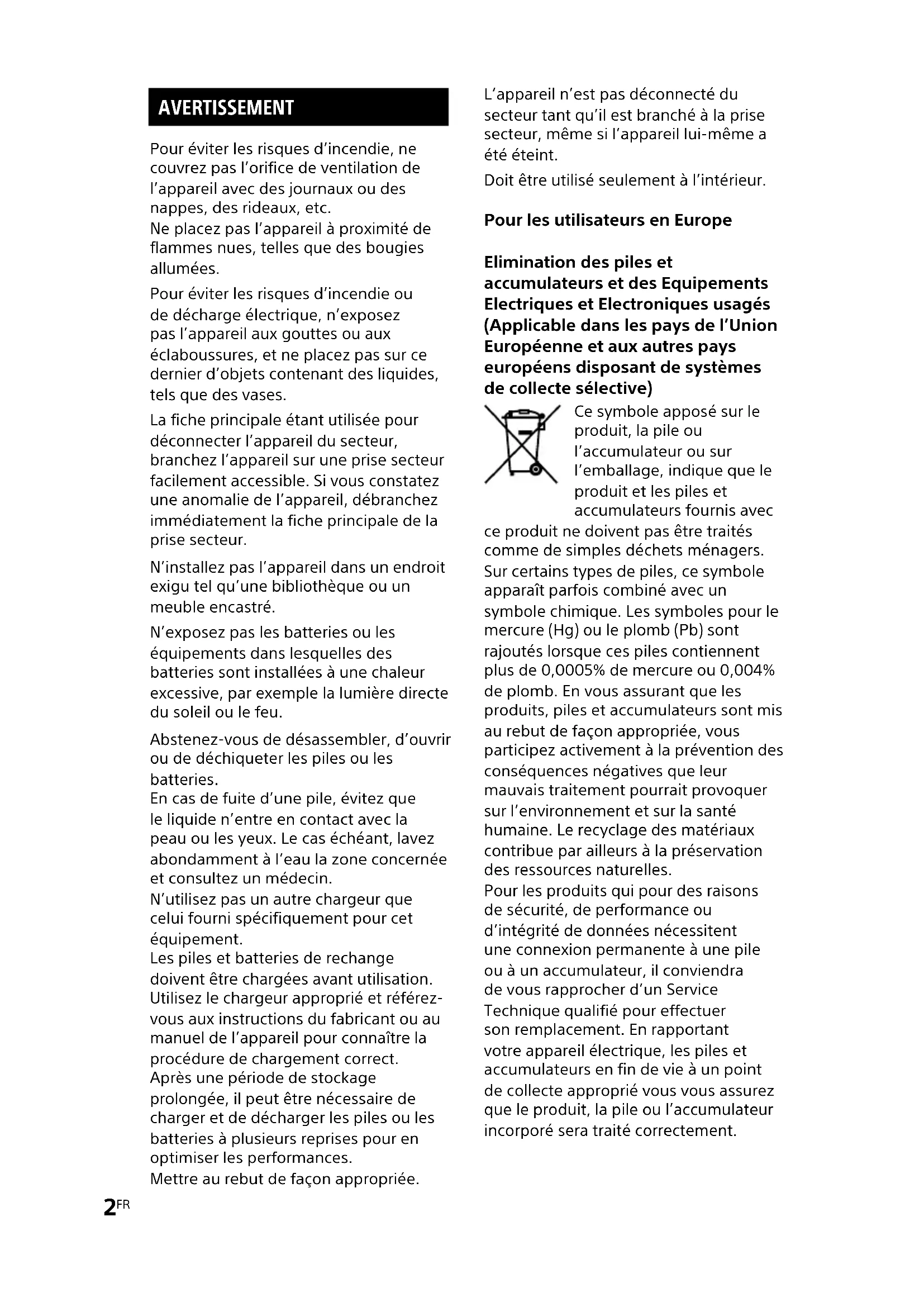 GTK-XB60/XB90.4-697-227-31(1) AVERTISSEMENT Pour éviter les risques d’incendie, ne couvrez pas l’orifice de ventilation de l’appareil avec des journaux ou des nappes, des rideaux, etc. Ne placez pas l’appareil à proximité de flammes nues, telles que des bougies allumées. Pour éviter les risques d’incendie ou de décharge électrique, n’exposez pas l’appareil aux gouttes ou aux éclaboussures, et ne placez pas sur ce dernier d’objets contenant des liquides, tels que des vases. La fiche principale étant utilisée pour déconnecter l’appareil du secteur, branchez l’appareil sur une prise secteur facilement accessible. Si vous constatez une anomalie de l’appareil, débranchez immédiatement la fiche principale de la prise secteur. N’installez pas l’appareil dans un endroit exigu tel qu’une bibliothèque ou un meuble encastré. N’exposez pas les batteries ou les équipements dans lesquelles des batteries sont installées à une chaleur excessive, par exemple la lumière directe du soleil ou le feu. Abstenez-vous de désassembler, d’ouvrir ou de déchiqueter les piles ou les batteries. En cas de fuite d’une pile, évitez que le liquide n’entre en contact avec la peau ou les yeux. Le cas échéant, lavez abondamment à l’eau la zone concernée et consultez un médecin. N’utilisez pas un autre chargeur que celui fourni spécifiquement pour cet équipement. Les piles et batteries de rechange doivent être chargées avant utilisation. Utilisez le chargeur approprié et référez- vous aux instructions du fabricant ou au manuel de l’appareil pour connaître la procédure de chargement correct. Après une période de stockage prolongée, il peut être nécessaire de charger et de décharger les piles ou les batteries à plusieurs reprises pour en optimiser les performances. Mettre au rebut de façon appropriée. L’appareil n’est pas déconnecté du secteur tant qu’il est branché à la prise secteur, même si l’appareil lui-même a été éteint. Doit être utilisé seulement à l’intérieur. Pour les utilisateurs en Europe Elimination des piles et accumulateurs et des Equipements Electriques et Electroniques usagés (Applicable dans les pays de l’Union Européenne et aux autres pays européens disposant de systèmes de collecte sélective) Ce symbole apposé sur le produit, la pile ou l’accumulateur ou sur l’emballage, indique que le produit et les piles et accumulateurs fournis avec ce produit ne doivent pas être traités comme de simples déchets ménagers. Sur certains types de piles, ce symbole apparaît parfois combiné avec un symbole chimique. Les symboles pour le mercure (Hg) ou le plomb (Pb) sont rajoutés lorsque ces piles contiennent plus de 0,0005% de mercure ou 0,004% de plomb. En vous assurant que les produits, piles et accumulateurs sont mis au rebut de façon appropriée, vous participez activement à la prévention des conséquences négatives que leur mauvais traitement pourrait provoquer sur l’environnement et sur la santé humaine. Le recyclage des matériaux contribue par ailleurs à la préservation des ressources naturelles. Pour les produits qui pour des raisons de sécurité, de performance ou d’intégrité de données nécessitent une connexion permanente à une pile ou à un accumulateur, il conviendra de vous rapprocher d’un Service Technique qualifié pour effectuer son remplacement. En rapportant votre appareil électrique, les piles et accumulateurs en fin de vie à un point de collecte approprié vous vous assurez que le produit, la pile ou l’accumulateur incorporé sera traité correctement.3
