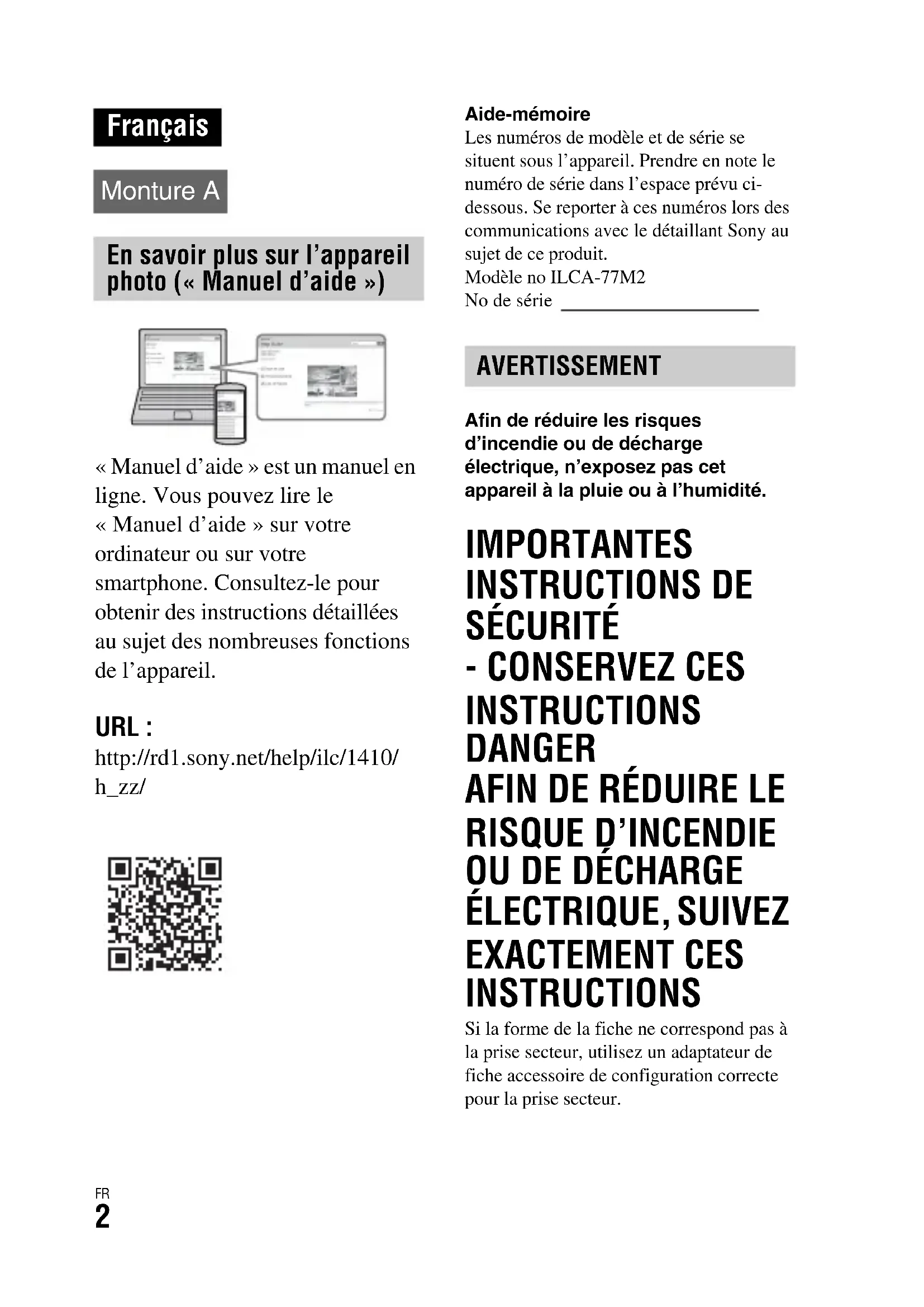 « Manuel d’aide » est un manuel en ligne. Vous pouvez lire le « Manuel d’aide » sur votre ordinateur ou sur votre smartphone. Consultez-le pour obtenir des instructions détaillées au sujet des nombreuses fonctions de l’appareil. URL : http://rd1.sony.net/help/ilc/1410/ h_zz/ Aide-mémoireLes numéros de modèle et de série se situent sous l’appareil. Prendre en note le numéro de série dans l’espace prévu ci-dessous. Se reporter à ces numéros lors des communications avec le détaillant Sony au sujet de ce produit.Modèle no ILCA-77M2No de série Afin de réduire les risques d’incendie ou de décharge électrique, n’exposez pas cet appareil à la pluie ou à l’humidité. IMPORTANTES INSTRUCTIONS DE SÉCURITÉ - CONSERVEZ CES INSTRUCTIONS DANGER