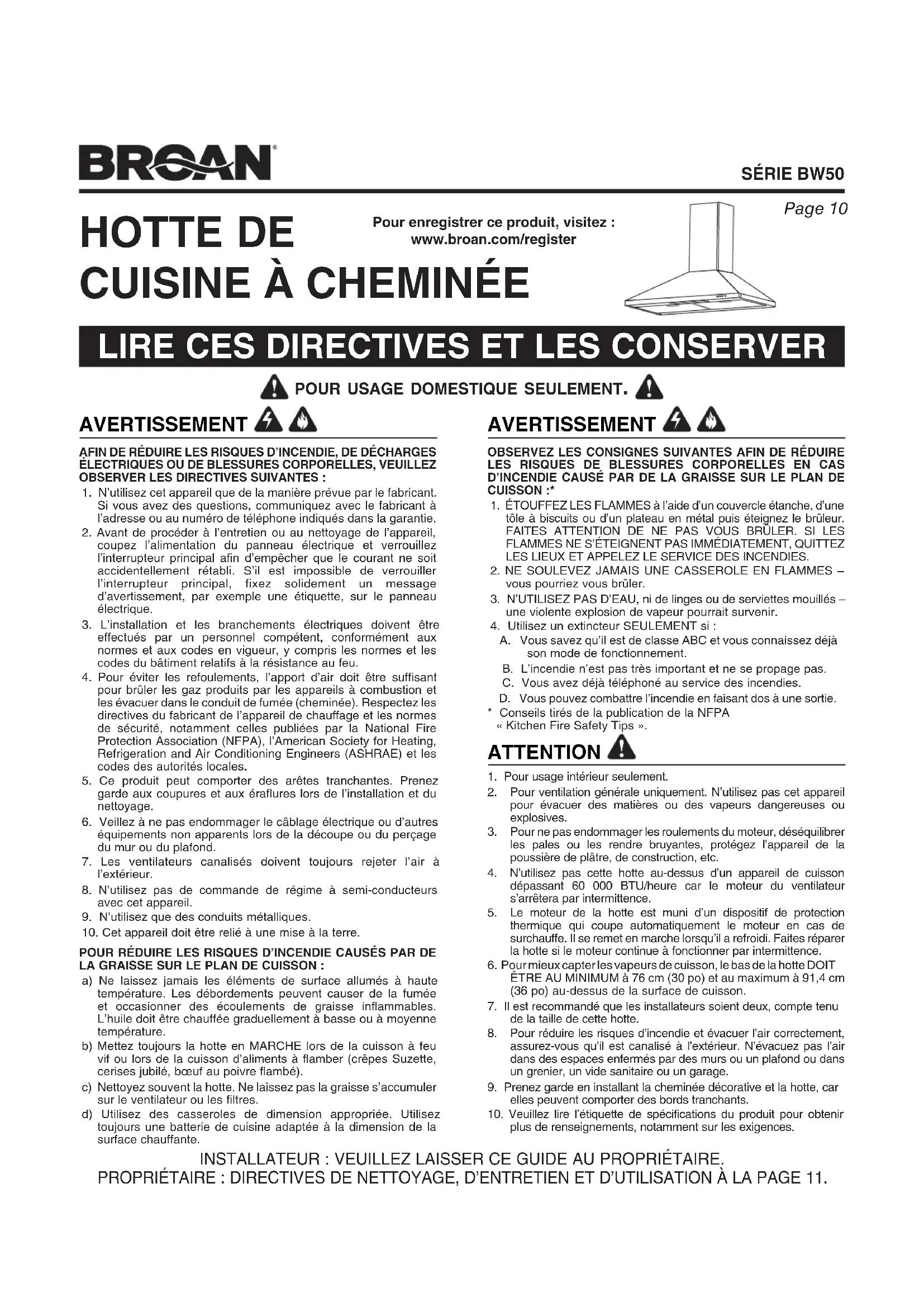 AFIN DE RÉDUIRE LES RISQUES D’INCENDIE, DE DÉCHARGES ÉLECTRIQUES OU DE BLESSURES CORPORELLES, VEUILLEZ OBSERVER LES DIRECTIVES SUIVANTES :1. N’utilisez cet appareil que de la manière prévue par le fabricant. Si vous avez des questions, communiquez avec le fabricant à l’adresse ou au numéro de téléphone indiqués dans la garantie.2. Avant de procéder à l’entretien ou au nettoyage de l’appareil, coupez l’alimentation du panneau électrique et verrouillez l’interrupteur principal afin d’empêcher que le courant ne soit accidentellement rétabli. S’il est impossible de verrouiller l’interrupteur principal, fixez solidement un message d’avertissement, par exemple une étiquette, sur le panneau électrique.3. L’installation et les branchements électriques doivent être effectués par un personnel compétent, conformément aux normes et aux codes en vigueur, y compris les normes et les codes du bâtiment relatifs à la résistance au feu.4. Pour éviter les refoulements, l’apport d’air doit être suffisant pour brûler les gaz produits par les appareils à combustion et les évacuer dans le conduit de fumée (cheminée). Respectez les directives du fabricant de l’appareil de chauffage et les normes de sécurité, notamment celles publiées par la National Fire Protection Association (NFPA), l’American Society for Heating, Refrigeration and Air Conditioning Engineers (ASHRAE) et les codes des autorités locales.5. Ce produit peut comporter des arêtes tranchantes. Prenez garde aux coupures et aux éraflures lors de l’installation et du nettoyage.6. Veillez à ne pas endommager le câblage électrique ou d’autres équipements non apparents lors de la découpe ou du perçage du mur ou du plafond.7. Les ventilateurs canalisés doivent toujours rejeter l’air à l’extérieur.8. N’utilisez pas de commande de régime à semi-conducteurs avec cet appareil.9. N’utilisez que des conduits métalliques.10. Cet appareil doit être relié à une mise à la terre.POUR RÉDUIRE LES RISQUES D’INCENDIE CAUSÉS PAR DE LA GRAISSE SUR LE PLAN DE CUISSON :a) Ne laissez jamais les éléments de surface allumés à haute température. Les débordements peuvent causer de la fumée et occasionner des écoulements de graisse inflammables. L’huile doit être chauffée graduellement à basse ou à moyenne température.b) Mettez toujours la hotte en MARCHE lors de la cuisson à feu vif ou lors de la cuisson d’aliments à flamber (crêpes Suzette, cerises jubilé, bœuf au poivre flambé). c) Nettoyez souvent la hotte. Ne laissez pas la graisse s’accumuler sur le ventilateur ou les filtres.d) Utilisez des casseroles de dimension appropriée. Utilisez toujours une batterie de cuisine adaptée à la dimension de la surface chauffante. AVERTISSEMENT OBSERVEZ LES CONSIGNES SUIVANTES AFIN DE RÉDUIRE LES RISQUES DE BLESSURES CORPORELLES EN CAS D’INCENDIE CAUSÉ PAR DE LA GRAISSE SUR LE PLAN DE CUISSON :*1. ÉTOUFFEZ LES FLAMMES à l’aide d’un couvercle étanche, d’une tôle à biscuits ou d’un plateau en métal puis éteignez le brûleur. FAITES ATTENTION DE NE PAS VOUS BRÛLER. SI LES FLAMMES NE S’ÉTEIGNENT PAS IMMÉDIATEMENT, QUITTEZ LES LIEUX ET APPELEZ LE SERVICE DES INCENDIES.2. NE SOULEVEZ JAMAIS UNE CASSEROLE EN FLAMMES – vous pourriez vous brûler.3. N’UTILISEZ PAS D’EAU, ni de linges ou de serviettes mouillés– une violente explosion de vapeur pourrait survenir.4. Utilisez un extincteur SEULEMENT si : A. Vous savez qu’il est de classe ABC et vous connaissez déjà son mode de fonctionnement. B. L’incendie n’est pas très important et ne se propage pas. C. Vous avez déjà téléphoné au service des incendies. D. Vous pouvez combattre l’incendie en faisant dos à une sortie.* Conseils tirés de la publication de la NFPA «KitchenFireSafetyTips ». ATTENTION 1. Pour usage intérieur seulement.2. Pour ventilation générale uniquement. N’utilisez pas cet appareil pour évacuer des matières ou des vapeurs dangereuses ou explosives.3. Pour ne pas endommager les roulements du moteur, déséquilibrer les pales ou les rendre bruyantes, protégez l’appareil de la poussière de plâtre, de construction, etc.4. N’utilisez pas cette hotte au-dessus d’un appareil de cuisson dépassant 60 000 BTU/heure car le moteur du ventilateur s’arrêtera par intermittence.5. Le moteur de la hotte est muni d’un dispositif de protection thermique qui coupe automatiquement le moteur en cas de surchauffe. Il se remet en marche lorsqu’il a refroidi. Faites réparer la hotte si le moteur continue à fonctionner par intermittence.6. Pour mieux capter les vapeurs de cuisson, le bas de la hotte DOIT ÊTRE AU MINIMUM à 76 cm (30 po) et au maximum à 91,4 cm (36 po) au-dessus de la surface de cuisson.7. Il est recommandé que les installateurs soient deux, compte tenu de la taille de cette hotte.8. Pour réduire les risques d’incendie et évacuer l’air correctement, assurez-vous qu’il est canalisé à l’extérieur. N’évacuez pas l’air dans des espaces enfermés par des murs ou un plafond ou dans un grenier, un vide sanitaire ou un garage.9. Prenez garde en installant la cheminée décorative et la hotte, car elles peuvent comporter des bords tranchants.10. Veuillez lire l’étiquette de spécifications du produit pour obtenir plus de renseignements, notamment sur les exigences. INSTALLATEUR : VEUILLEZ LAISSER CE GUIDE AU PROPRIÉTAIRE. PROPRIÉTAIRE : DIRECTIVES DE NETTOYAGE, D’ENTRETIEN ET D’UTILISATION À LA PAGE 11. Pour enregistrer ce produit, visitez : www.broan.com/register AVERTISSEMENTPage 11