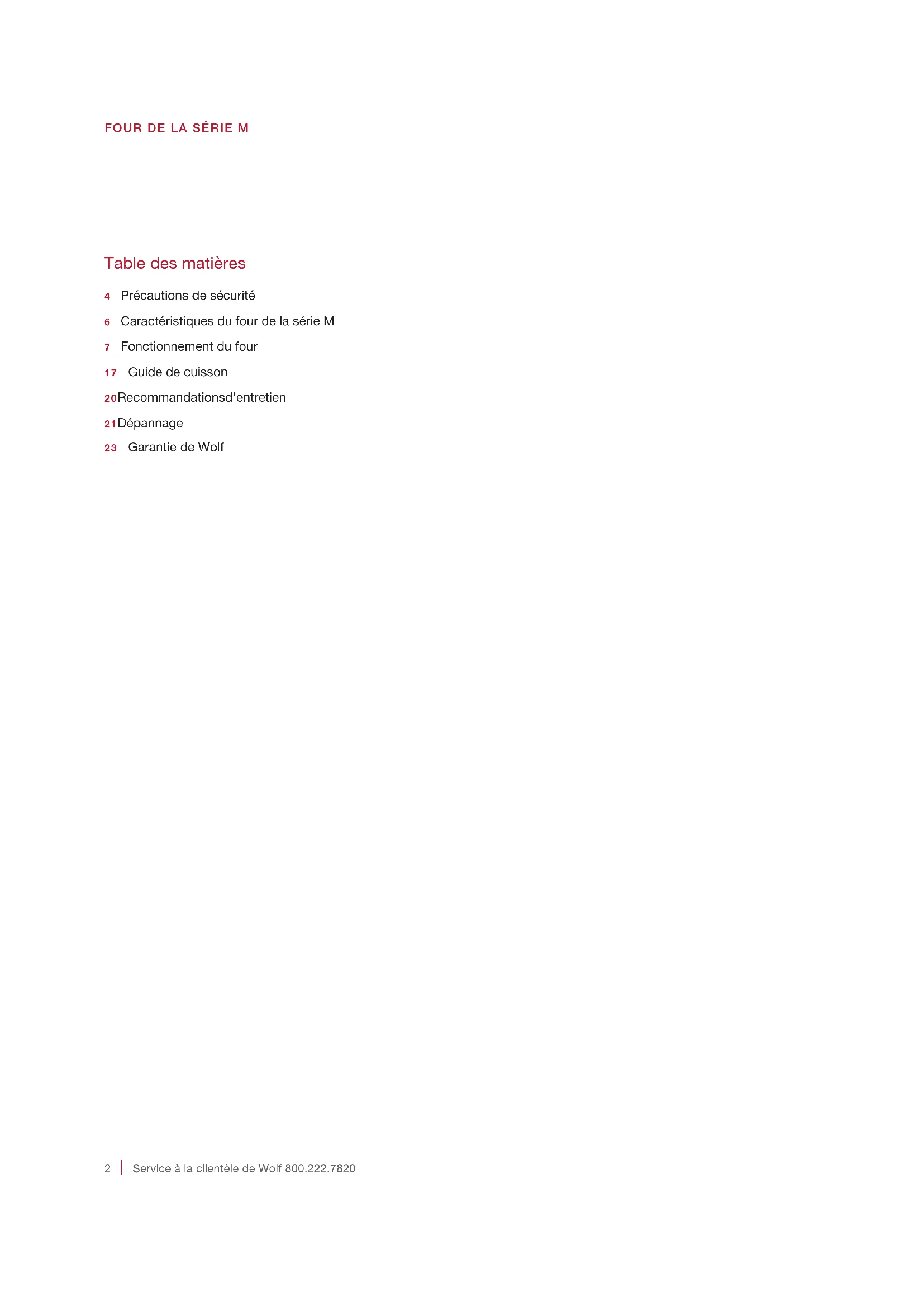 Service à la clientèle de Wolf 800.222.7820 Table des matières 4 Précautions de sécurité6 Caractéristiques du four de la série M7 Fonctionnement du four17 Guide de cuisson20 Recommandations d'entretien21 Dépannage23 Garantie de Wolf FOUR DE LA SÉRIE Mwolfappliance.com