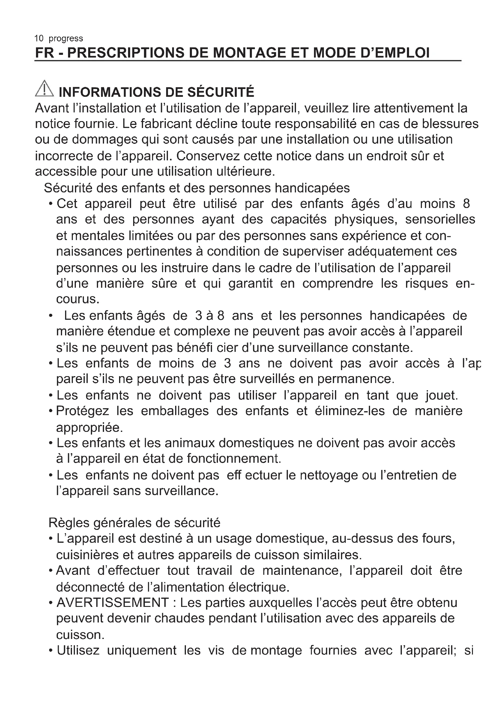 - Utilisez uniquement les vis de montage fournies avec l’appareil; siprogress 11 elles n’ont pas été livrées, utilisez les vis recommandées dans la notice d’installation.