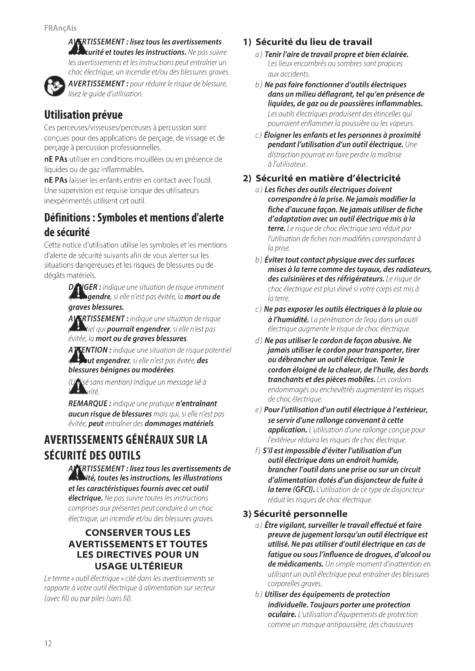 (Utilisé sans mention) Indique un message lié à lasécurité. REMARQUE: indique une pratique n'entraînant aucun risque de blessures mais qui, si elle n'est pas évitée, peut entraîner des dommagesmatériels. Utilisation prévue Ces perceuses/visseuses/perceuses à percussion sont conçues pour des applications de perçage, de vissage et de perçage à percussionprofessionnelles. nE PAs utiliser en conditions mouillées ou en présence de liquides ou de gazinammables. nE PAs laisser les enfants entrer en contact avec l’outil. Une supervision est requise lorsque des utilisateurs inexpérimentés utilisent cetoutil. Français (traduction de la notice d’instructions originale)