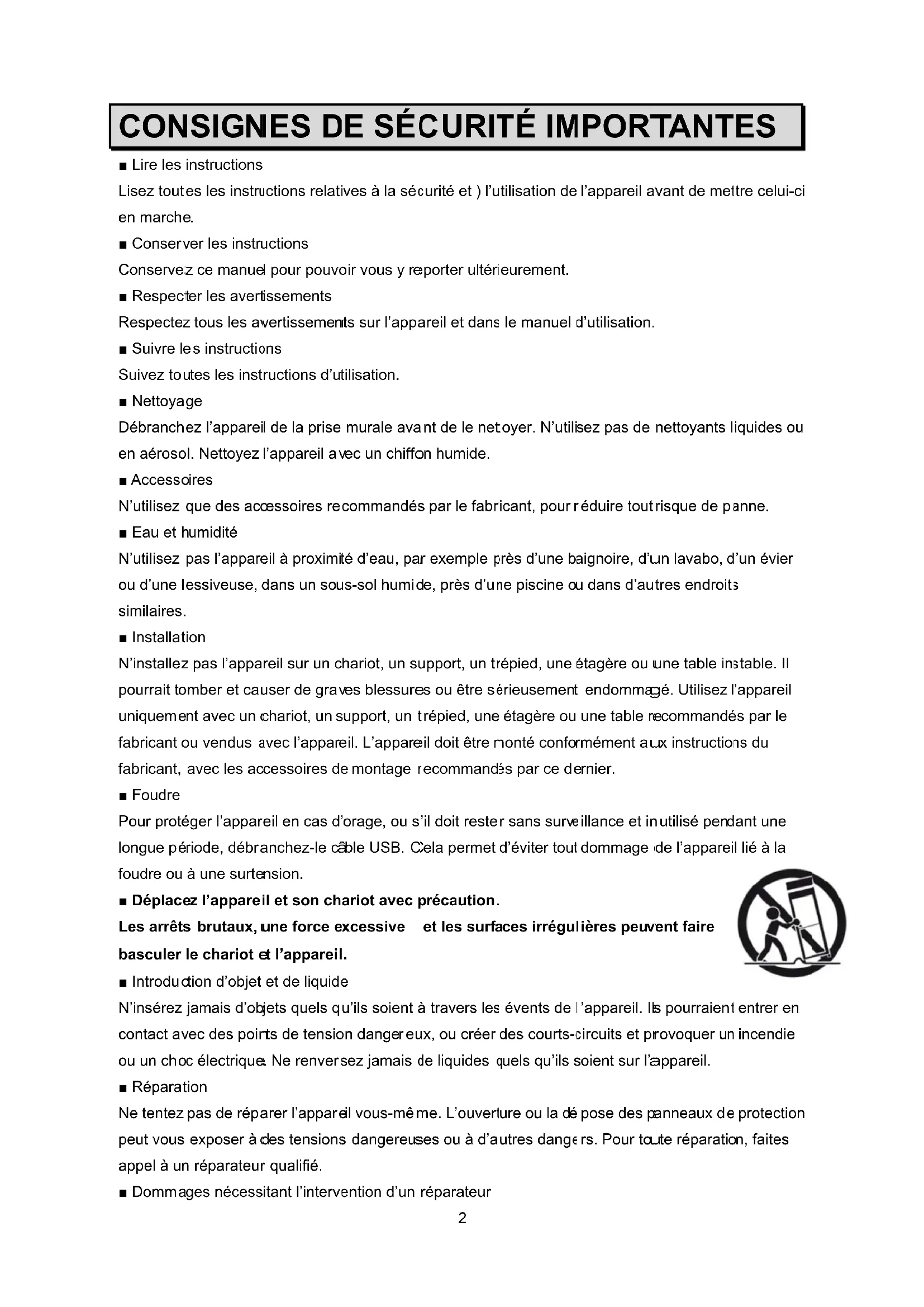 Les précautions particulières suivantes concernent la manipulation de l’appareil. Veuillez prêter particulièrement attention à ces précautions de manipulation.