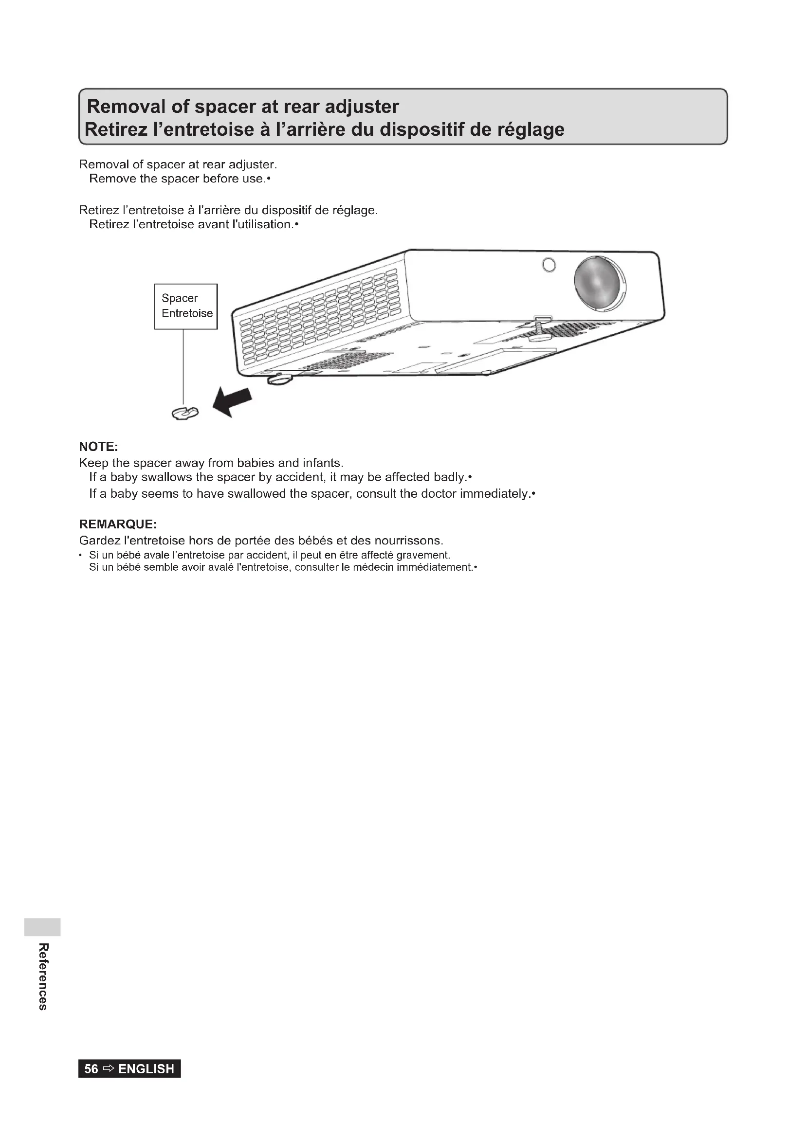 ENGLISH Removal of spacer at rear adjuster. Remove the spacer before use.• Retirez l’entretoise à l’arrière du dispositif de réglage. Retirez l’entretoise avant l'utilisation.• Spacer Entretoise NOTE: Keep the spacer away from babies and infants. If a baby swallows the spacer by accident, it may be affected badly.• If a baby seems to have swallowed the spacer, consult the doctor immediately.• REMARQUE: Gardez l'entretoise hors de portée des bébés et des nourrissons. Si un bébé avale l’entretoise par accident, il peut en être affecté gravement• . Si un bébé semble avoir avalé l'entretoise, consulter le médecin immédiatement.• Removal of spacer at rear adjuster Retirez l’entretoise à l’arrière du dispositif de réglageInformations essentielles FRANÇAIS