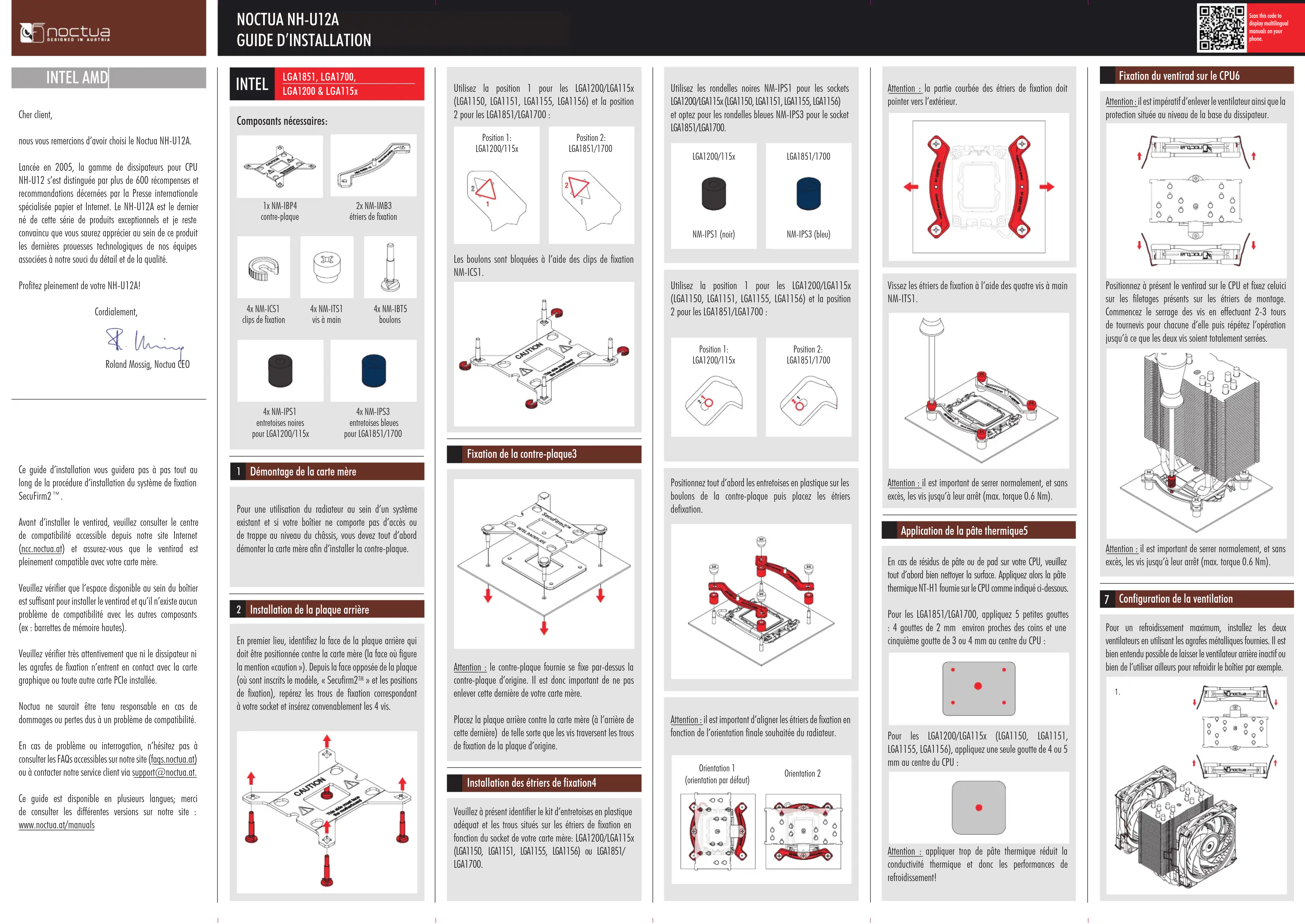 » et les positions de fixation), repérez les trous de fixation correspondant à votre socket et insérez convenablement les 4 vis. 4x NM-IPS1 entretoises noires pour LGA1200/115x 4x NM-IPS3 entretoises bleues pour LGA1851/1700 4x NM-IBT5 boulons 4x NM-ICS1 clips de fixation 4x NM-ITS1 vis à main 2x NM-IMB3 étriers de fixation 1x NM-IBP4 contre-plaque LGA1851, LGA1700, LGA1200 & LGA115x INTEL Les boulons sont bloquées à l’aide des clips de fixation NM-ICS1. Fixation de la contre-plaque3 Attention : le contre-plaque fournie se fixe par-dessus la contre-plaque d’origine. Il est donc important de ne pas enlever cette dernière de votre carte mère. Placez la plaque arrière contre la carte mère (à l’arrière de cette dernière) de telle sorte que les vis traversent les trous de fixation de la plaque d’origine. Veuillez à présent identifier le kit d’entretoises en plastique adéquat et les trous situés sur les étriers de fixation en fonction du socket de votre carte mère: LGA1200/LGA115x (LGA1150, LGA1151, LGA1155, LGA1156) ou LGA1851/ LGA1700. Installation des étriers de fixation4 Position 1: LGA1200/115x Position 2: LGA1851/1700 Utilisez la position 1 pour les LGA1200/LGA115x (LGA1150, LGA1151, LGA1155, LGA1156) et la position 2 pour les LGA1851/LGA1700 : Positionnez tout d’abord les entretoises en plastique sur les boulons de la contre-plaque puis placez les étriers defixation. Attention : il est important d’aligner les étriers de fixation en fonction de l’orientation finale souhaitée du radiateur. Utilisez la position 1 pour les LGA1200/LGA115x (LGA1150, LGA1151, LGA1155, LGA1156) et la position 2 pour les LGA1851/LGA1700 : Position 1: LGA1200/115x Position 2: LGA1851/1700 NM-IPS3 (bleu) LGA1851/1700 NM-IPS1 (noir) LGA1200/115x Utilisez les rondelles noires NM-IPS1 pour les sockets LGA1200/LGA115x (LGA1150, LGA1151, LGA1155, LGA1156) et optez pour les rondelles bleues NM-IPS3 pour le socket LGA1851/LGA1700. Application de la pâte thermique5 Attention : appliquer trop de pâte thermique réduit la conductivité thermique et donc les performances de refroidissement! Pour les LGA1200/LGA115x (LGA1150, LGA1151, LGA1155, LGA1156), appliquez une seule goutte de 4 ou 5 mm au centre du CPU : Attention : la partie courbée des étriers de fixation doit pointer vers l’extérieur. Vissez les étriers de fixation à l’aide des quatre vis à main NM-ITS1. Attention : il est important de serrer normalement, et sans excès, les vis jusqu’à leur arrêt (max. torque 0.6 Nm). En cas de résidus de pâte ou de pad sur votre CPU, veuillez tout d’abord bien nettoyer la surface. Appliquez alors la pâte thermique NT-H1 fournie sur le CPU comme indiqué ci-dessous. Pour les LGA1851/LGA1700, appliquez 5 petites gouttes : 4 gouttes de 2 mm environ proches des coins et une cinquième goutte de 3 ou 4 mm au centre du CPU : Positionnez à présent le ventirad sur le CPU et fixez celuici sur les filetages présents sur les étriers de montage. Commencez le serrage des vis en effectuant 2-3 tours de tournevis pour chacune d’elle puis répétez l’opération jusqu’à ce que les deux vis soient totalement serrées. Cher client, nous vous remercions d’avoir choisi le Noctua NH-U12A. Lancée en 2005, la gamme de dissipateurs pour CPU NH-U12 s’est distinguée par plus de 600 récompenses et recommandations décernées par la Presse internationale spécialisée papier et Internet. Le NH-U12A est le dernier né de cette série de produits exceptionnels et je reste convaincu que vous saurez apprécier au sein de ce produit les dernières prouesses technologiques de nos équipes associées à notre souci du détail et de la qualité. Profitez pleinement de votre NH-U12A! Cordialement, Roland Mossig, Noctua CEO Ce guide d’installation vous guidera pas à pas tout au long de la procédure d’installation du système de fixation SecuFirm2™. Avant d’installer le ventirad, veuillez consulter le centre de compatibilité accessible depuis notre site Internet (ncc.noctua.at) et assurez-vous que le ventirad est pleinement compatible avec votre carte mère. Veuillez vérifier que l’espace disponible au sein du boîtier est suffisant pour installer le ventirad et qu’il n’existe aucun problème de compatibilité avec les autres composants (ex : barrettes de mémoire hautes). Veuillez vérifier très attentivement que ni le dissipateur ni les agrafes de fixation n’entrent en contact avec la carte graphique ou toute autre carte PCIe installée. Noctua ne saurait être tenu responsable en cas de dommages ou pertes dus à un problème de compatibilité. En cas de problème ou interrogation, n’hésitez pas à consulter les FAQs accessibles sur notre site (faqs.noctua.at) ou à contacter notre service client via support@noctua.at. Ce guide est disponible en plusieurs langues; merci de consulter les différentes versions sur notre site : www.noctua.at/manuals