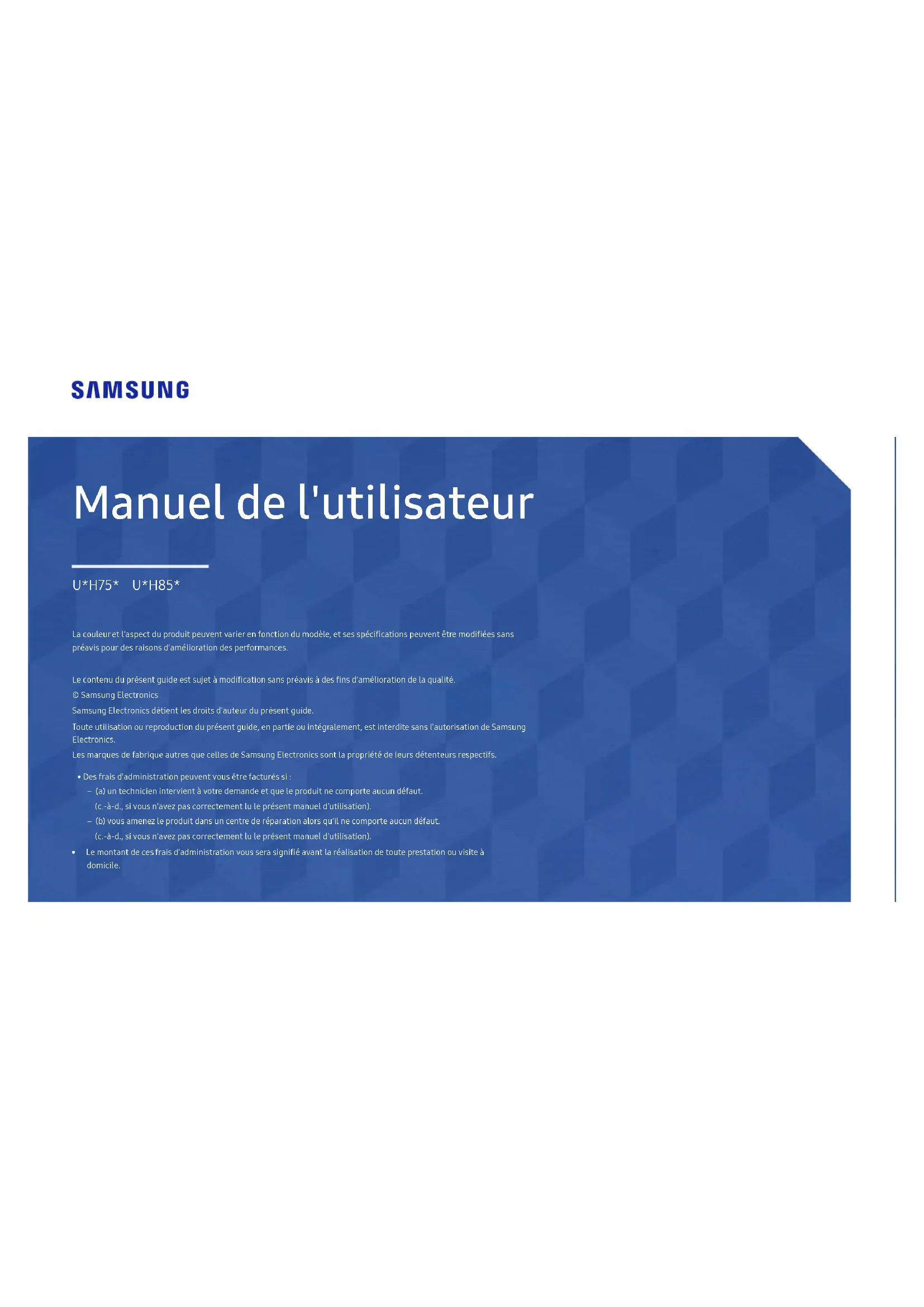 Manuel de l'utilisateur La couleur et l'aspect du produit peuvent varier en fonction du modèle, et ses spécifications peuvent être modifiées sans préavis pour des raisons d'amélioration des performances. Le contenu du présent guide est sujet à modification sans préavis à des fins d'amélioration de la qualité. © Samsung Electronics Samsung Electronics détient les droits d'auteur du présent guide. Toute utilisation ou reproduction du présent guide, en partie ou intégralement, est interdite sans l'autorisation de Samsung Electronics. Les marques de fabrique autres que celles de Samsung Electronics sont la propriété de leurs détenteurs respectifs. U*H75* U*H85*