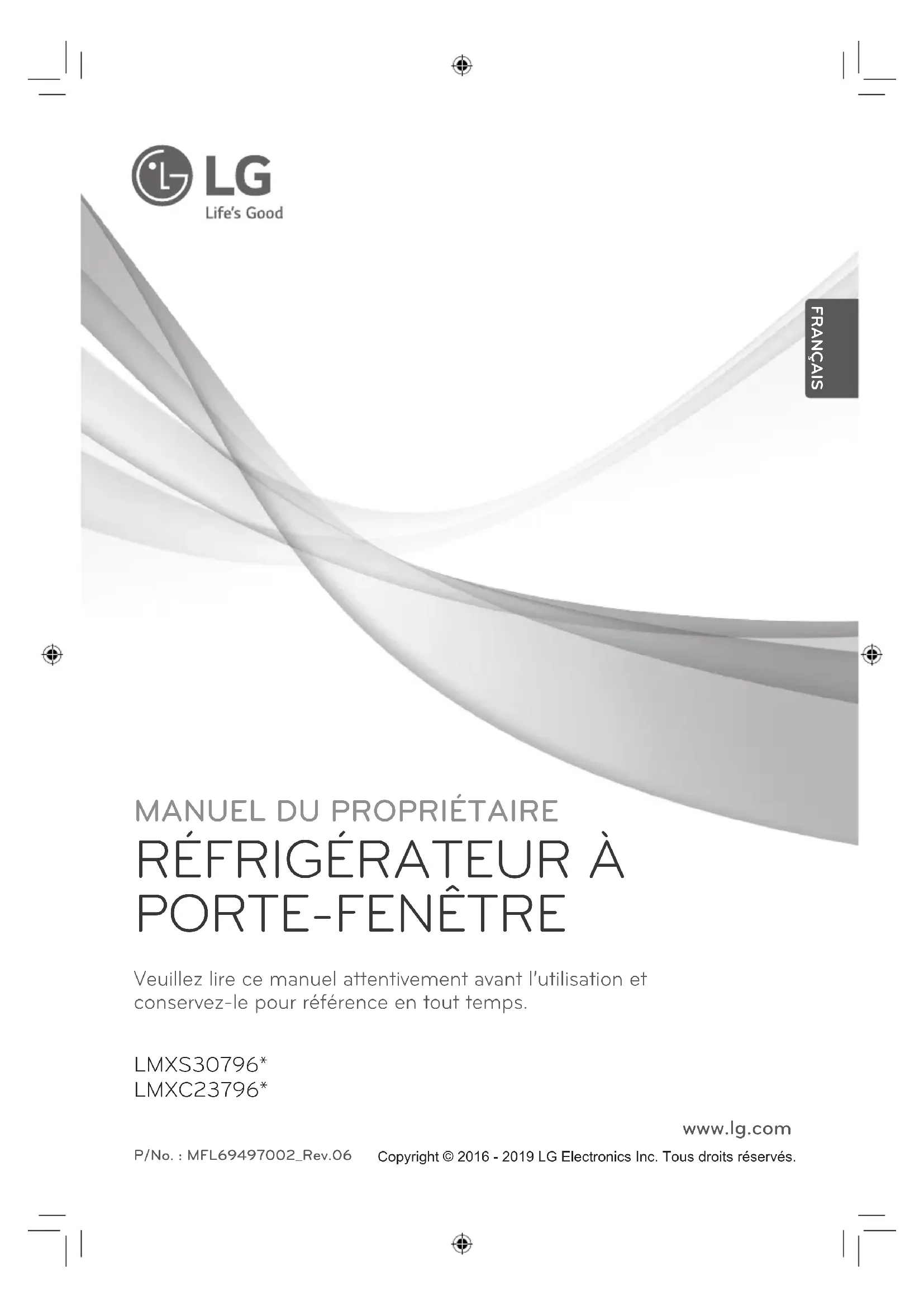 PORTE-FENÊTRE Veuillez lire ce manuel attentivement avant l’utilisation et conservez-le pour référence en tout temps. LMXS30796* LMXC23796* P/No. : MFL69497002_Rev.06 www.lg.com FRANÇAIS Copyright © 2016 - 2019 LG Electronics Inc. Tous droits réservés.2