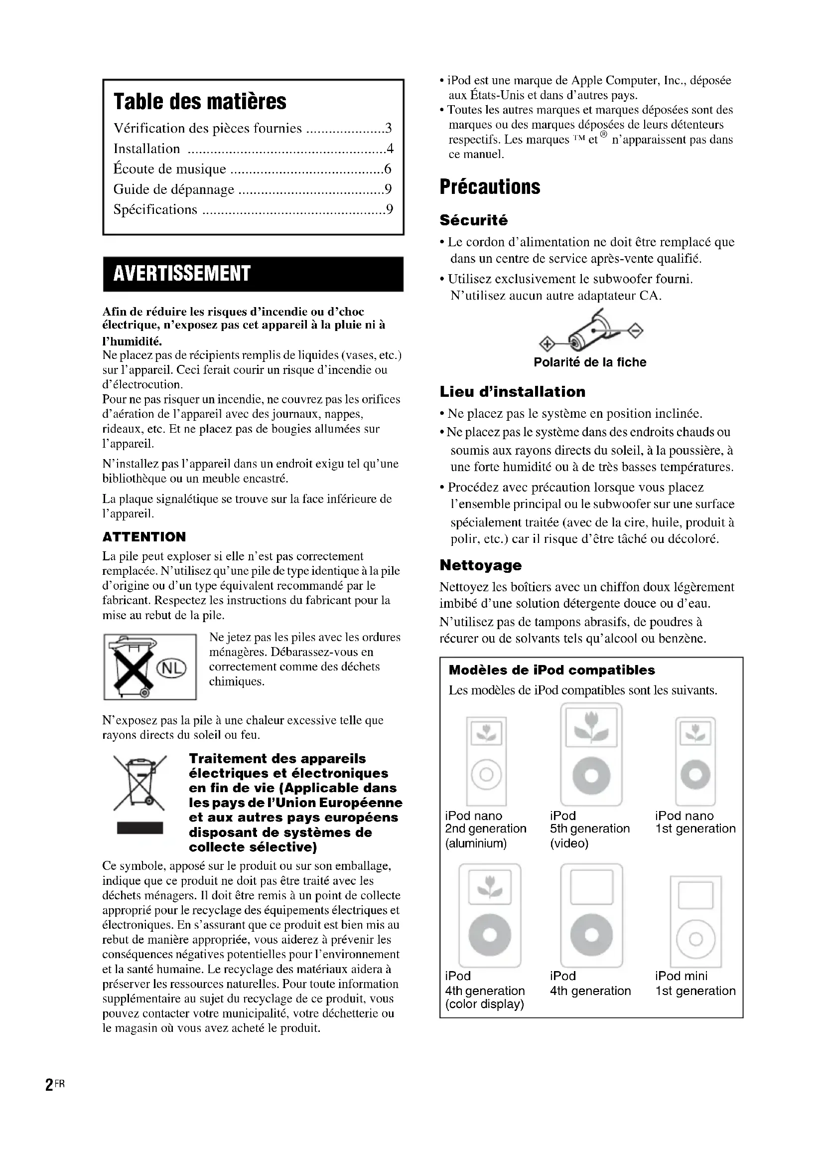 Afin de réduire les risques d’incendie ou d’choc électrique, n’exposez pas cet appareil à la pluie ni à l’humidité.Ne placez pas de récipients remplis de liquides (vases, etc.) sur l’appareil. Ceci ferait courir un risque d’incendie ou d’électrocution.Pour ne pas risquer un incendie, ne couvrez pas les orifices d’aération de l’appareil avec des journaux, nappes, rideaux, etc. Et ne placez pas de bougies allumées sur l’appareil.N’installez pas l’appareil dans un endroit exigu tel qu’une bibliothèque ou un meuble encastré.La plaque signalétique se trouve sur la face inférieure de l’appareil.ATTENTIONLa pile peut exploser si elle n’est pas correctement remplacée. N’utilisez qu’une pile de type identique à la pile d’origine ou d’un type équivalent recommandé par le fabricant. Respectez les instructions du fabricant pour la mise au rebut de la pile.Ne jetez pas les piles avec les ordures ménagères. Débarassez-vous en correctement comme des déchets chimiques.N’exposez pas la pile à une chaleur excessive telle que rayons directs du soleil ou feu.Traitement des appareils électriques et électroniques en fin de vie (Applicable dans les pays de l’Union Européenne et aux autres pays européens disposant de systèmes de collecte sélective)Ce symbole, apposé sur le produit ou sur son emballage, indique que ce produit ne doit pas être traité avec les déchets ménagers. Il doit être remis à un point de collecte approprié pour le recyclage des équipements électriques et électroniques. En s’assurant que ce produit est bien mis au rebut de manière appropriée, vous aiderez à prévenir les conséquences négatives potentielles pour l’environnement et la santé humaine. Le recyclage des matériaux aidera à préserver les ressources naturelles. Pour toute information supplémentaire au sujet du recyclage de ce produit, vous pouvez contacter votre municipalité, votre déchetterie ou le magasin où vous avez acheté le produit.• iPod est une marque de Apple Computer, Inc., déposée aux États-Unis et dans d’autres pays.• Toutes les autres marques et marques déposées sont des marques ou des marques déposées de leurs détenteurs respectifs. Les marques ™ et n’apparaissent pas dans ce manuel. Précautions Sécurité