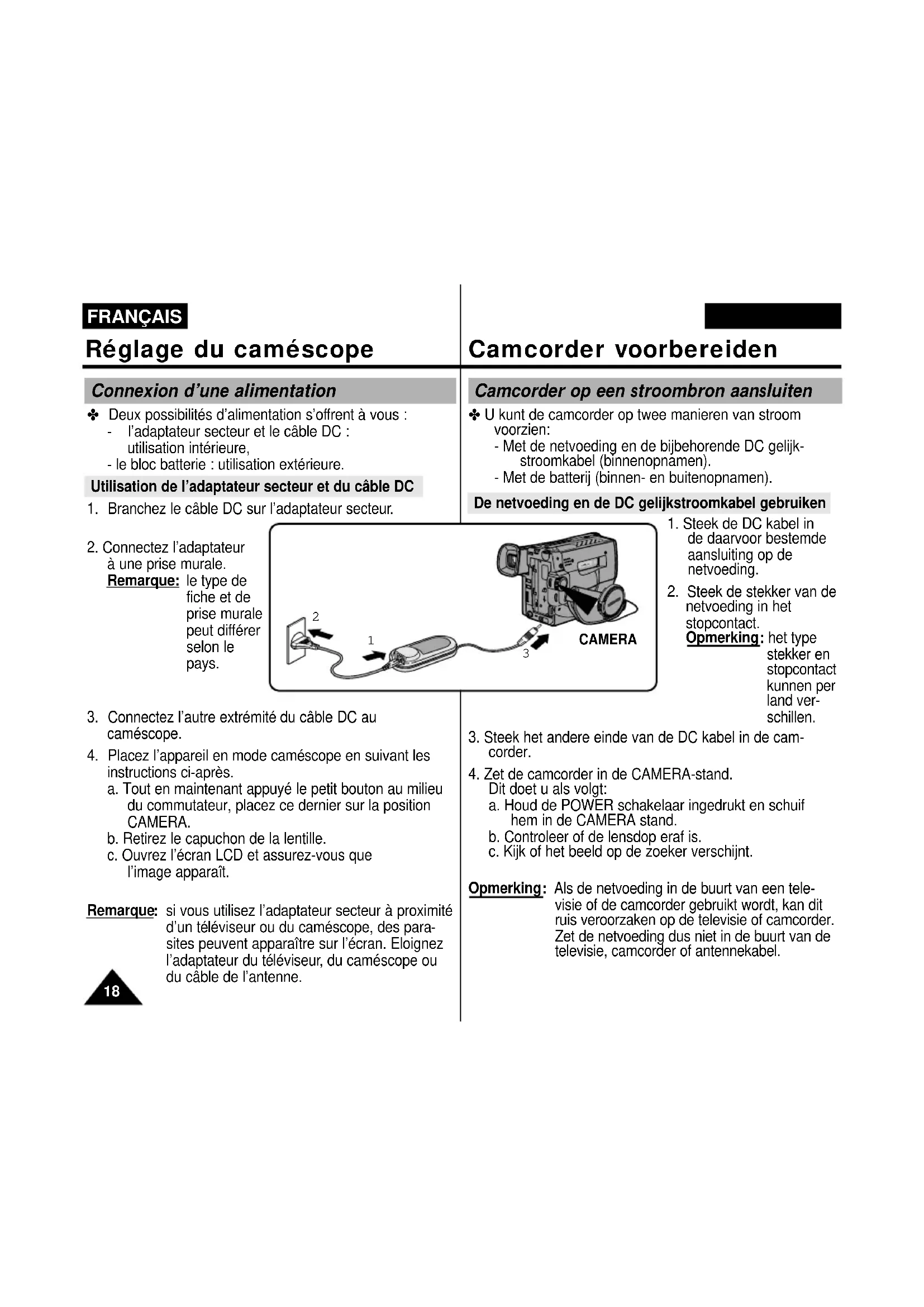 Vous pouvez contrôler l’image dans le viseur. Cependant, pour visionner ou dupliquer vos enreg- istrements, le téléviseur ou le magnétoscope utilisé doit être aux normes PAL (modèles VP-W80U/ W80/W87/W87D) et posséder les connecteurs audio/vidéo appropriés. ✜ Pays utilisant la norme PAL Allemagne, Arabie Saoudite, Australie, Autriche, Belgique, Bulgarie, CEI, Chine, Danemark, Egypte, Espagne, Finlande, France, Grande-Bretagne, Grèce, Hongkong, Hongrie, Ile Maurice, Inde, Irak, Iran, Koweït, Libye, Malaisie, Pays-Bas, République slo- vaque, République tchèque, Roumanie, Singapour, Suède, Suisse, Syrie, Thaïlande, Tunisie, etc. ✜ Pays utilisant la norme NTSC Amérique centrale, Bahamas, Canada, Corée du Sud, Etats-Unis d’Amérique, Japon, Mexique, Philippines, Taiwan, etc. Remarque : vous pouvez filmer partout dans le monde. Met de camcorder naar het buitenland ✤ Het tv kleurensysteem en de netspanning kunnen per land verschillen. ✤ Ga de volgende punten na voordat u de camcorder in een ander land gebruikt. Netspanning