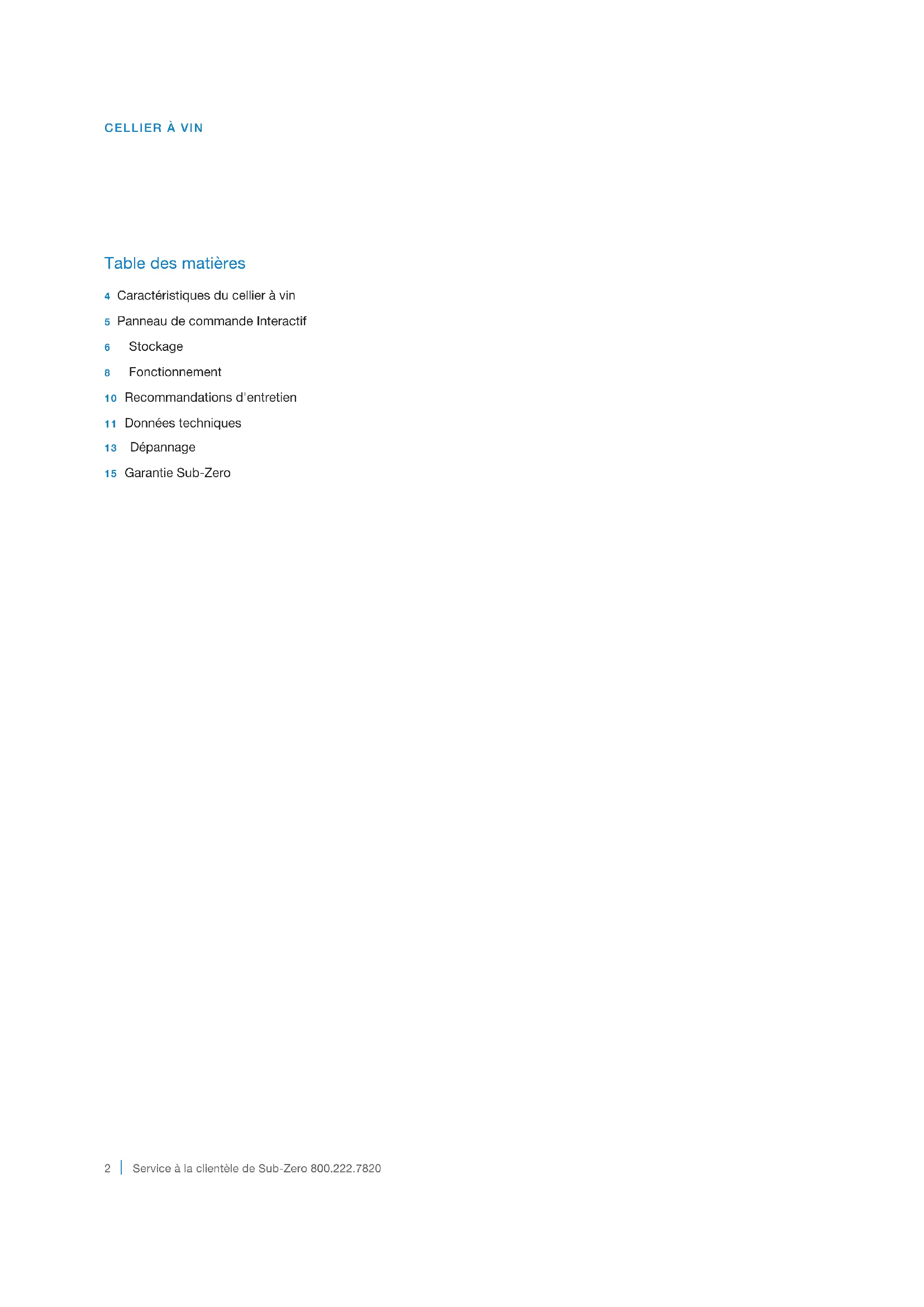 Service à la clientèle de Sub-Zero 800.222.7820 CELLIER À VIN Table des matières 4 Caractéristiques du cellier à vin5 Panneau de commande Interactif6 Stockage8 Fonctionnement10 Recommandations d'entretien11 Données techniques13 Dépannage15 Garantie Sub-Zerosubzero.com