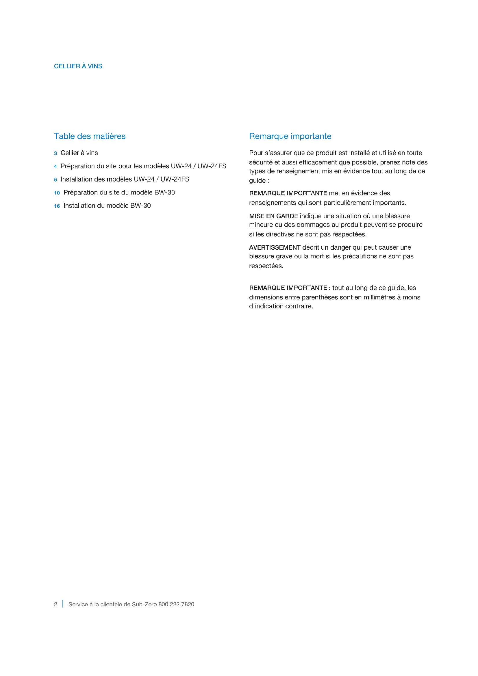 Service à la clientèle de Sub-Zero 800.222.7820 CELLIER À VINS Table des matières 3 Cellier à vins4 Préparation du site pour les modèles UW-24 / UW-24FS6 Installation des modèles UW-24 / UW-24FS10 Préparation du site du modèle BW-3016 Installation du modèle BW-30 Remarque importante Pour s’assurer que ce produit est installé et utilisé en toute sécurité et aussi efcacement que possible, prenez note des types de renseignement mis en évidence tout au long de ce guide : REMARQUE IMPORTANTE met en évidence des renseignements qui sont particulièrement importants. MISE EN GARDE indique une situation où une blessure mineure ou des dommages au produit peuvent se produire si les directives ne sont pas respectées. AVERTISSEMENT décrit un danger qui peut causer une blessure grave ou la mort si les précautions ne sont pas respectées. REMARQUE IMPORTANTE : tout au long de ce guide, les dimensions entre parenthèses sont en millimètres à moins d’indication contraire.subzero.com