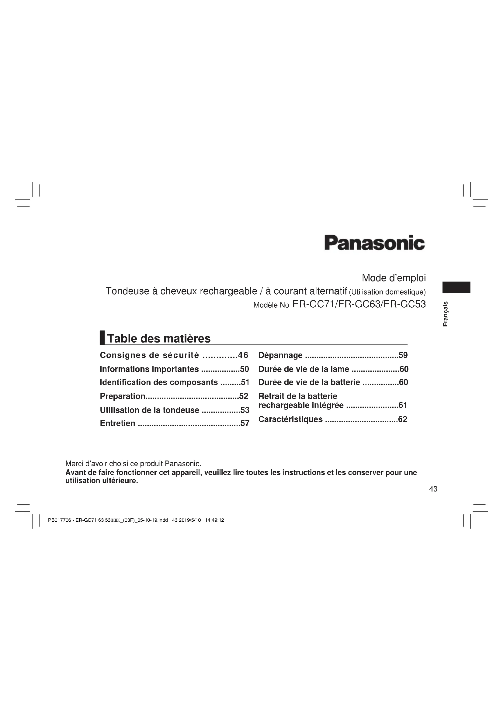Retrouvez gratuitement la notice de l'appareil ERGC53 PANASONIC au format PDF.