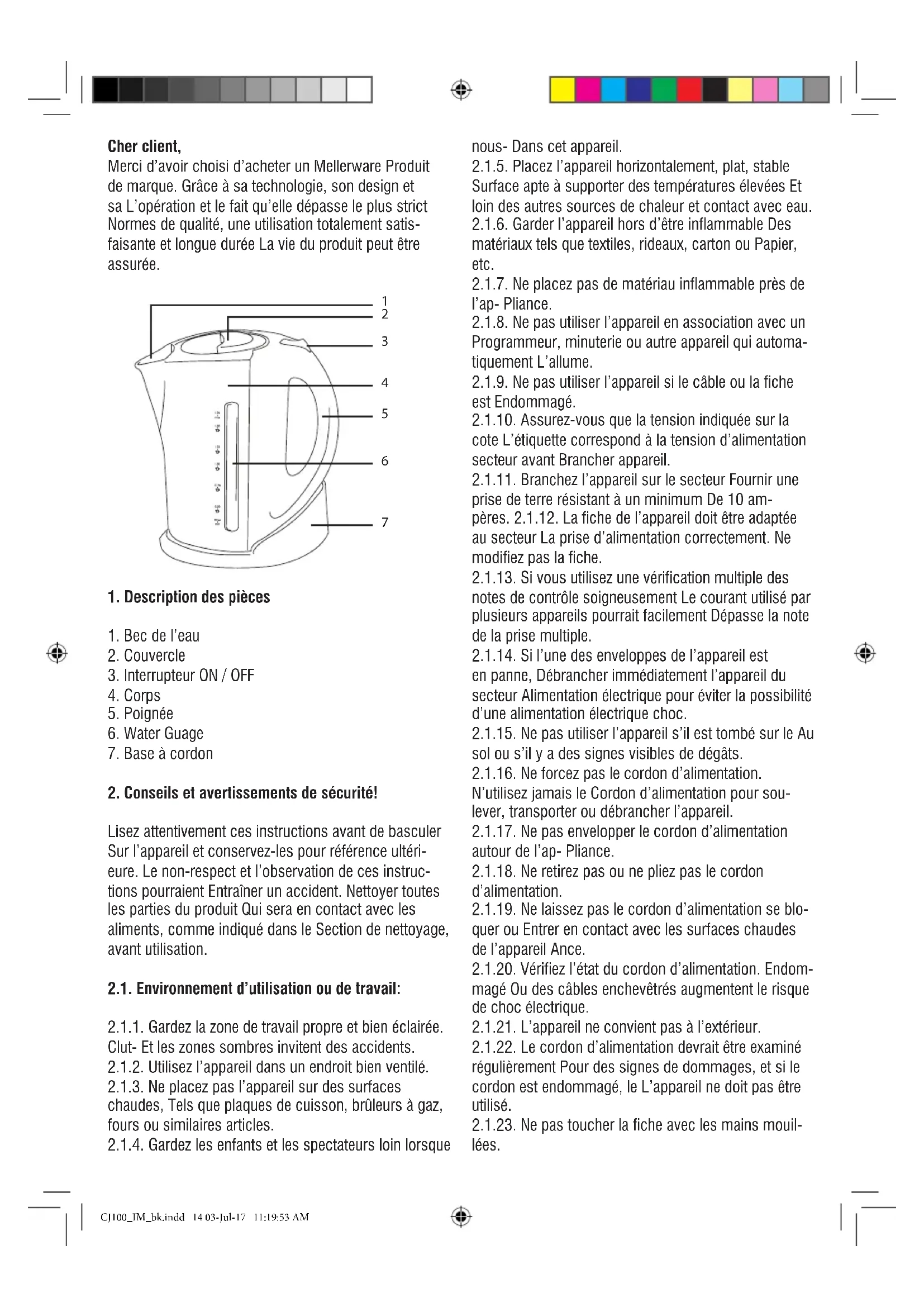 Venant du couvercle ou du bec verseur. SPÉCIFICATION DE PRODUIT: Tension: 230 V ~ 50- 60Hz Puissance: 2000W Capacité d’eau: Minimum 0.5L - Maximum 1.7L CJ100_IM_bk.indd 16 03-Jul-17 11:19:53 AMGuide de dépannage Problème Raison Action Precaution Bouilloire perd de l'eau Peut être la condensation. Ceci est normal s'il est bouché à plusieurs reprises successivement. Cette bouilloire est à usage domestique seulement. La bouilloire est trop remplie. Verser l'eau au niveau MAX. Si de l'eau surchargée peut éjecter de la bouilloire entraînant un risque. Commutateur colle. Assurez-vous que le com- mutateur est propre. Gardez l'appareil à l'écart des éclaboussures de cuisson. La bouilloire ne fonctionne pas La prise domestique est éteinte Allumer la prise domestique. Assurez-vous que l'eau cou- vre l'élément avant operating. La prise domestique ne fonctionne pas. Vérier la prise avec un autre appareil Appliance must be of similar wattage to prevent overload- ing. La bouilloire n'est pas cor- rectement installée sur la base. Siège la bouilloire correcte- ment sur la base. La durée de vie de la bouil- loire sera réduite si elle n'est pas assise sur la base correctement. La bouilloire déclenche l'alimentation secteur Circuit surchargé. Débranchez tous les ap- pareils attachés au même circuit. Notez qu'il peut y avoir jusqu'à 5 prises femelles sur Element has lime scale deposits Descale element using a proprietary descaler or citric acid solution. If not success- ful then a new element may be required. Kettles with scale will have a reduced lifespan. Clean the scale regularly. 1 circuit. Element has lime scale deposits. Descale element using a proprietary descaler or citric acid solution. If not success- ful then a new element may be required. Kettles with scale will have a reduced lifespan. Clean the scale regularly. La bouilloire prend trop de temps pour faire bouillir L'élément possède des dépôts de calcaire Détartrer les éléments à base de détartrage à l'aide d'une propriété détartrante ou d'une solution d'acide citrique. Si elle n'est pas réussie, un nouvel élément peut être requis. Les bouilloires avec échelle auront une durée de vie réduite. Nettoyez régulière- ment les détartrants. Bouilloires avec calcaire L'élément possède des dépôts de calcaire. Détartrer les éléments à base de détartrage à l'aide d'une propriété détartrante ou d'une solution d'acide citrique. Si elle n'est pas réussie, un nouvel élément peut être requis.. Les bouilloires avec échelle auront une durée de vie réduite. Nettoyez régulière- ment les détartrants. La bouilloire rouille à l'extérieur Le dépôt de vapeur a été oxydé et transformé en orange. Essuyez votre bouilloire après chaque utilisation pour rester sec. Garder tout appareil propre en tout temps prolongera la durée de vie du produit. CJ100_IM_bk.indd 17 03-Jul-17 11:19:53 AML'élément rouille. Taches de rouille sur l'élément. Water deposits on the element. Some areas have water that will result in orange or brown stains. Some stains are stubborn and a descaler may not be effective. This should not affect funtion. Utilisez de l'eau distillée. La bouilloire ne s'arrête pas automatiquement. Le couvercle n'est pas positionné correctement ou est désactivé. Placez le couvercle sur la bouilloire en toute sécurité. L'éjection de vapeur du bec ou du couvercle peut être dangereuse. CJ100_IM_bk.indd 18 03-Jul-17 11:19:53 AMEstimado cliente, Obrigado por escolher comprar um Mellerware Produto da marca. Graças à sua tecnologia, design e Operação e o fato de que excede o mais rigoroso Padrões de qualidade, um uso totalmente satisfatório e longo A vida do produto pode ser assegurada.