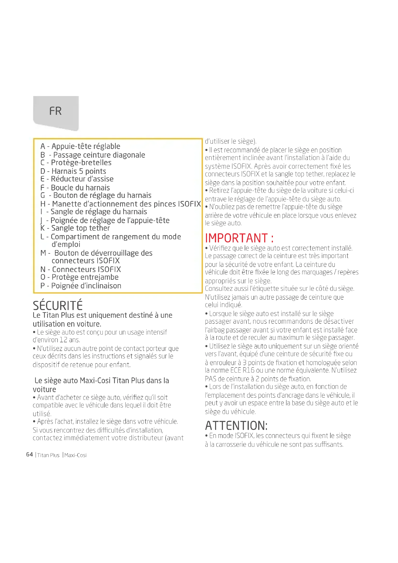 - En mode ISOFIX, les connecteurs qui fixent le siège à la carrosserie du véhicule ne sont pas susants. A - Appuie-tête réglable B - Passage ceinture diagonale C - Protège-bretelles D - Harnais 5 points E - Réducteur d’assise F - Boucle du harnais G - Bouton de réglage du harnais H - Manette d’actionnement des pinces ISOFIX I - Sangle de réglage du harnais J - Poignée de réglage de l’appuie-tête K - Sangle top tether L - Com par ti ment de ra ngem ent du mod e d’emploi M - Bouton de déverrouillage des connecteurs ISOFIX N - Connecteurs ISOFIX O - Protège entrejambe P - Poignée d’inclinaison FRMaxi-Cosi
