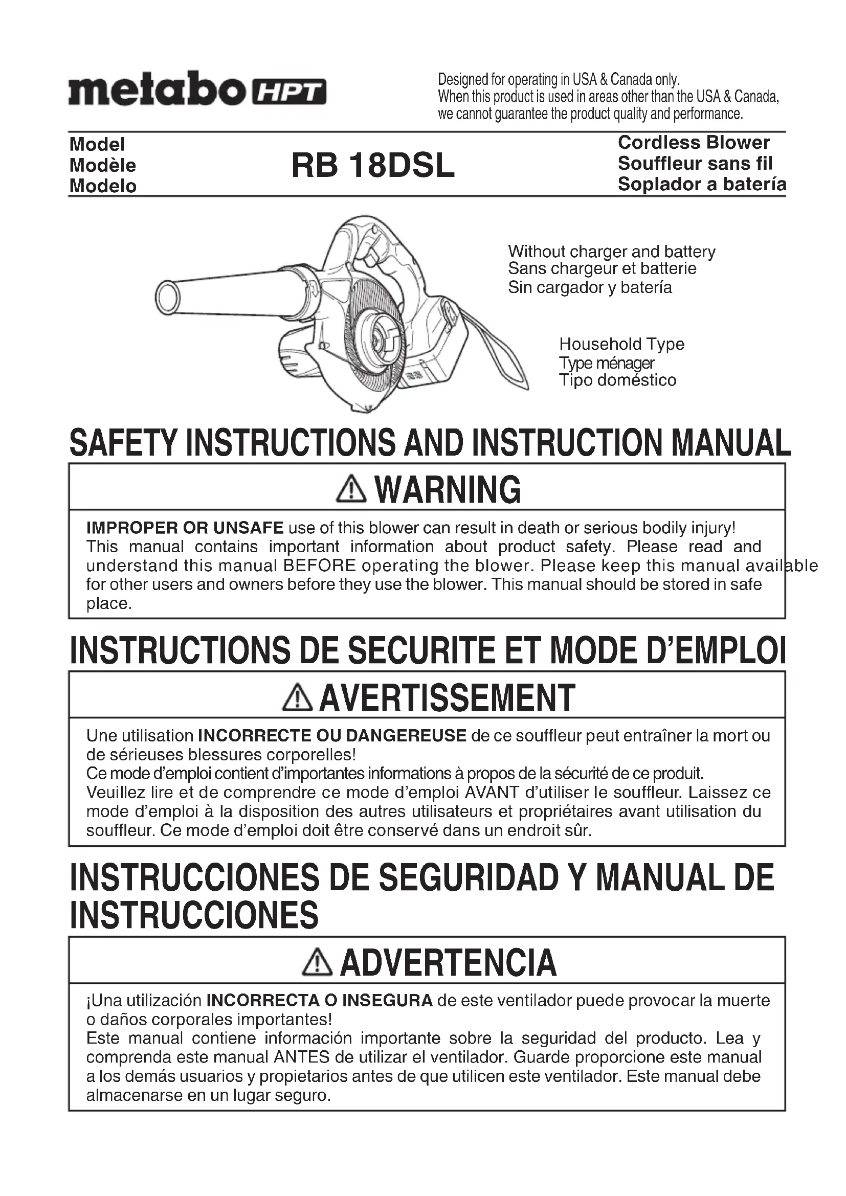 English 00BookRB18DSLUS.indb1100BookRB18DSLUS.indb11 2018/11/2617:03:012018/11/2617:03:01INFORMATIONS IMPORTANTES DE SÉCURITÉ Veuillez lire et comprendre toutes les précautions de sécurité, les avertissements et les instructions de fonctionnement présents dans ce mode d’emploi avant d’utiliser ou d’entretenir ce souffl eur. La plupart des accidents causés lors de l’utilisation ou de l’entretien d’un souffl eur proviennent d’un non- respect des règles ou précautions de base de sécurité. Un accident peut la plupart du temps être évité si l’on reconnaît une situation de danger potentiel avant qu’elle ne se produise, et en observant les procédures de sécurité appropriées. Les précautions de base de sécurité sont mises en évidence dans la section “SECURITE” de ce mode d’emploi et dans les sections qui contiennent les instructions de fonctionnement et d’entretien. Les dangers qui doivent être évités pour prévenir des blessures corporelles ou un endommagement de la machine sont identifi és par AVERTISSEMENTS sur le souffl eur et dans ce mode d’emploi. N’utilisez JAMAIS ce souffl eur d’une manière qui n’est pas spécifi quement recommandée par metabo HPT.
