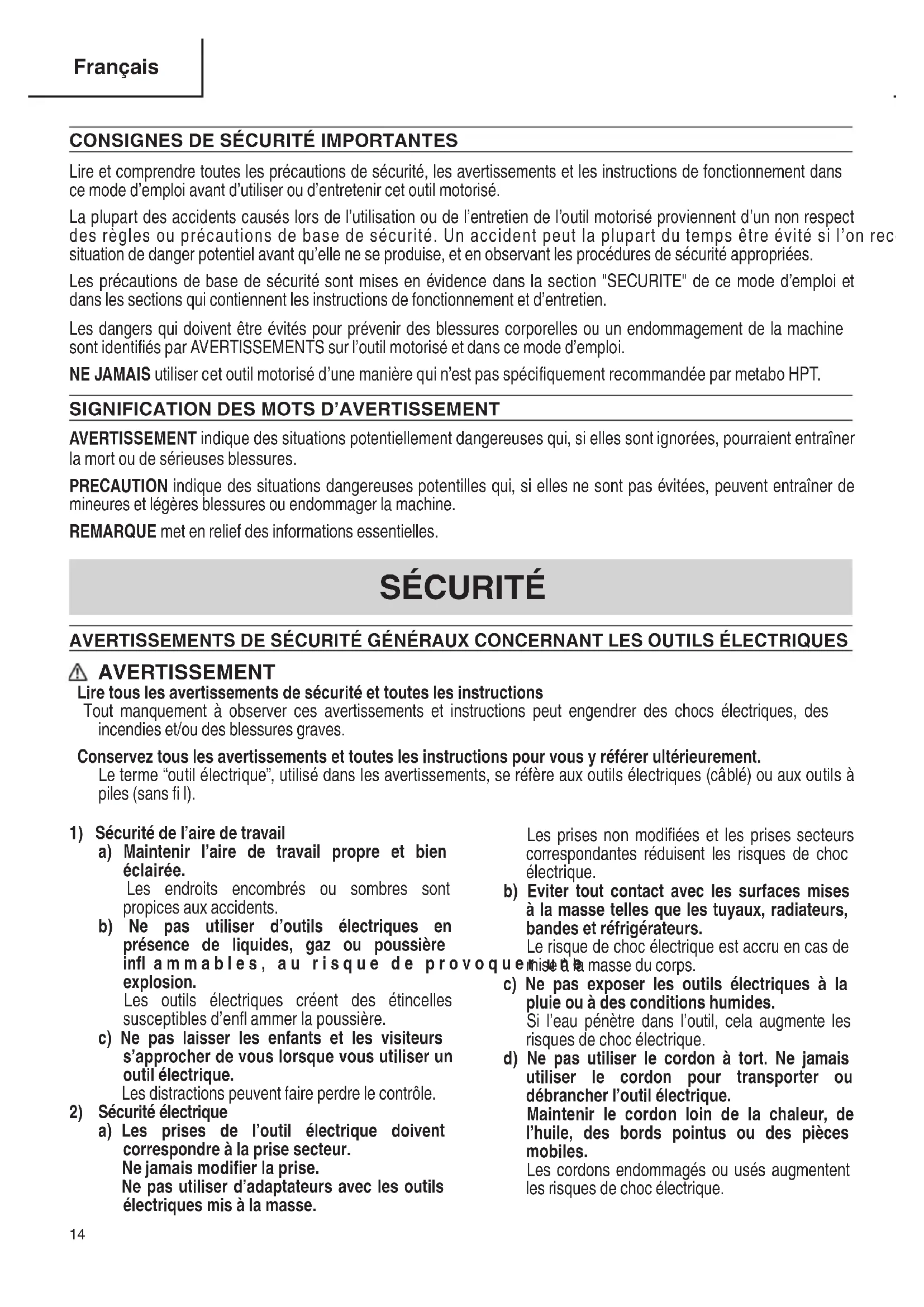 Lire et comprendre toutes les précautions de sécurité, les avertissements et les instructions de fonctionnement dans ce mode d’emploi avant d’utiliser ou d’entretenir cet outil motorisé. La plupart des accidents causés lors de l’utilisation ou de l’entretien de l’outil motorisé proviennent d’un non respect des règles ou précautions de base de sécurité. Un accident peut la plupart du temps être évité si l’on reconnaît une situation de danger potentiel avant qu’elle ne se produise, et en observant les procédures de sécurité appropriées. Les précautions de base de sécurité sont mises en évidence dans la section "SECURITE" de ce mode d’emploi et dans les sections qui contiennent les instructions de fonctionnement et d’entretien. Les dangers qui doivent être évités pour prévenir des blessures corporelles ou un endommagement de la machine sont identifi és par AVERTISSEMENTS sur l’outil motorisé et dans ce mode d’emploi. NE JAMAIS utiliser cet outil motorisé d’une manière qui n’est pas spécifi quement recommandée par metabo HPT.