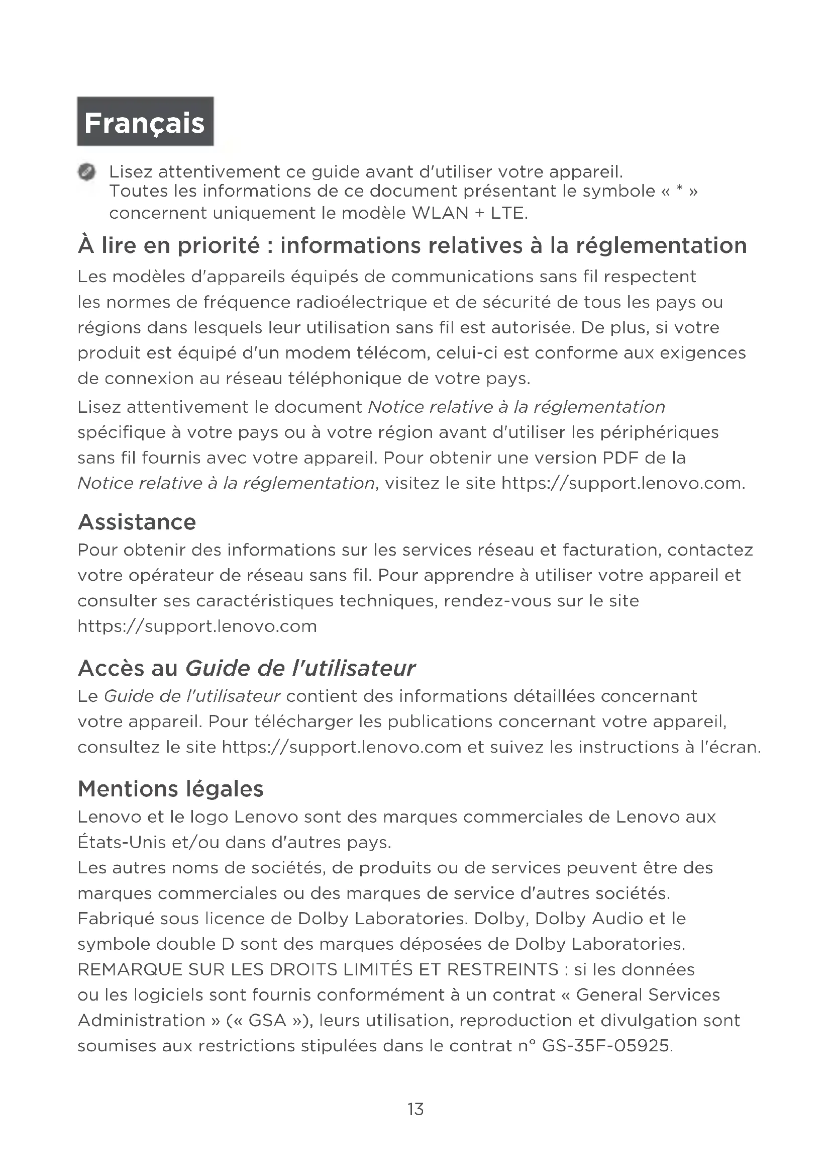 À lire en priorité : informations relatives à la réglementation Les modèles d'appareils équipés de communications sans fil respectent les normes de fréquence radioélectrique et de sécurité de tous les pays ou régions dans lesquels leur utilisation sans fil est autorisée. De plus, si votre produit est équipé d'un modem télécom, celui-ci est conforme aux exigences de connexion au réseau téléphonique de votre pays. Lisez attentivement le document Notice relative à la réglementation spécifique à votre pays ou à votre région avant d'utiliser les périphériques sans fil fournis avec votre appareil. Pour obtenir une version PDF de la Notice relative à la réglementation, visitez le site https://support.lenovo.com. Assistance Pour obtenir des informations sur les services réseau et facturation, contactez votre opérateur de réseau sans fil. Pour apprendre à utiliser votre appareil et consulter ses caractéristiques techniques, rendez-vous sur le site https://support.lenovo.com Accès au Guide de l'utilisateur Le Guide de l'utilisateur contient des informations détaillées concernant votre appareil. Pour télécharger les publications concernant votre appareil, consultez le site https://support.lenovo.com et suivez les instructions à l'écran. Mentions légales Lenovo et le logo Lenovo sont des marques commerciales de Lenovo aux États-Unis et/ou dans d'autres pays. Les autres noms de sociétés, de produits ou de services peuvent être des marques commerciales ou des marques de service d'autres sociétés. Fabriqué sous licence de Dolby Laboratories. Dolby, Dolby Audio et le symbole double D sont des marques déposées de DolbyLaboratories. REMARQUE SUR LES DROITS LIMITÉS ET RESTREINTS: si les données ou les logiciels sont fournis conformément à un contrat «General Services Administration» («GSA»), leurs utilisation, reproduction et divulgation sont soumises aux restrictions stipulées dans le contrat n°GS-35F-05925. Français14 Présentation de l'appareil Modèle Version Lenovo TB-8505F WLAN Lenovo TB-8505X WLAN + LTE
