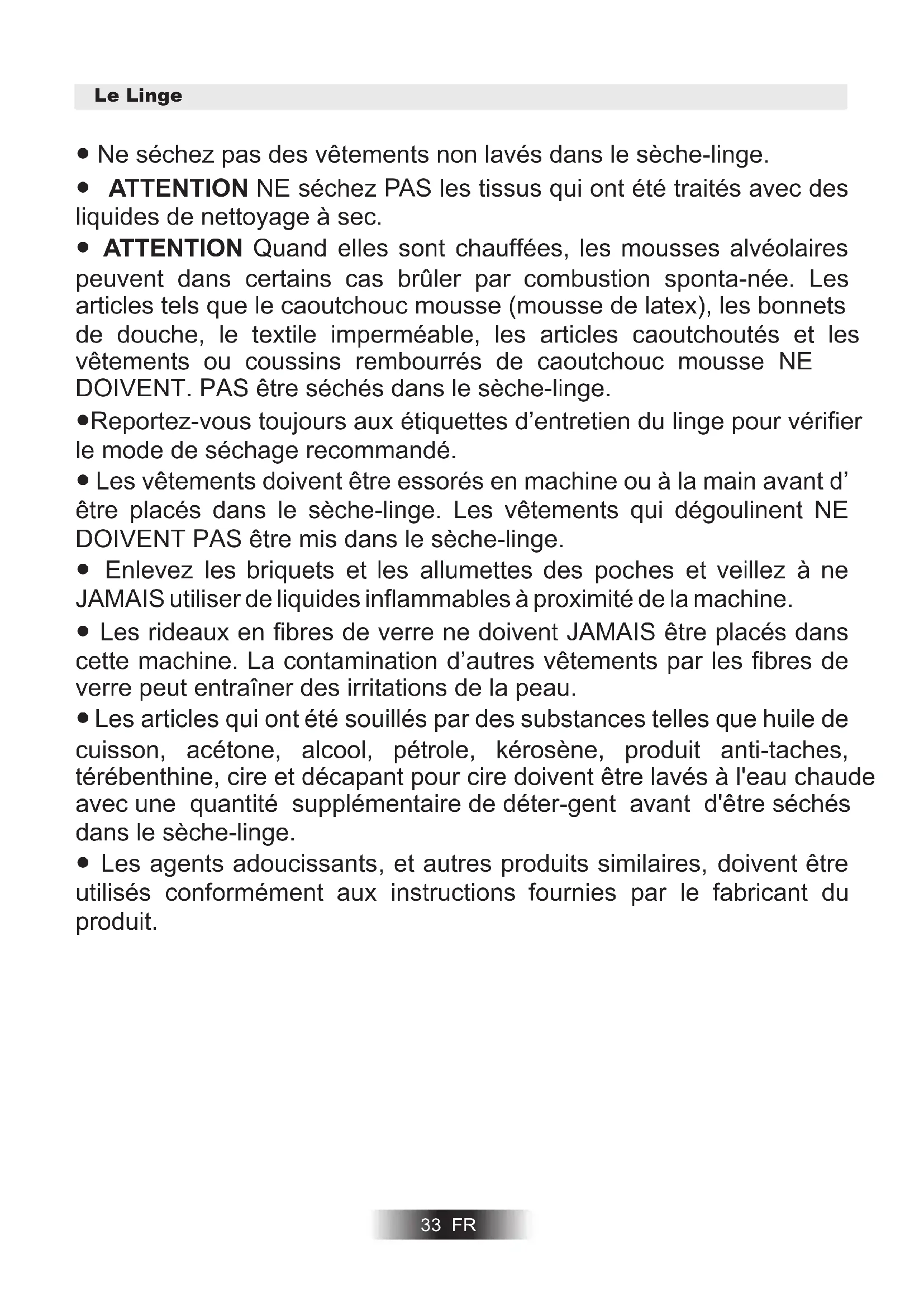 AVISO! El tambor, la puerta y las piezas que se han secado pueden estar muy calientes. IMPORTANTE Antes de limpiar esta má quin a , s iemp re debe ap a garl a y desenchufarla del suministro eléctrico. Para datos referentes a energía eléctrica, refiérase a la etiqueta de homologación que se encuentra en la parte delantera de la secadora (con la puerta abierta). Información para las pruebas de laboratorio EN 61121 Programa P P E U rograma ara l so -Algodón Seco-Listo Para Guardar-Listo Para Planchar- + Sintetico Listo Para Guardar -Planchar Algodón-Tejidos DelicadosGuía de secadoEl ciclo estandar ( ) es el de mayor eficiencia energética y el pensado para el secado de una colada normal de algodón. La ta b l a e n l a ú l t i ma pá g i na mu e st r a aproximadamente los tiempos y consumos de energía de los programas principales. Listo Para Guardar Especificaciones Técnicas Capacidad del tambor 115Peso máximo que se puede secar Ver etiqueta energéticaAltura 85 cm Ancho60 cmProfundidad 60 cmCategoría de consumo de energía Ver etiqueta energética Capacity (as energy label) 6 kg 7 kg 8 kg 9 kg / 10 kg Power consumption of off-mode 0,20 W 0,25 W 0,20 W 0,15 W Power consumption of on-mode 0,75 W 0,80 W 0,80 W 0,75 W Perfect Home Seco Listo Para Guardar Listo Para Planchar33 FR ● Ne séchez pas des vêtements non lavés dans le sèche-linge. ● ATTENTION NE séchez PAS les tissus qui ont été traités avec des liquides de nettoyage à sec. ● ATTENTION Quand elles sont chauffées, les mousses alvéolaires peuvent dans certains cas brûler par combustion sponta-née. Les articles tels que le caoutchouc mousse (mousse de latex), les bonnets de douche, le textile imperméable, les articles caoutchoutés et les vêtements ou coussins rembourrés de caoutchouc mousse NE DOIVENT. PAS être séchés dans le sèche-linge. ●Reportez-vous toujours aux étiquettes d’entretien du linge pour vérifier le mode de séchage recommandé. ● Les vêtements doivent être essorés en machine ou à la main avant d’ être placés dans le sèche-linge. Les vêtements qui dégoulinent NE DOIVENT PAS être mis dans le sèche-linge. ● Enlevez les briquets et les allumettes des poches et veillez à ne JAMAIS utiliser de liquides inflammables à proximité de la machine. ● Les rideaux en fibres de verre ne doivent JAMAIS être placés dans cette machine. La contamination d’autres vêtements par les fibres de verre peut entraîner des irritations de la peau. ● Les articles qui ont été souillés par des substances telles que huile de cuisson, acétone, alcool, pétrole, kérosène, produit anti-taches, térébenthine, cire et décapant pour cire doivent être lavés à l'eau chaude avec une quantité supplémentaire de déter-gent avant d'être séchés dans le sèche-linge. ● Les agents adoucissants, et autres produits similaires, doivent être utilisés conformément aux instructions fournies par le fabricant du produit. Le Linge