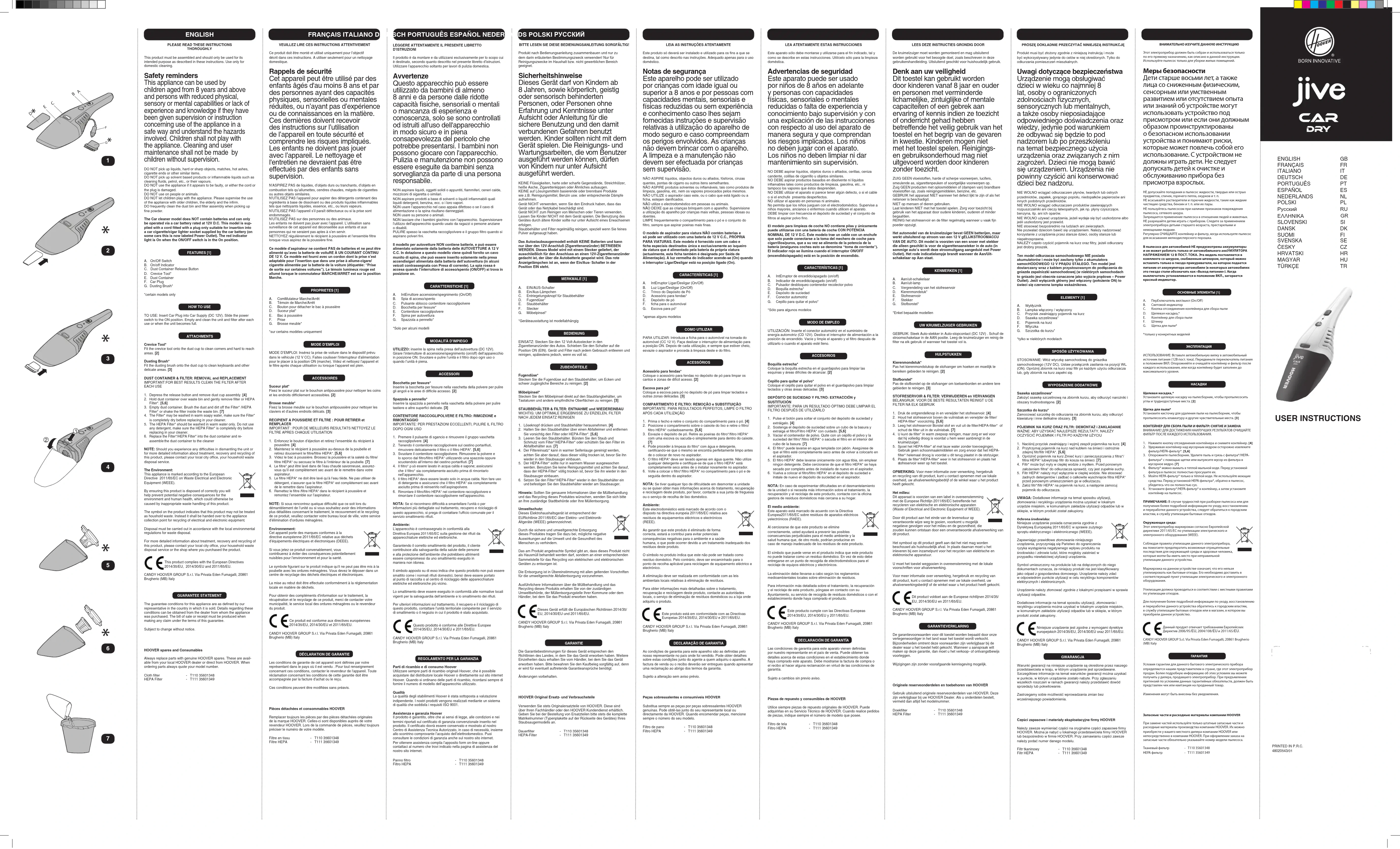 Pièces détachées et consommables HOOVER Remplacer toujours les pièces par des pièces détachées originales de la marque HOOVER. Celles-ci sont disponibles auprès de votre revendeur HOOVER. Lors de la commande de pièces, veuillez toujours préciser le numéro de votre modèle. Filtre en tissu - T110 35601348 Filtre HEPA - T111 35601349