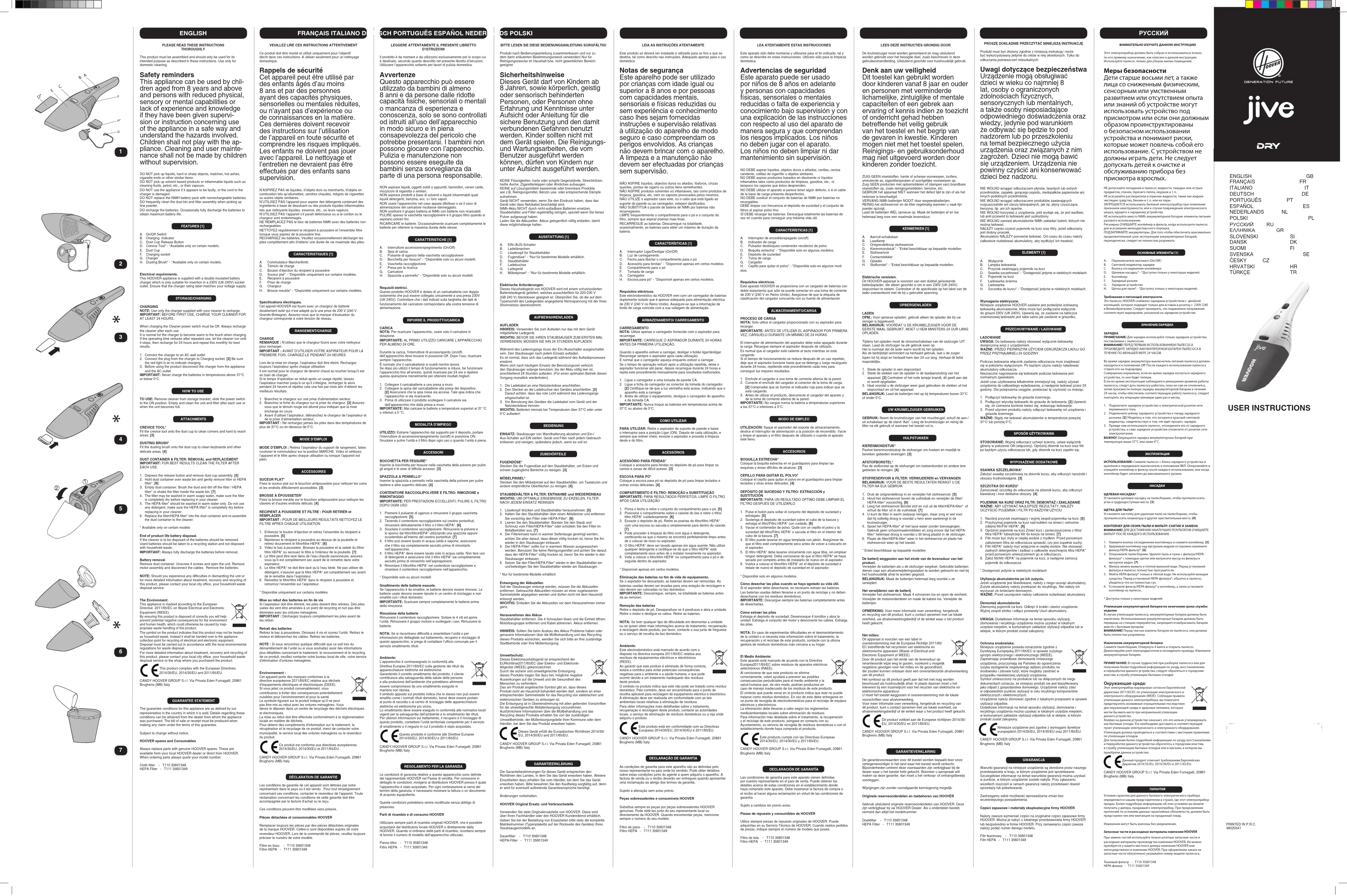 Ceproduitdoitêtremontéetutiliséuniquementpourl’objectif décrit dans ces instructions. A utiliser seulement pour un nettoyage domestique. Rappels de sécurité Cet appareil peut être utilisé par des enfants âgés d’au moins 8 ans et par des personnes ayantdescapacitésphysiques, sensorielles ou mentales réduites, ou n’ayant pas d’expérience ou de connaissances en la matière. Ces dernières doivent recevoir des instructions sur l’utilisation de l’appareil en toute sécurité et comprendrelesrisquesimpliqués. Les enfants ne doivent pas jouer avec l’appareil. Le nettoyage et l’entretien ne devraient pas être effectués par des enfants sans supervision. N’ASPIREZPASdeliquides,d’objetsdursoutranchants,d’objetsen combustiontelsqu’allumettes,cendreschaudes,mégotsdecigarettes ou autres objets similaires. N’UTILISEZPASl’appareilpouraspirerdesdétergentscontenantdes ingrédientsàbasededissolvantoudesproduitsliquidesinammables telsquenettoyantsliquides,essence,etc.,ouleursvapeurs. N’UTILISEZPASl’appareils’ilparaîtdéfectueuxousilecordonoule chargeur sont endommagés. NEREMPLACEZPASleblocdebatteriesNiMhavecdesbatteriesnon rechargeables. NETTOYEZrégulièrementlerécipientàpoussièreetl’ensembleltre lorsquevousaspirezdelapoussièrene. RECHARGEZlesbatteries.Veuillezoccasionnellementdéchargerles pilescomplètementand’obteniruneduréedeviemaximaledespiles. CARACTERISTIQUES [1] A. Commutateur Marche/Arrêt. B. Témoin de charge C. Bouton d’éjection du récipient à poussière D. Suceurplat*-*Disponibleuniquementsurcertainsmodèles. E. Récipient à poussière F. Prise de charge G. Chargeur H. Brossemeuble*-*Disponibleuniquementsurcertainsmodèles. Spécications électriques. Cet appreil HOOVER est fourni avec un chargeur de batterie doublementisoléquin’estadaptéqu’àuneprisede230V(240V Grande-Bretagne).Assurez-vousquelamarqued’évaluationdu chargeur corresponde à votre tension de réseau. RANGEMENT/CHARGE CHARGE REMARQUE :N’utilisezquelechargeurfourniavecvotrenettoyeur pour recharger. IMPORTANT : AVANT D’UTILISER VOTRE ASPIRATEUR POUR LA