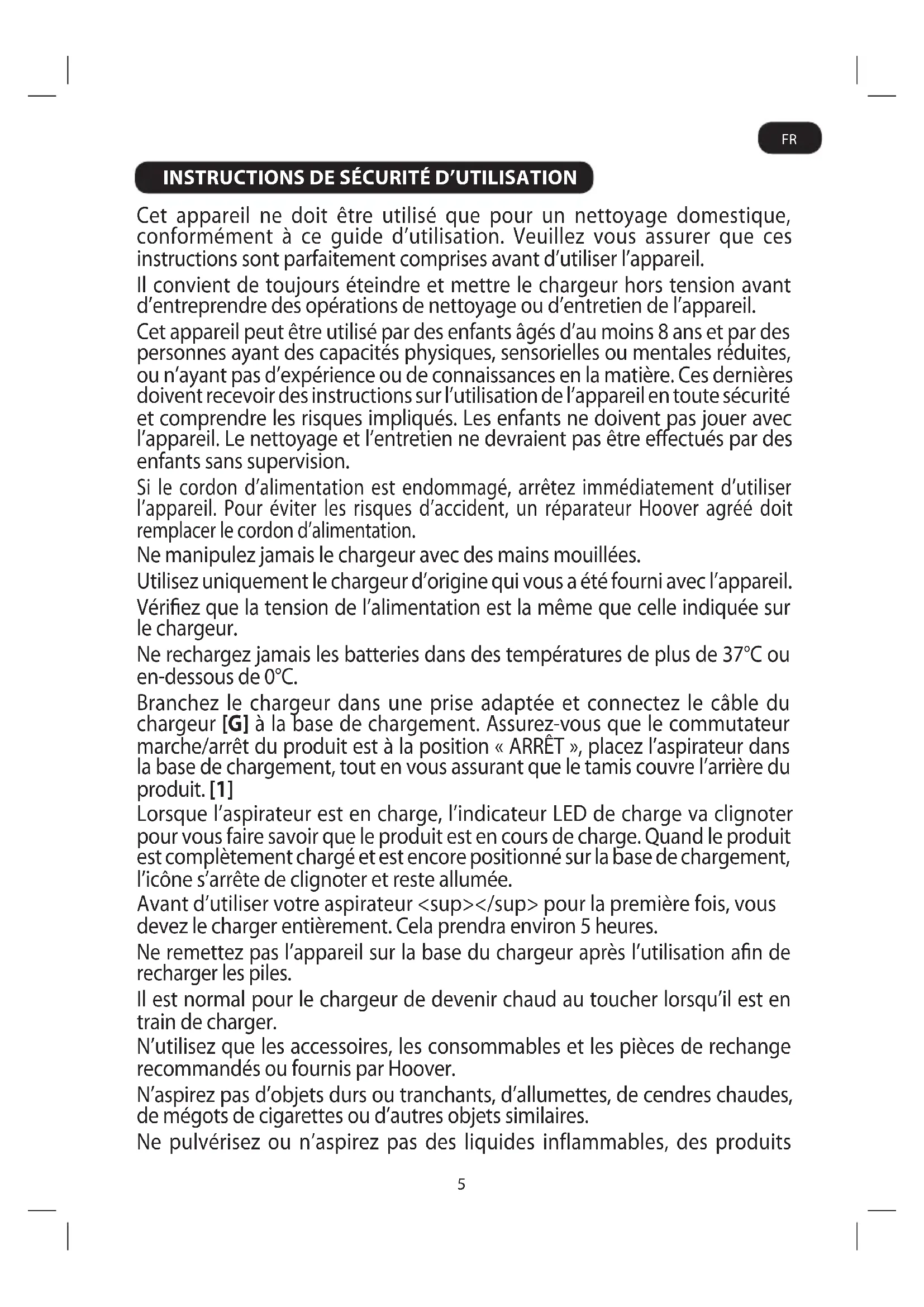 Cet appareil ne doit être utilisé que pour un nettoyage domestique, conformément à ce guide d’utilisation. Veuillez vous assurer que ces instructions sont parfaitement comprises avant d’utiliser l’appareil. Il convient de toujours éteindre et mettre le chargeur hors tension avant d’entreprendre des opérations de nettoyage ou d’entretien de l’appareil. Cet appareil peut être utilisé par des enfants âgés d’au moins 8 ans et par des personnes ayant des capacités physiques, sensorielles ou mentales réduites, ou n’ayant pas d’expérience ou de connaissances en la matière. Ces dernières doivent recevoir des instructions sur l’utilisation de l’appareil en toute sécurité et comprendre les risques impliqués. Les enfants ne doivent pas jouer avec l’appareil. Le nettoyage et l’entretien ne devraient pas être eectués par des enfants sans supervision. Si le cordon d’alimentation est endommagé, arrêtez immédiatement d’utiliser l’appareil. Pour éviter les risques d’accident, un réparateur Hoover agréé doit remplacer le cordon d’alimentation. Ne manipulez jamais le chargeur avec des mains mouillées. Utilisez uniquement le chargeur d’origine qui vous a été fourni avec l’appareil. Vériez que la tension de l’alimentation est la même que celle indiquée sur le chargeur. Ne rechargez jamais les batteries dans des températures de plus de 37°C ou en-dessous de 0°C. Branchez le chargeur dans une prise adaptée et connectez le câble du chargeur [G] à la base de chargement. Assurez-vous que le commutateur marche/arrêt du produit est à la position « ARRÊT », placez l’aspirateur dans la base de chargement, tout en vous assurant que le tamis couvre l’arrière du produit. [1] Lorsque l’aspirateur est en charge, l’indicateur LED de charge va clignoter pour vous faire savoir que le produit est en cours de charge. Quand le produit est complètement chargé et est encore positionné sur la base de chargement, l’icône s’arrête de clignoter et reste allumée. Avant d’utiliser votre aspirateur <sup></sup> pour la première fois, vous devez le charger entièrement. Cela prendra environ 5 heures. Ne remettez pas l’appareil sur la base du chargeur après l’utilisation an de recharger les piles. Il est normal pour le chargeur de devenir chaud au toucher lorsqu’il est en train de charger. N’utilisez que les accessoires, les consommables et les pièces de rechange recommandés ou fournis par Hoover. N’aspirez pas d’objets durs ou tranchants, d’allumettes, de cendres chaudes, de mégots de cigarettes ou d’autres objets similaires. Ne pulvérisez ou n’aspirez pas des liquides inflammables, des produits FR6