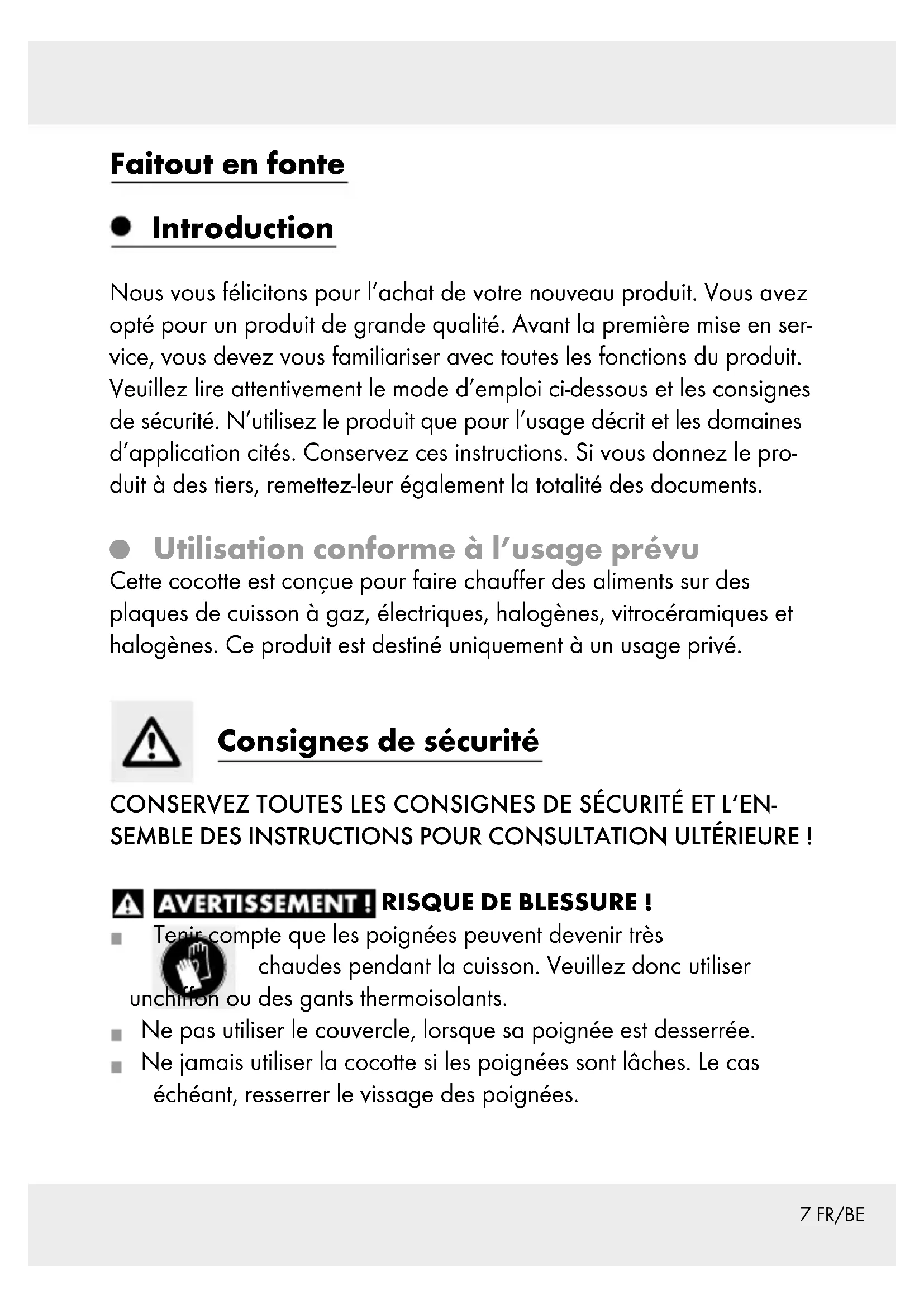 Utilisation conforme à l’usage prévu Cette cocotte est conçue pour faire chauffer des aliments sur des plaques de cuisson à gaz, électriques, halogènes, vitrocéramiques et halogènes. Ce produit est destiné uniquement à un usage privé. Consignes de sécurité CONSERVEZ TOUTES LES CONSIGNES DE SÉCURITÉ ET L‘EN- SEMBLE DES INSTRUCTIONS POUR CONSULTATION ULTÉRIEURE ! RISQUE DE BLESSURE ! Tenir compte que les poignées peuvent devenir très chaudes pendant la cuisson. Veuillez donc utiliser unchiffon ou des gants thermoisolants. Ne pas utiliser le couvercle, lorsque sa poignée est desserrée. Ne jamais utiliser la cocotte si les poignées sont lâches. Le cas échéant, resserrer le vissage des poignées.8 FR/BE RISQUE DE DÉGÂTS MATÉRIELS ! Il est important, lors de la cuisson, de ne pas quitter des yeux les casseroles et poêles dans lesquelles on fait chauffer des graisses. La graisse peut chauffer et s’enflammer rapidement. Si la graisse s’enflamme, ne jamais tenter de l’éteindre avec de l’eau ! Étouffez les flammes avec un couvercle ou une couverture en laine épaisse. Afin de ne pas endommager le revêtement antiadhésif, utiliser uni- quement des ustensiles de cuisine en plastique résistant à la cha- leur ou en bois. Ne pas couper les aliments cuits directement dans la casserole. Ne mettez pas de viande ruisselante dans de la graisse chaude. Les projections de graisse sur la plaque de cuisinière chaude peuvent aisément causer un incendie. Choisissez une zone de cuisson équivalente au diamètre de contact de la cocotte pour éviter des pertes de chaleur. Cet article peut s‘utiliser afin de conserver au chaud des mets dans un four (max. 150 °C pendant 1 heure). Des températures élevées peuvent entraîner une décoloration de l‘extérieur du produit. Cette caractéristique n‘est pas un défaut du matériau et ne nuit pas à la qualité ou à la fonctionnalité du produit. Ne tenez jamais l‘appareil chaud sous de l‘eau courante froide. Le dessous du produit pourrait être endommagé, ou bien se déta- cher de sa surface. Le produit peut se nettoyer au lave-vaisselle. Le nettoyage fréquent avec des nettoyants agressifs peut entraîner un endommagement et / ou une décoloration de la cocotte. Le nettoyage dans le lave-vaisselle peut décolorer les pièces en aluminium. ATTENTION ! Le couvercle en verre peut se briser / est non résis- tant aux chocs !9 FR/BE Lors du lavage à la main, nettoyez la cocotte à l’eau très chaude avec un produit vaisselle courant. Proscrire l’utilisation de tout ob- jet coupant et pointu afin de ne pas endommager le matériel. Ne pas traîner ou pousser le produit sur une plaque vitrocéramique ou halogène. Si vous ne respectez pas ces instructions, vous ris- quez de rayer vos plaques. Lors de l‘utilisation du produit, veuillez noter que de légères déco- lorations peuvent apparaître à sa surface, en raison de sa couleur claire. Ces décolorations sont à considérer comme des marques d‘utilisation, et n‘influencent d‘aucune manière la qualité du revê- tement et d‘utilisation du produit.