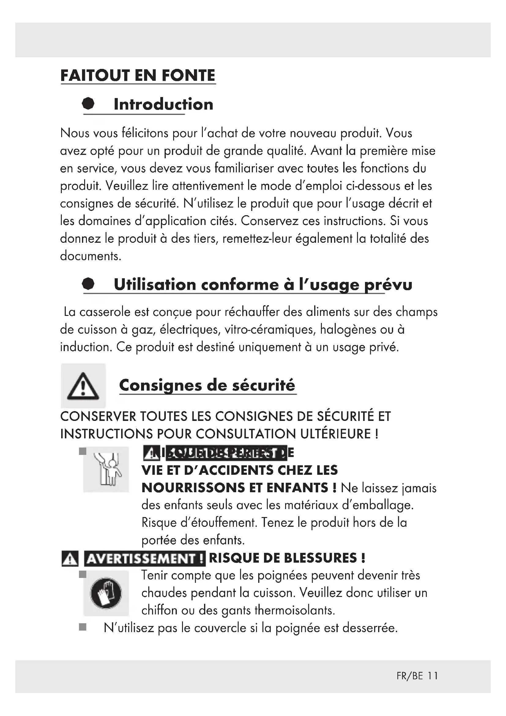 § Introduction Nous vous félicitons pour l’achat de votre nouveau produit. Vous avez opté pour un produit de grande qualité. Avant la première mise en service, vous devez vous familiariser avec toutes les fonctions du produit. Veuillez lire attentivement le mode d’emploi ci-dessous et les consignes de sécurité. N’utilisez le produit que pour l’usage décrit et les domaines d’application cités. Conservez ces instructions. Si vous donnez le produit à des tiers, remettez-leur également la totalité des documents. § Utilisation conforme à l’usage prévu La casserole est conçue pour réchauffer des aliments sur des champs de cuisson à gaz, électriques, vitro-céramiques, halogènes ou à induction. Ce produit est destiné uniquement à un usage privé. Consignes de sécurité CONSERVER TOUTES LES CONSIGNES DE SÉCURITÉ ET INSTRUCTIONS POUR CONSULTATION ULTÉRIEURE !