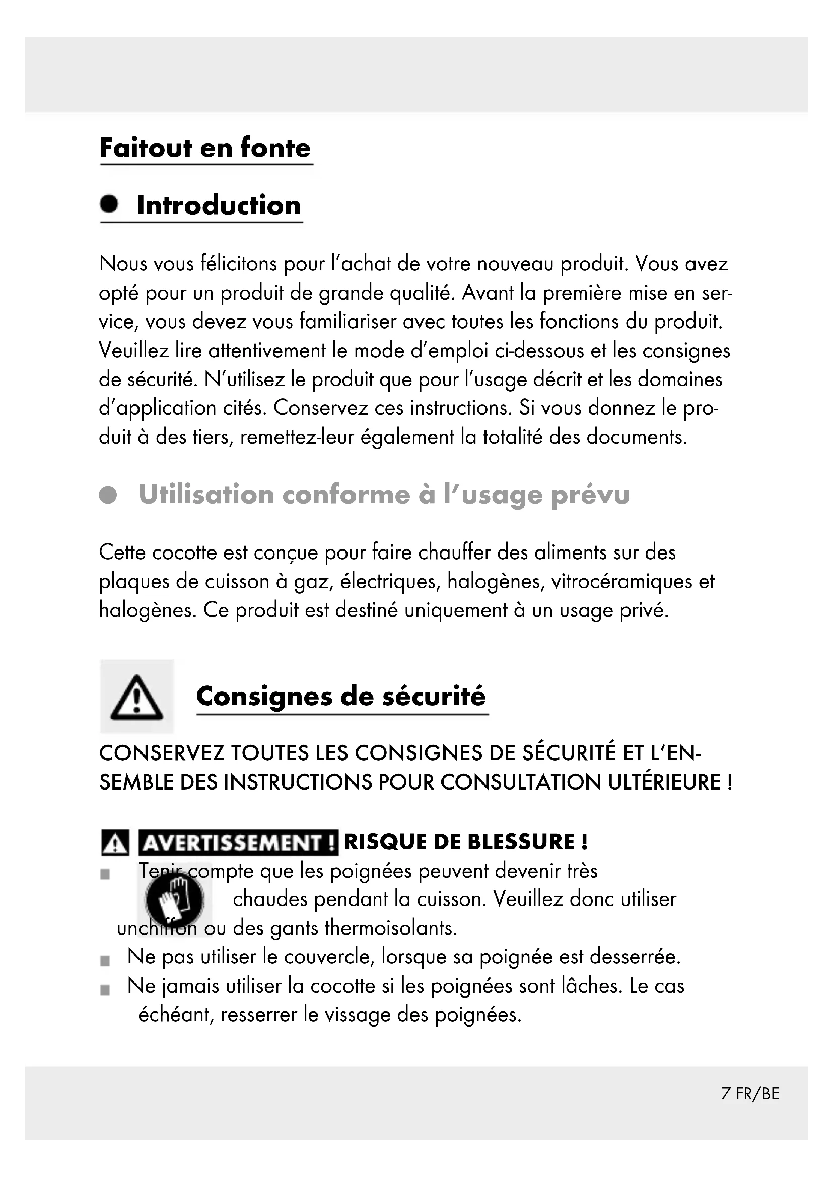 Utilisation conforme à l’usage prévu Cette cocotte est conçue pour faire chauffer des aliments sur des plaques de cuisson à gaz, électriques, halogènes, vitrocéramiques et halogènes. Ce produit est destiné uniquement à un usage privé. Consignes de sécurité CONSERVEZ TOUTES LES CONSIGNES DE SÉCURITÉ ET L‘EN- SEMBLE DES INSTRUCTIONS POUR CONSULTATION ULTÉRIEURE ! RISQUE DE BLESSURE ! Tenir compte que les poignées peuvent devenir très chaudes pendant la cuisson. Veuillez donc utiliser unchiffon ou des gants thermoisolants. Ne pas utiliser le couvercle, lorsque sa poignée est desserrée. Ne jamais utiliser la cocotte si les poignées sont lâches. Le cas échéant, resserrer le vissage des poignées.8 FR/BE RISQUE DE DÉGÂTS MATÉRIELS ! Il est important, lors de la cuisson, de ne pas quitter des yeux les casseroles et poêles dans lesquelles on fait chauffer des graisses. La graisse peut chauffer et s’enflammer rapidement. Si la graisse s’enflamme, ne jamais tenter de l’éteindre avec de l’eau ! Étouffez les flammes avec un couvercle ou une couverture en laine épaisse. Afin de ne pas endommager le revêtement antiadhésif, utiliser uni- quement des ustensiles de cuisine en plastique résistant à la cha- leur ou en bois. Ne pas couper les aliments cuits directement dans la casserole. Ne mettez pas de viande ruisselante dans de la graisse chaude. Les projections de graisse sur la plaque de cuisinière chaude peuvent aisément causer un incendie. Choisissez une zone de cuisson équivalente au diamètre de contact de la cocotte pour éviter des pertes de chaleur. Cet article peut s‘utiliser afin de conserver au chaud des mets dans un four (max. 150 °C pendant 1 heure). Des températures élevées peuvent entraîner une décoloration de l‘extérieur du produit. Cette caractéristique n‘est pas un défaut du matériau et ne nuit pas à la qualité ou à la fonctionnalité du pro- duit. Ne tenez jamais l‘appareil chaud sous de l‘eau courante froide. Le dessous du produit pourrait être endommagé, ou bien se déta- cher de sa surface. Le produit peut se nettoyer au lave-vaisselle. Le nettoyage fréquent avec des nettoyants agressifs peut entraîner un endommagement et / ou une décoloration de la cocotte. Le nettoyage dans le lave-vaisselle peut décolorer les pièces en aluminium. ATTENTION ! Le couvercle en verre peut se briser / est non résis- tant aux chocs !9 FR/BE Lors du lavage à la main, nettoyez la cocotte à l’eau très chaude avec un produit vaisselle courant. Proscrire l’utilisation de tout ob- jet coupant et pointu afin de ne pas endommager le matériel. Ne pas traîner ou pousser le produit sur une plaque vitrocéramique ou halogène. Si vous ne respectez pas ces instructions, vous ris- quez de rayer vos plaques. Lors de l‘utilisation du produit, veuillez noter que de légères déco- lorations peuvent apparaître à sa surface, en raison de sa couleur claire. Ces décolorations sont à considérer comme des marques d‘utilisation, et n‘influencent d‘aucune manière la qualité du revê- tement et d‘utilisation du produit.