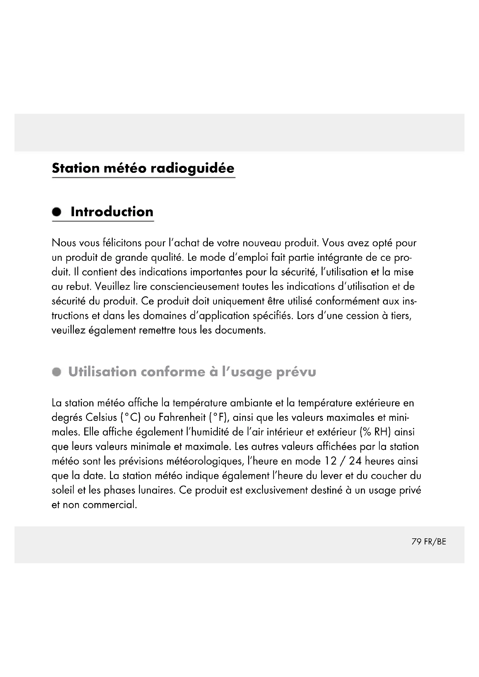 Boîtier à piles Données techniques Station météo: Plage de température: 0 à +50 °C +32 à +122 °F Résolution température: 0,1 °C Plage de mesure humidité de l’air : 20 - 95 % Précision humidité de l’air : 1 % Signal radio: DCF Pile: 3 x AA, 1,5 V (courant continu) Plage de pression atmosphérique : 850–1050 hPa Plage de fréquence : 433.050 MHz à 434.790 MHz82 FR/BE Capteur extérieur: Plage de température: -20 à +65 °C -4 à +149 °F Plage de mesure Humidité de l’air : 20–95 % Précision Humidité de l’air : 1 % Signal de transmission HF: 433 MHz Amplitude de transmission HF: max. 30 mètres (en extérieur) Pile: 2 x AA, 1,5 V (courant continu) Indice de protection : IPX4 (protégée contre les projections d‘eau) Plage de fréquence : 433.050 MHz à 434.790 MHz Puissance max. transférée : 433.999 MHz, <10 dBm Fourniture 1 station météo 1 capteur extérieur 3 piles, AA, 1,5 V (pré-installé) 2 piles, AA, 1,5 V (pré-installé) 1 mode d’emploi83 FR/BE Sécurité Lisez toutes les consignes de sécurité et instructions! Tout manquement aux consignes de sécurité et instructions peut causer une électrocution, un incendie et de graves blessures. CONSERVEZ TOUTES LES CONSIGNES DE SÉCURITÉ ET INSTRUCTIONS POUR CONSULTATION ULTÉRIEURE! Instructions générales de sécurité Les enfants sous-estiment souvent les dangers. Tenez toujours les enfants à l’écart du produit. Ce produit peut être utilisé par des enfants âgés de 8 ans et plus ainsi que par des personnes ayant des capacités physiques, sensorielles ou mentales réduites ou manquant d‘expérience ou de connaissances, s‘ils sont surveillés ou s‘ils ont été informés de l‘utilisation sûre du produit et comprennent les risques liés à son utilisation. Les enfants ne doivent pas jouer avec le produit. Le nettoyage et l‘entretien du produit ne doivent pas être effectués par des enfants laissés sans surveillance. Ne pas faire fonctionner le produit s’il est endommagé.84 FR/BE Consignes de sécurité relatives aux piles / aux piles rechargeables DANGER DE MORT! Rangez les piles / piles rechargeables hors de la portée des enfants. En cas d’ingestion, consultez immédiatement un médecin ! RISQUE D‘EXPLOSION ! Ne rechargez jamais des piles non rechargeables. Ne court-circuitez pas les piles / piles rechargeables et / ou ne les ouvrez pas ! Autrement, vous risquez de provoquer une surchauffe, un incendie ou une explosion. Ne jetez jamais des piles / piles rechargeables au feu ou dans l’eau. Ne pas soumettre les piles / piles rechargeables à une charge mécanique. Risque de fuite des piles / piles rechargeables Évitez d’exposer les piles / piles rechargeables à des conditions et températures extrêmes susceptibles de les endommager, par ex. sur des radiateurs / exposition directe aux rayons du soleil. Lorsque les piles / piles rechargeables fuient, évitez tout contact du produit chimique avec la peau, les yeux ou les muqueuses! Rincez les zones touchées à l‘eau claire et consultez immédiatement un médecin ! PORTER DES GANTS DE PROTECTION! Les piles / piles re- chargeables endommagées ou sujettes à des fuites peuvent provo- quer des brûlures au contact de la peau. Vous devez donc porter des gants adéquats pour les manipuler.85 FR/BE En cas de fuite des piles / piles rechargeables, retirez-les aussitôt du produit pour éviter tout endommagement. Utilisez uniquement des piles / piles rechargeables du même type. Ne mélangez pas des piles / piles rechargeables usées et neuves ! Retirez les piles / piles rechargeables, si vous ne comptez pas utiliser le produit pendant une période prolongée. Risque d‘endommagement du produit Exclusivement utiliser le type de pile / pile rechargeable spécifié. Insérez les piles / piles rechargeables conformément à l‘indication de polarité (+) et (-) indiquée sur la pile / pile rechargeable et sur le produit. Nettoyez les contacts de la pile / pile rechargeable et du compartiment à pile avant d‘insérer la pile ! Retirez immédiatement les piles / piles rechargeables usées du produit. Avant la mise en service Installation des appareils Insérez les piles pour commencer dans le capteur extérieur, ensuite dans la station météo.86 FR/BE PRUDENCE! Lors du choix du lieu d’installation de l’appareil, assurez-vous que les appareils ne sont pas exposés aux rayons directs du soleil, à des vibrations, à la poussière, à la chaleur, au froid et à l’humidité. N’installez pas les appareils à proximité de sources de chaleur, par ex. de radiateurs. Risque d’endommagement des appareils dans le cas contraire. Ne posez pas les appareils sur des surfaces de valeur ou fragiles sans une protection appropriée. Ces surfaces pourraient être endommagées. Assurez-vous que des appareils proches ne fonctionnent pas sur la même fré- quence de 433MHz. Ces appareils pourraient causer un dysfonctionnement de la transmission radio. N’installez pas les appareils à côté de plaques métalliques ou sur des plaques métalliques. Ceci pourrait réduire la transmission radio entre les appareils. N’installez pas les appareils dans des bâtiments en béton armé, par ex. aéro- ports, grands bâtiments, usines ou caves. La transmission radio entre les appareils peut être fortement remise en cause. Mise en service du capteur extérieur Retirez le couvercle du boîtier à piles sur la face arrière de la sonde extérieure. Retirez la bande de sécurité des piles. Le capteur extérieur est alors prêt à l’emploi et le voyant à LED