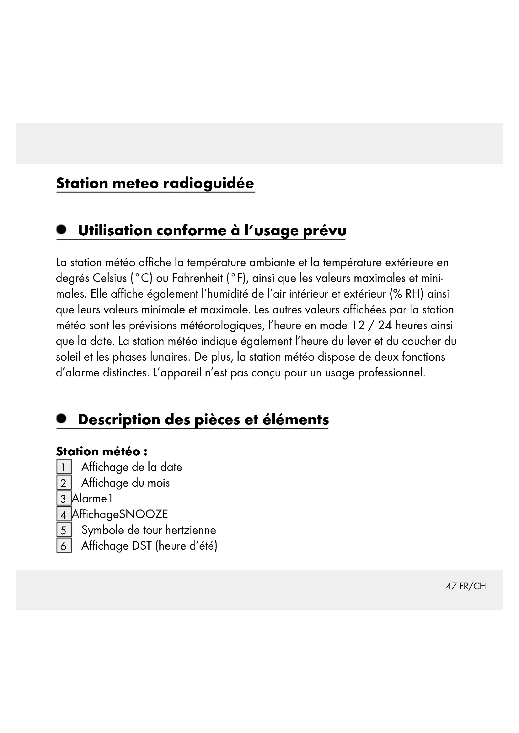 Utilisation conforme à l’usage prévu ...............................Page 47 Description des pièces et éléments .....................................Page 47 Données techniques ........................................................................Page 49 Fourniture ................................................................................................Page 51 Sécurité Instructions générales de sécurité ...............................................................Page 51 Indications de sécurité des piles..................................................................Page 52 Avant la mise en service Installation des appareils .............................................................................Page 53 Mise en service du capteur extérieur ..........................................................Page 54 Mise en service de la station météo ...........................................................Page 55 Utilisation Réception du signal radio DCF ................................................................... Page 57 Réglage manuel du mode 12 / 24h / °C / °F / hPa / inHg / du fuseau horaire / de l’heure / de la date / de la langue..............................Page 59 Régler l’heure du réveil ................................................................................Page 61 Activation / désactivation de la fonction réveil ..........................................Page 62 Désactivation de l’alarme ............................................................................Page 62 Fonction SNOOZE ......................................................................................Page 63 Mise en service de la prévision météorologique .......................................Page 63 Sélection du site ...........................................................................................Page 6546 FR/CH Sélection manuelle du site ........................................................................... Page 66 Phases lunaires ............................................................................................. Page 70 Consultation de la pression atmosphérique des dernières 12heures ......Page 70 Réglage de l‘affichage de la pression atmosphérique ..............................Page 71 Réglage du canal .........................................................................................Page 72 Affichage de la température et de la tendance de température ..............Page 73 Affichage de l’humidité de l’air et de la tendance de l’humidité de l’air.....Page 74 Affichage de la température / l’humidité de l’air maximale / minimale ....Page 74 Alarme de température et de gel ................................................................Page 75 Activation / désactivation de l’alarme de température et de gel .............. Page 76 Rétroéclairage .............................................................................................. Page 76 Affichage de l’usure des piles .....................................................................Page 77 Remplacement des piles ..............................................................................Page 77 Dépannage ............................................................................................. Page 78 Nettoyage et entretien .................................................................Page 79 Recyclage ................................................................................................. Page 79 Garantie .................................................................................................... Page 80 Informations Déclaration de conformité ...........................................................................Page 8247 FR/CH Station meteo radioguidée Utilisation conforme à l’usage prévu La station météo affiche la température ambiante et la température extérieure en degrés Celsius (°C) ou Fahrenheit (°F), ainsi que les valeurs maximales et mini- males. Elle affiche également l’humidité de l’air intérieur et extérieur (% RH) ainsi que leurs valeurs minimale et maximale. Les autres valeurs affichées par la station météo sont les prévisions météorologiques, l’heure en mode 12 / 24heures ainsi que la date. La station météo indique également l’heure du lever et du coucher du soleil et les phases lunaires. De plus, la station météo dispose de deux fonctions d’alarme distinctes. L’appareil n’est pas conçu pour un usage professionnel. Description des pièces et éléments Station météo: