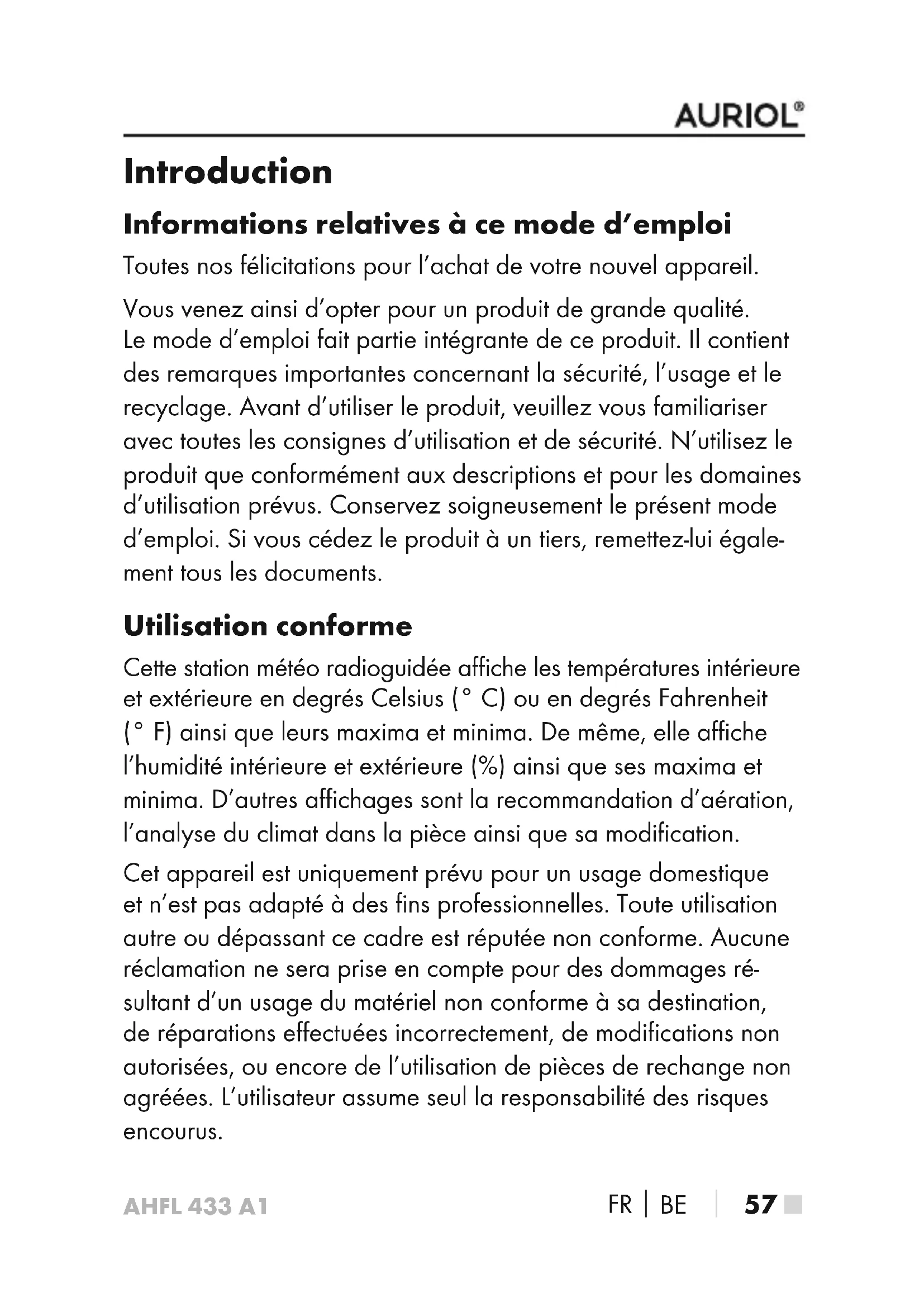 57 ■ Introduction Informations relatives à ce mode d’emploi Toutes nos félicitations pour l’achat de votre nouvel appareil. Vous venez ainsi d’opter pour un produit de grande qualité. Le mode d’emploi fait partie intégrante de ce produit. Il contient des remarques importantes concernant la sécurité, l’usage et le recyclage. Avant d’utiliser le produit, veuillez vous familiariser avec toutes les consignes d’utilisation et de sécurité. N’utilisez le produit que conformément aux descriptions et pour les domaines d’utilisation prévus. Conservez soigneusement le présent mode d’emploi. Si vous cédez le produit à un tiers, remettez-lui égale- ment tous les documents. Utilisation conforme Cette station météo radioguidée affiche les températures intérieure et extérieure en degrés Celsius (° C) ou en degrés Fahrenheit (° F) ainsi que leurs maxima et minima. De même, elle affiche l’humidité intérieure et extérieure (%) ainsi que ses maxima et minima. D’autres affichages sont la recommandation d’aération, l’analyse du climat dans la pièce ainsi que sa modification. Cet appareil est uniquement prévu pour un usage domestique et n’est pas adapté à des fins professionnelles. Toute utilisation autre ou dépassant ce cadre est réputée non conforme. Aucune réclamation ne sera prise en compte pour des dommages ré- sultant d’un usage du matériel non conforme à sa destination, de réparations effectuées incorrectement, de modifications non autorisées, ou encore de l’utilisation de pièces de rechange non agréées. L’utilisateur assume seul la responsabilité des risques encourus.AHFL 433 A1 ■ 58
