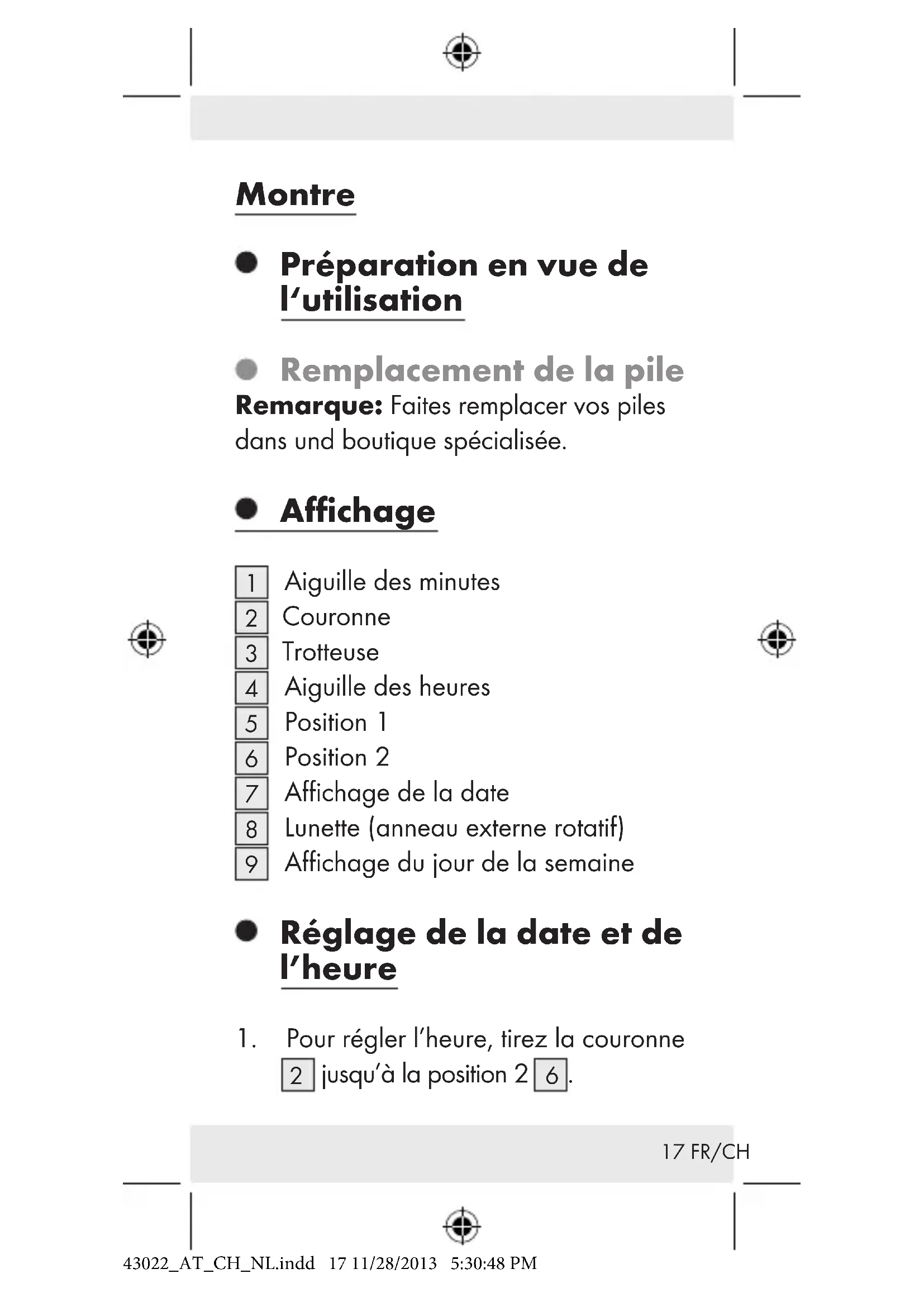 GARANTIE L’appareil a été fabriqué selon des critères de qualité stricts et contrôlé consciencieusement avant sa livraison. En 43022_AT_CH_NL.indd 23 11/28/2013 5:30:48 PM24 FR/CH cas de défaillance, vous êtes en droit de retourner ce produit au vendeur. La présente garantie ne constitue pas une restriction de vos droits légaux. Cet appareil bénéficie d‘une garantie de 3 ans à compter de sa date d’achat. La durée de garantie débute à la date d’achat. Veuillez conserver le ticket de caisse original. Il fera office de preuve d’achat. Si un problème matériel ou de fabrication devait survenir dans les trois ans suivant la date d‘achat de ce produit, nous assurons à notre discrétion la réparation ou le remplacement de l‘appareil sans frais supplémentaires. La garantie prend fin si le produit est endommagé suite à une utilisation inappropriée ou à un entretien défaillant. La garantie couvre les vices matériels et de fabrication. Cette garantie ne s‘étend pas aux pièces du produit soumises à une usure normale et qui, par 43022_AT_CH_NL.indd 24 11/28/2013 5:30:48 PM25 FR/CH conséquent, peuvent être considérées comme des pièces d‘usure, ni aux dommages sur des composants fragiles, comme des interrupteurs, des batteries et des éléments fabriqués en verre. La garantie ne couvre pas non plus la perte de l‘étanchéité à l‘eau. L‘état d‘étanchéité à l‘eau n‘est pas une propriété durable et fait l‘objet d‘une maintenance périodique. Veuillez noter que votre garantie devient caduque pour les cas suivants: ouverture et la réparation de votre montre par des personnes non autorisées. 43022_AT_CH_NL.indd 25 11/28/2013 5:30:49 PM26 IT/CH Orologio da polso