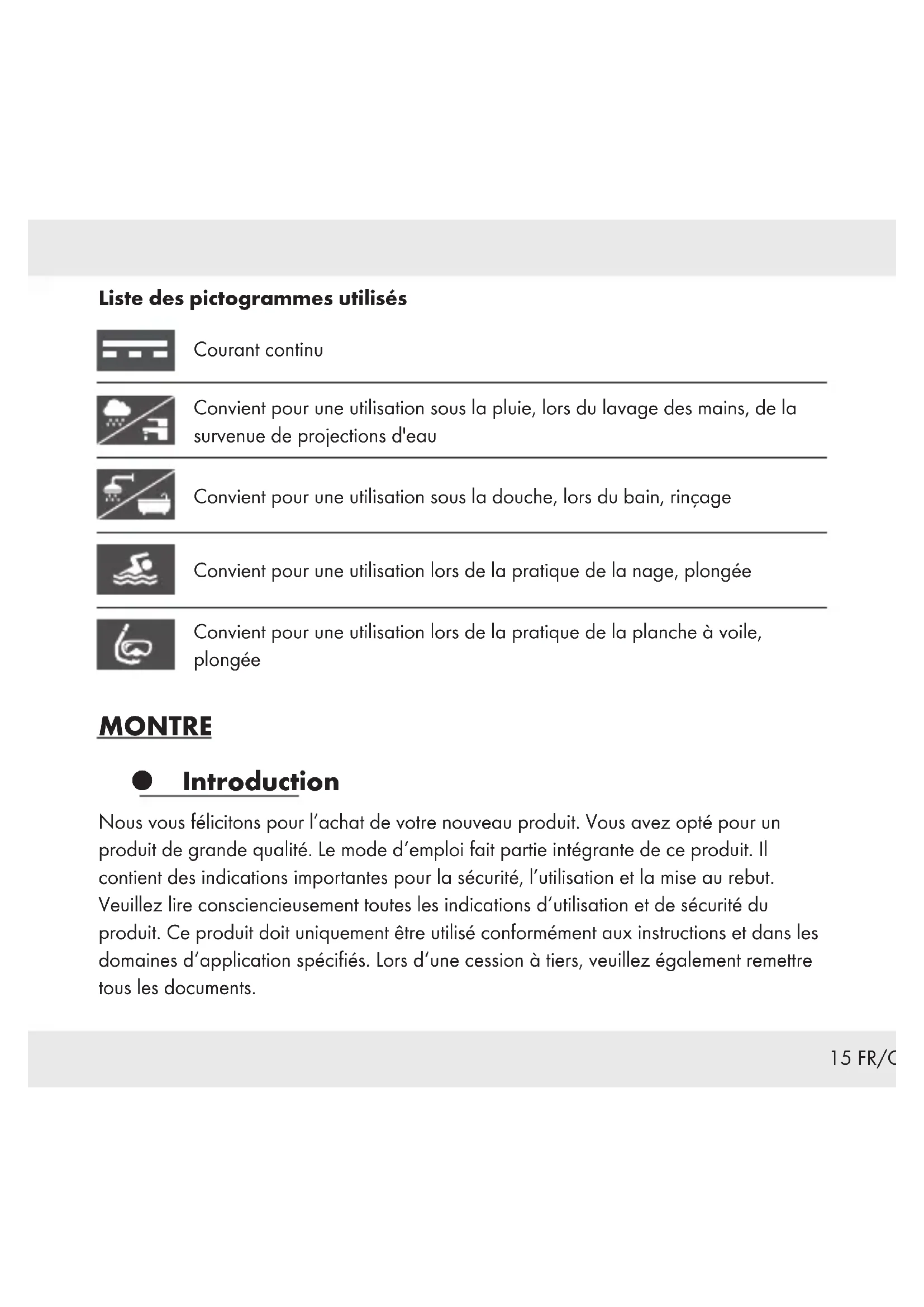 . La nouvelle goupille est installée.20 FR/CH Nettoyage et entretien Nettoyez uniquement l’extérieur du produit à l’aide d’un chiffon non pelucheux, propre et légèrement humide. Rincez si besoin le produit sous l’eau courante. Séchez-le bien après le rinçage. Mise au rebut L’emballage est entièrement constitué de matériaux recyclables, que vous pouvez mettre au rebut dans le centre de recyclage de votre localité. Veuillez respecter l‘identification des matériaux d‘emballage pour le tri sélectif, ils sont identifiés avec des abbréviations (a) et des chiffres (b) ayant la signification suivante: 1–7: plastiques/ 20–22: papiers et cartons/ 80–98: matériaux composite. Le produit et les matériaux d‘emballage sont recyclables, mettez-les au rebut séparément pour un meilleur traitement des déchets. Le logo Triman n‘est valable qu‘en France. Votre mairie ou votre municipalité vous renseigneront sur les possibilités de mise au rebut des produits usagés. Afin de contribuer à la protection de l‘environnement, veuillez ne pas jeter votre produit usagé dans les ordures ménagères, mais éliminez-le de manière appropriée. Pour obtenir des renseignements concernant les points de collecte et leurs horaires d’ouverture, vous pouvez contacter votre municipalité.21 FR/CH Les piles/ piles rechargeables défectueuses ou usagées doivent être recyclées conformément à la directive 2006/66/CE et ses modifications. Veuillez ramener les piles/ piles rechargeables et/ ou le produit aux points de collecte disponibles. Pollution de l’environnement résultant de la mise au rebut incorrecte des piles/ piles rechargeables! Les piles/ piles rechargeables ne doivent pas être mises au rebut avec les ordures ménagères. Elles peuvent contenir des métaux lourds toxiques et doivent être considérés comme des déchets spéciaux. Les symboles chimiques des métaux lourds sont les suivants :Cd=cadmium, Hg=mercure, Pb=plomb. Pour cette raison, veuillez toujours mettre au rebut les piles/ piles rechargeables usagées dans les points de collecte de votre localité.22 FR/CH Garantie Le produit a été fabriqué selon des critères de qualité stricts et contrôlé consciencieusement avant sa livraison. En cas de défaillance, vous êtes en droit de retourner ce produit au vendeur. La présente garantie ne constitue pas une restriction de vos droits légaux. Ce produit bénéficie d‘une garantie de 3ans à compter de sa date d’achat. La durée de garantie débute à la date d’achat. Veuillez conserver le ticket de caisse original. Il fera office de preuve d’achat. Si un problème matériel ou de fabrication devait survenir dans 3ans suivant la date d‘achat de ce produit, nous assurons à notre discrétion la réparation ou le remplacement du produit sans frais supplémentaires. La garantie prend fin si le produit est endommagé suite à une utilisation inappropriée ou à un entretien défaillant. La garantie couvre les vices matériels et de fabrication. Cette garantie ne s’étend ni aux pièces du produit soumises à une usure normale (p.ex. des piles) et qui, par conséquent, peuvent être considérées comme des pièces d’usure, ni aux dommages sur des composants fragiles, comme des interrupteurs, des batteries ou des éléments fabriqués en verre. La garantie ne couvre pas non plus la perte de l‘étanchéité à l‘eau. L‘état d‘étanchéité à l‘eau n‘est pas une propriété durable et fait l‘objet d‘une maintenance périodique. Veuillez noter que votre garantie devient caduque pour les cas suivants: ouverture et la réparation de votre montre par des personnes non autorisées.23 IT/CH Elenco delle icone utilizzate .................................Pagina 24 Introduzione ...............................................Pagina 24 Utilizzo secondo la destinazione d’uso .........................Pagina 25 Descrizione componenti.....................................Pagina 25 Dati tecnici .................................................Pagina 25 Contenuto della confezione .................................Pagina 26 Prima dell’uso ..............................................Pagina 26 Sostituzione della batteria ...................................Pagina 26 Impostazione dell’ora ......................................Pagina 26 Impermeabilità .............................................Pagina 27 Regolazione del cinturino (HG03962A) ......................Pagina 27 Regolazione del cinturino (HG03962D) .....................Pagina 27 Come rimuovere i segmenti ..................................Pagina 28 Sostituzione del perno all’interno del cursore (Fig. E, F, G) ..........Pagina 28 Pulizia e manutenzione .....................................Pagina 29 Smaltimento................................................Pagina 29 Garanzia...................................................Pagina 3124 IT/CH Elenco delle icone utilizzate Corrente continua Adatto all'uso in caso di pioggia, quando ci si lavano le mani, in caso di spruzzi d'acqua Adatto all'uso nella doccia, in caso di lavaggi, bagni Adatto all'uso per nuoto, snorkeling Adatto all'uso per windsurf, immersioni