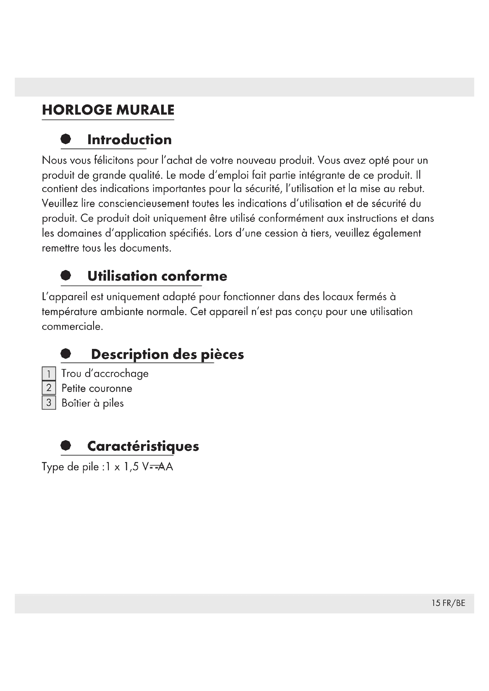 DANGER DE MORT ! es piles peuvent être avalées, ce qui peut être mortel. En cas d’ingurgitation d’une pile, il faut immédiatement consulter un médecin. Ne mettez pas l‘appareil en service s‘il est endommagé. Les réparations doivent être confiées uniquement à du personnel spécialisé.17 FR/BE Consignes de sécurité relatives à la batterie DANGER DE MORT ! Les piles doivent être tenues hors de portée des enfants. En cas d’ingestion accidentelle, contactez l’assistance médicale d’urgence. ATTENTION ! DANGER D’EXPLOSION ! Ne rechargez jamais des piles non rechargeables, et ne courtcircuitez pas et/ou n’ouvrez pas les piles. Ne jetez jamais les piles dans l’eau ou dans le feu. N’exercez pas de charges mécaniques sur les piles. Risque de fuite de la batterie En cas de fuite de la batterie, retirez-la immédiatement de l’appareil afin de prévenir tout dommage. Évitez tout contact avec la peau, les yeux et les muqueuses. En cas de contact avec l’acide de la batterie, rincez abondamment la zone touchée avec de l’eau propre et contactez l’assistance médicale d’urgence. Évitez les conditions et températures extrêmes qui peuvent avoir un impact sur les piles, p. ex. radiateurs, lumière directe du soleil. Retirez la batterie de l’appareil si vous ne comptez pas l’utiliser pendant une période prolongée. Risque de dommages matériels Utilisez uniquement le type de batterie recommandé ! Lorsque vous insérez la batterie, respectez les polarités ! Si nécessaire, nettoyez la batterie et les contacts de l’appareil avant d’insérer la batterie. Une batterie déchargée doit être retirée de l’appareil rapidement.18 FR/BE § Mise en service Enlever l’isolation entre la pile et le contact. Veuillez vous reporter à la fig. B en ce qui concerne le remplacement de la pile. § Utilisation Réglage de l’heure Pour régler l’heure, faites tourner la petite couronne