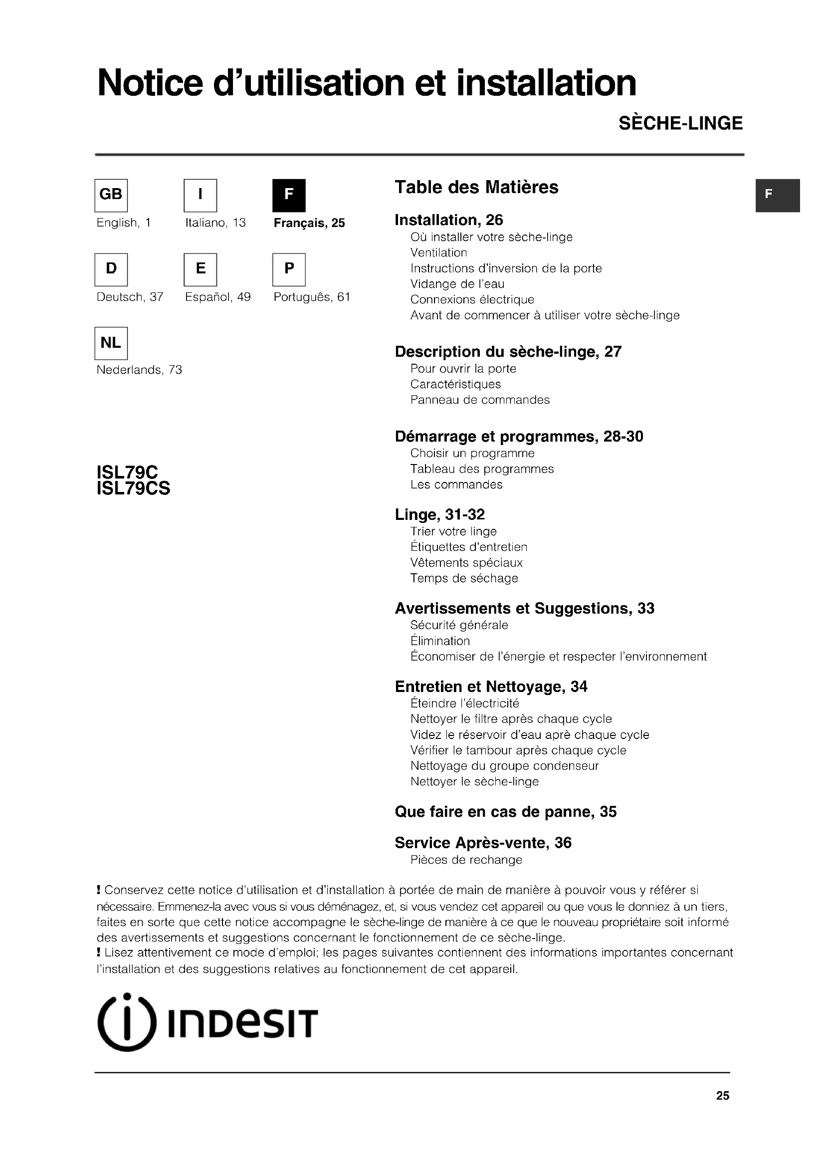 ISL 79 CS (EX) - Seche linge INDESIT - Notice d'utilisation et mode d'emploi gratuit