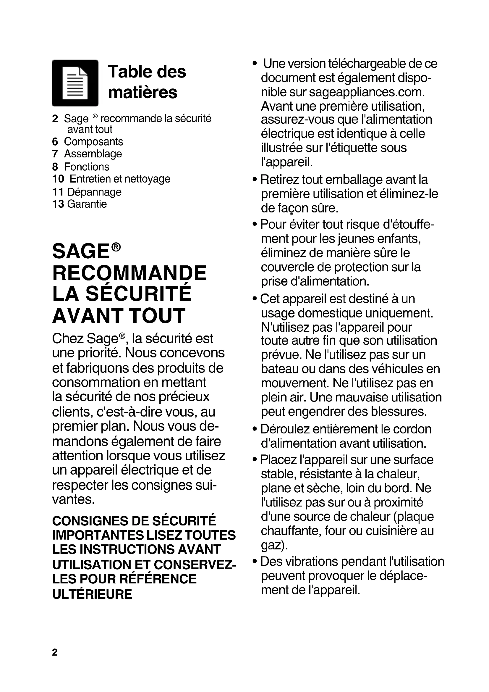 Cold Plus2 Table des matières 2 Sage recommande la sécurité avant tout6 Composants7 Assemblage8 Fonctions10 Entretien et nettoyage11 Dépannage13 Garantie SAGE