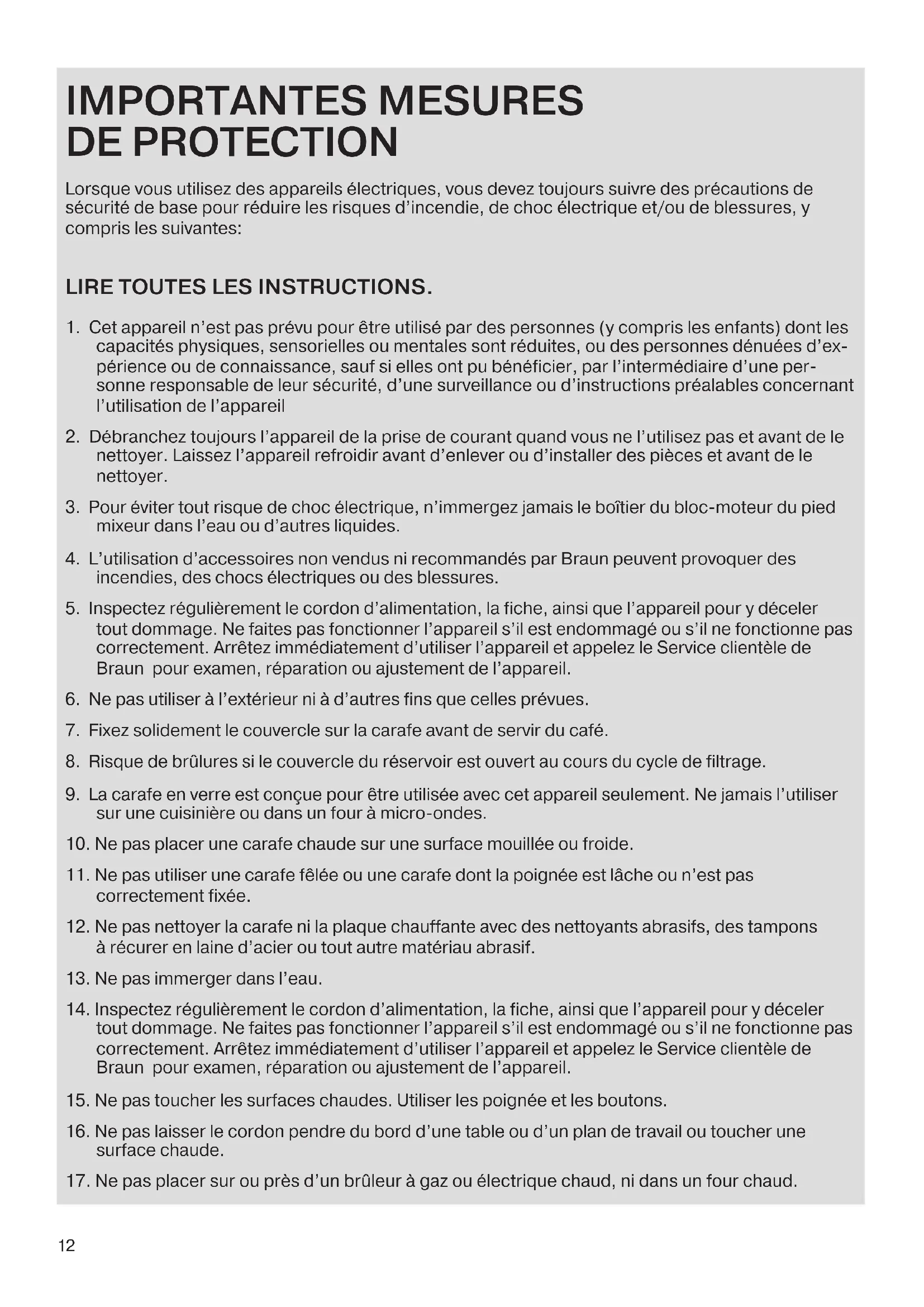 INSTRUCTIONS RELATIVES AU CORDON D’ALIMENTATION SPÉCIAL Un cordon d’alimentation court est fourni avec l’appareil pour réduire les risques d’enchevêtrement ou de trébuchement que présente un cordon d’alimentation plus long. Des cordons d’alimentation détachables plus longs ou des rallonges ne sont pas recommandés mais peuvent être utilisés avec prudence. Si un cordon d’alimentation plus long est utilisé : (1) le calibre électrique indiqué sur le cordon plus long ou la rallonge doit être au moins aussi élevé que le calibre électrique de l’appareil, (2) le cordon doit être disposé de sorte qu’il ne pende pas du comptoir ou de la table, où des enfants peuvent le tirer ou trébucher dessus par inadvertance. 1321021IBR_KF 7150_7170_USCA_S6-28.indd 13 27.10.15 13:1114 Français Nos produits sont conçus de manière à répondre aux normes les plus exigeantes en matière de qualité, de fonctionnalité et de design. Nous espérons que le nouvel appareil Braun vous apportera pleinement satisfaction. Avant utilisation Lisez le mode d’emploi attentivement et en entier avant d’utiliser cet appareil. Description des Parties et Accesoires 1 Bouton ON/OFF 2 Écran à LED et horloge 3 Réservoir à eau avec indicateur de niveau d’eau (à l’intérieur) 4 Panier de filtre avec système anti-gouttes 5 Filtre permanent doré 6 Couvercle du réservoir et douchette 7 Filtre à charbon pour eau 8 Support de filtre à charbon pour eau 9 Sole chauffante 10 Logement du cordon 11 Carafe en verre 12 Couvercle rabattable (carafe en verre) 13 Cuillère de dosage du café Capacité d’eau maximale : 12 tasses (60 fl. oz.) Panel de control LED a. BREW Sert à démarrer les cycles d’infusion et de maintien au chaud b. AUTO ON Sert à programmer le début du cycle d’infusion. L’heure du démarrage automatique peut être réglée n’importe quand, de jour comme de nuit. « PM » s’affiche sur l’écran LCD en cas de programmation nocturne. c. AUTO OFF Sert à programmer le délai d’arrêt de la cafetière. d. CLOCK Affiche l’heure et permet de régler l’heure pour les fonctions automatiques (démarrage et arrêt automatiques). e. SET Sert à programmer l’heure, le démarrage automatique, l’arrêt automatique et le niveau de dureté de l’eau. f. CLEAN Sert à activer le mode détartrage et régler le niveau de dureté de l’eau. g. 1-4 Sert à préparer de plus petites quantités de café (jusqu’à 4 tasses). h. STRENGTH Sert à sélectionner l’intensité du café (« regular », normale ou « bold », forte).