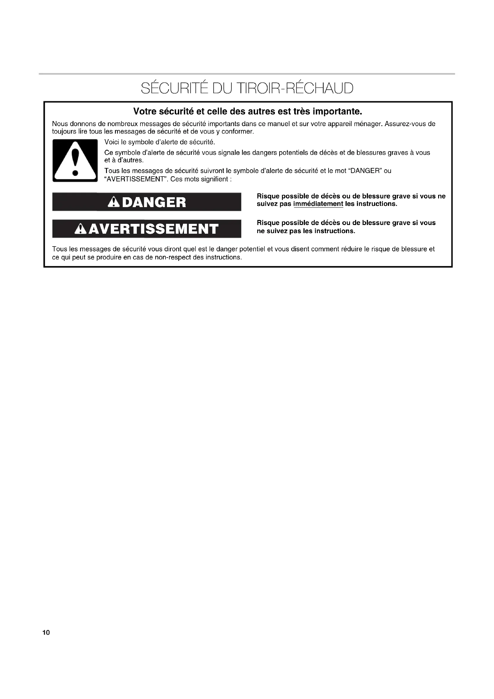 Pour réduire le risque d'incendie, de choc électrique, de blessures ou de dommages lors de l'utilisation du tiroir-réchaud, il convient d'observer certaines précautions élémentaires dont les suivantes :Lire toutes les instructions.Installation appropriée – S'assurer que le tiroir-réchaud est correctement installé et relié à la terre par un technicien qualifié.Ne jamais utiliser le tiroir-réchaud pour réchauffer ou chauffer la pièce.Ne pas laisser les enfants seuls – Les enfants ne doivent pas être laissés seuls ou sans surveillance dans la pièce où le tiroir-réchaud est en service. Ne jamais laisser les enfants s'asseoir ou se tenir sur une partie quelconque du tiroir-réchaud.Porter des vêtements appropriés – Des vêtements amples ne doivent jamais être portés pendant l'utilisation du tiroir-réchaud.Entretien par l'utilisateur – Ne pas réparer ni remplacer toute pièce du tiroir-réchaud si ce n'est pas spécifiquement recommandé dans le manuel. Toute autre opération d'entretien ou de réparation doit être confiée à un technicien qualifié.Remisage dans le tiroir-réchaud – Les matériaux inflammables ne doivent pas être remisés dans le tiroir-réchaud.Ne pas utiliser d'eau pour éteindre un feu de graisse – Étouffer le feu ou les flammes ou utiliser un extincteur à produits chimiques secs, ou un extincteur à mousse.N'utiliser que des mitaines sèches – Des mitaines mouillées ou humides sur des surfaces chaudes peuvent provoquer des brûlures provenant de la vapeur. Ne pas laisser les mitaines toucher les éléments chauffants. Ne pas utiliser une serviette ou un autre chiffon épais.Ouvrir la porte du tiroir avec soin – Laisser l'air chaud ou la vapeur s'échapper avant d'enlever ou de replacer les aliments.Ne pas chauffer des contenants d'aliments non ouverts – L'accumulation de pression peut faire exploser le contenant et causer des blessures.Positionnement des grilles du tiroir-réchaud – Toujours placer la grille du tiroir-réchaud à l'endroit voulu lorsque le tiroir-réchaud est froid. Si la grille doit être déplacée pendant que le tiroir-réchaud est chaud, ne pas laisser les mitaines toucher l'élément chaud de chauffage dans le tiroir-réchaud.NE PAS TOUCHER LES ÉLÉMENTS DE CHAUFFAGE OU LES SURFACES INTÉRIEURES DU TIROIR-RÉCHAUD – Les éléments chauffants peuvent être chauds même lorsqu'ils ont une teinte foncée. Les surfaces intérieures du tiroir-réchaud deviennent assez chaudes pour causer des brûlures. Pendant et après l'utilisation, ne pas toucher les éléments de chauffage ou ne pas laisser les vêtements ou autres matériaux inflammables venir en contact avec les éléments chauffants ou les surfaces intérieures du tiroir-réchaud avant qu'ils aient suffisamment refroidi. D'autres surfaces du tiroir-réchaud peuvent devenir assez chaudes pour causer des brûlures – ces surfaces comprennent les ouvertures de l'évent et du tiroir-réchaud, les surfaces près de ces ouvertures et la porte du tiroir-réchaud.Ne pas toucher les surfaces chaudes. Utiliser les poignées ou boutons.Ne pas faire fonctionner un appareil dont le cordon ou la prise est endommagé(e), lorsque l’appareil ne fonctionne pas correctement ou lorsqu’il a été endommagé d’une quelconque façon. Retourner l’appareil au centre de service agréé le plus proche pour examen, réparation ou réglage.L’utilisation d’accessoires de fixation non recommandés par le fabricant du tiroir-réchaud peut causer des blessures.Ne pas utiliser le tiroir-réchaud pour une utilisation autre que celle pour laquelle il a été conçu.Pour réduire le risque de choc électrique, ne pas monter l’appareil au-dessus d’un évier. Ce produit est conçu pour un usage domestique uniquement.