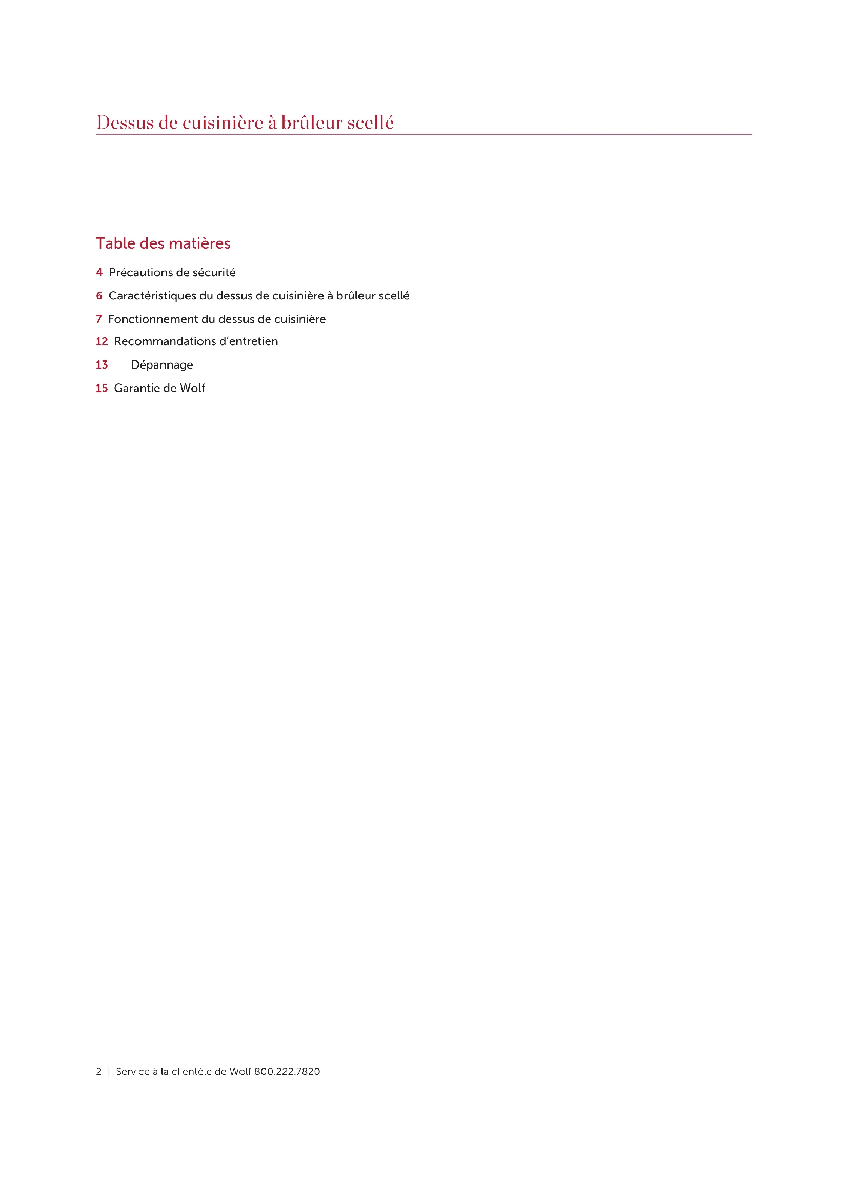 Numéro de modèle Numéro de série Date de l’installation Nom du service certifié Numéro du service certifié Dépositaire autorisé Numéro du dépositaire Si votre produit a besoin d’être réparé, assurez-vous d’utiliser un fournisseur de service certifié par l’usine Wolf recommandé par notre centre de service à la clientèle, ou sélectionnez-en un parmi la liste de fournisseurs dis- ponibles à wolfappliance.com/locator. Tous les fournis- seurs de service certifiés par l’usine sont soigneusement sélectionnés et rigoureusement formés par nous. Dessus de cuisinière à brûleur scellé Remarque importante Pour s’assurer que ce produit est installé et utilisé en toute sécurité et aussi ecacement que possible, prenez note des types de renseignement mis en évidence tout au long de ce guide: REMARQUE IMPORTANTE met en évidence des renseignements qui sont particulièrement importants.