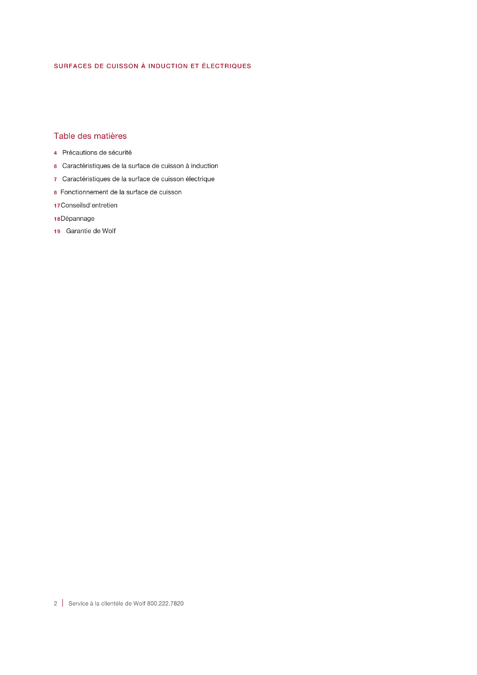 Service à la clientèle de Wolf 800.222.7820 Table des matières 4 Précautions de sécurité6 Caractéristiques de la surface de cuisson à induction7 Caractéristiques de la surface de cuisson électrique8 Fonctionnement de la surface de cuisson17 Conseils d'entretien18 Dépannage19 Garantie de Wolf SURFACES DE CUISSON À INDUCTION ET ÉLECTRIQUESwolfappliance.com