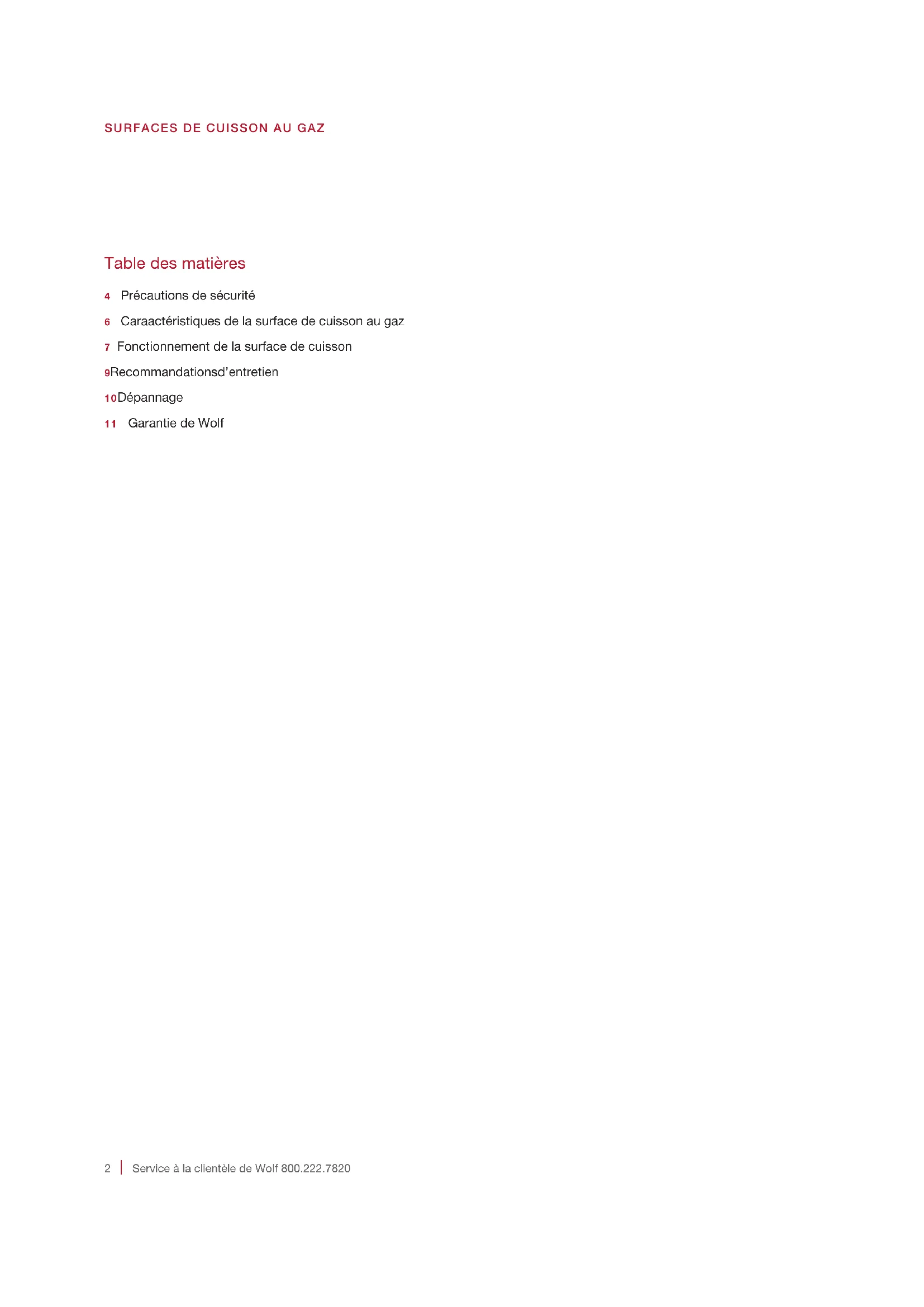 Service à la clientèle de Wolf 800.222.7820 Table des matières 4 Précautions de sécurité6 Caraactéristiques de la surface de cuisson au gaz7 Fonctionnement de la surface de cuisson9 Recommandations d’entretien10 Dépannage11 Garantie de Wolf SURFACES DE CUISSON AU GAZwolfappliance.com