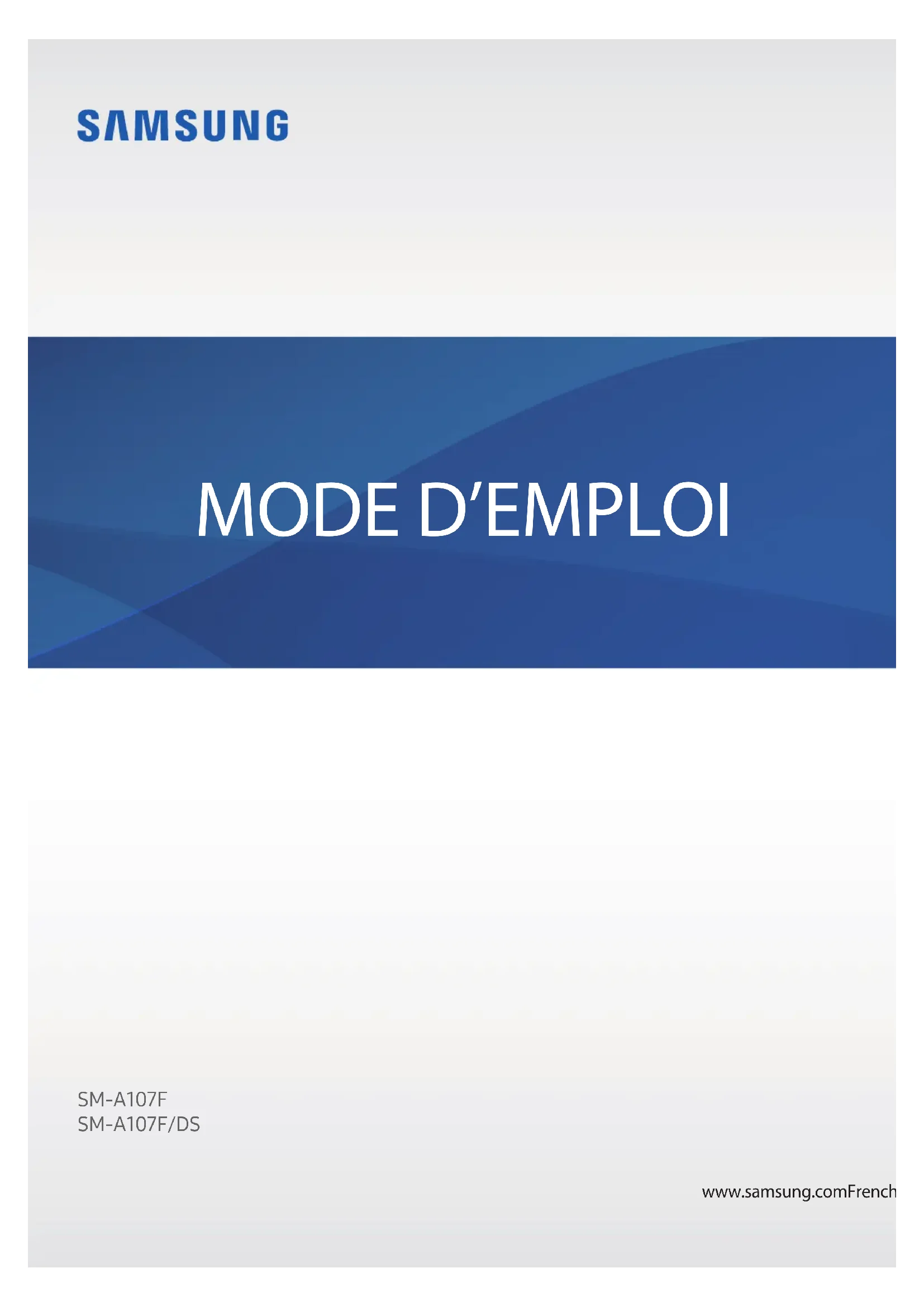 SM-A107F SM-A107F/DS2 Table des matières Fonctions de base 4 À lire avant utilisation 6 Situations de surchauffe de l’appareil et solutions 9 Présentation de l’appareil et de ses fonctions 13 Batterie 15 Carte SIM ou USIM (carte nano-SIM) 17 Carte mémoire (carte micro-SD) 19 Allumer et éteindre l’appareil 21 Configuration initiale 22 Compte Samsung 23 Transférer des données depuis votre ancien appareil (Smart Switch) 24 Description de l’écran 36 Volet des raccourcis 38 Saisir du texte Applications et fonctions 40 Installer ou désinstaller des applications 42 Téléphone 46 Contacts 50 Messages 53 Internet 55 Email 56 Appareil photo 64 Galerie 68 Multi-fenêtres 69 Samsung Members 69 Samsung Notes 70 Calendrier 72 Enregistreur vocal 73 Mes fichiers 73 Horloge 75 Calculatrice 75 Partager du contenu 76 Applications GoogleTable des matières