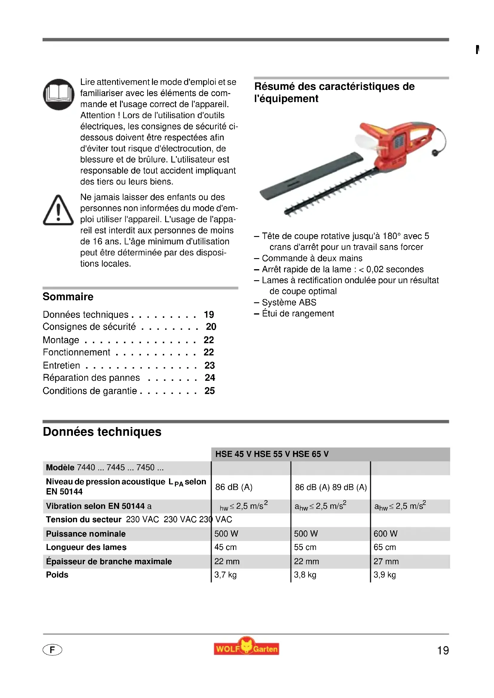 - Résumé des caractéristiques de l'équipement – Tête de coupe rotative jusqu'à 180° avec 5 crans d'arrêt pour un travail sans forcer – Commande à deux mains – Arrêt rapide de la lame : < 0,02 secondes – Lames à rectification ondulée pour un résultat de coupe optimal – Système ABS – Étui de rangement Données techniques Lire attentivement le mode d'emploi et se familiariser avec les éléments de com- mande et l'usage correct de l'appareil. Attention ! Lors de l'utilisation d'outils électriques, les consignes de sécurité ci- dessous doivent être respectées afin d'éviter tout risque d'électrocution, de blessure et de brûlure. L'utilisateur est responsable de tout accident impliquant des tiers ou leurs biens. Ne jamais laisser des enfants ou des personnes non informées du mode d'em- ploi utiliser l'appareil. L'usage de l'appa- reil est interdit aux personnes de moins de 16 ans. L'âge minimum d'utilisation peut être déterminée par des disposi- tions locales. HSE 45 V HSE 55 V HSE 65 VModèle 7440 Niveau de pression acoustique L selon EN 50144 86 dB (A) 86 dB (A) 89 dB (A)Vibration selon EN 50144 a p. 7445